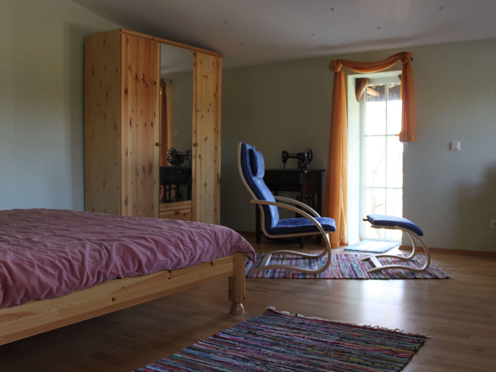 The spacious bedroom is located on the 1st floor with a view of the lake and the pond in the garden.