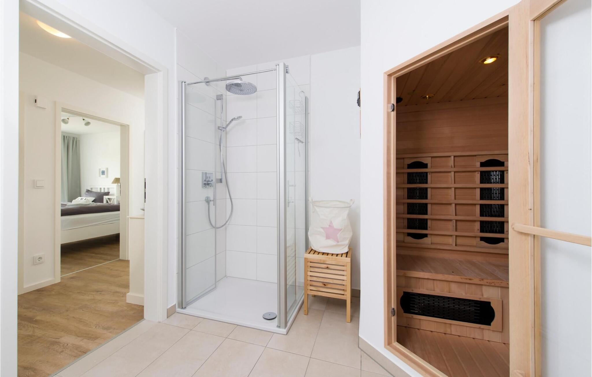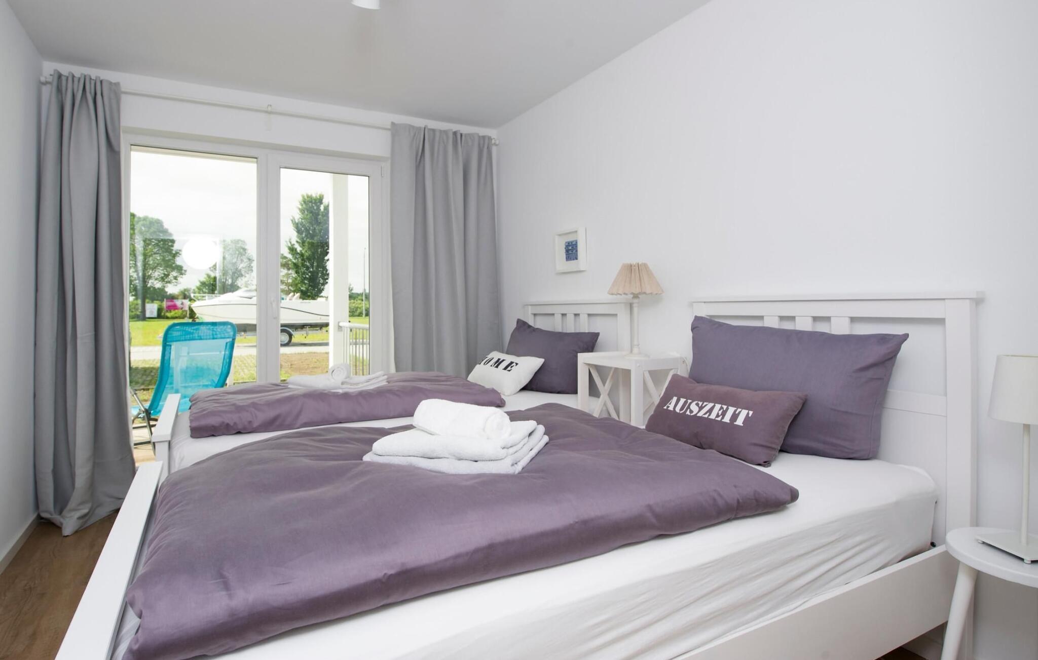 Ferielejligheden Blaue Ferne giver jer virkelig vandrelyst, da beliggenheden, indretningen og faciliteterne lover en ren feriefølelse. Beliggende direkte på Slien, med en uforglemmelig udsigt over Slei-bankens siv, Schleis vidde og forbipasserende sejlskibe, tilbyder dette feriehus, udover to terrasser og dens natur i jordoverfladen, førsteklasses faciliteter med et spabad, walk-in regnbruser og sauna (infrarød kabine). Østersøbrisen og den maritime strandhusstil gør jer simpelthen glad. Ferielejlighedens stue/alrum imponerer med store vinduesfronter, hvorigennem man kan se den direkte tilstødende terrasse og østersøfjorden Slien. Den komfortable sofa med udtræksmulighed og højkvalitets lamelramme giver maksimal komfort. Det fuldt udstyrede køkken lader intet tilbage at ønske. Uanset om det er ved det massive spisebord eller på det komfortable siddeområde i stuen, falder udsigten på Sleiens fænomenale vandpanorama. To soveværelser giver plads til op til fire voksne og støder direkte op til den anden terrasse med sol hele dagen lang. Der er sengevagt i lejligheden for at beskytte de små gæster mod at falde ud. Det fuldt udstyrede store badeværelse gør jeres Østersøferie til en wellnessrejse. I kan slappe af her i spabadet eller saunaen. Regnbruseren på gulvniveau tilbyder ekstra komfort. Parkeringspladsen er direkte foran huset. Foran huset er der et separat skur til cykler. Vores favoritsted: Oplev den blå afstand i umiddelbar nærhed. Ferielejligheden Blaue Ferne er en lejlighed i stueetagen. Bemærk venligst: OstseeResort Olpenitz er meget populært, og der bygges fortsat i parken. Ikke desto mindre kan I se frem til en 5-stjernet standard og et førsteklasses ophold. Byggeaktiviteterne kommer ikke til at forstyrre jer på ferien, og derfor gives der ikke yderligere afslag i prisen.