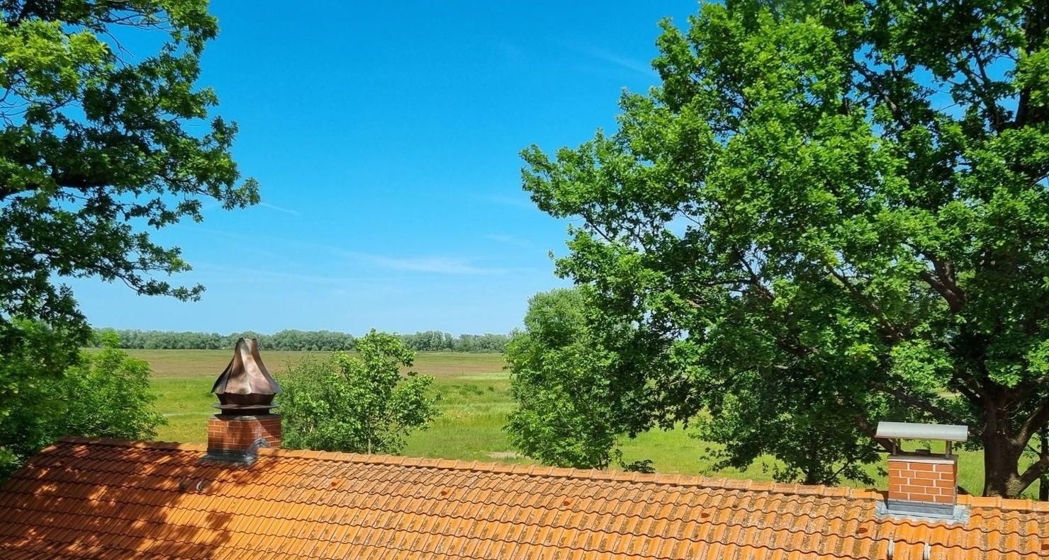 Von allen Zimmern der Ferienwohnung aus können Sie einen freien Blick in den Garten und über das Feld Richtung Elbe genießen.
