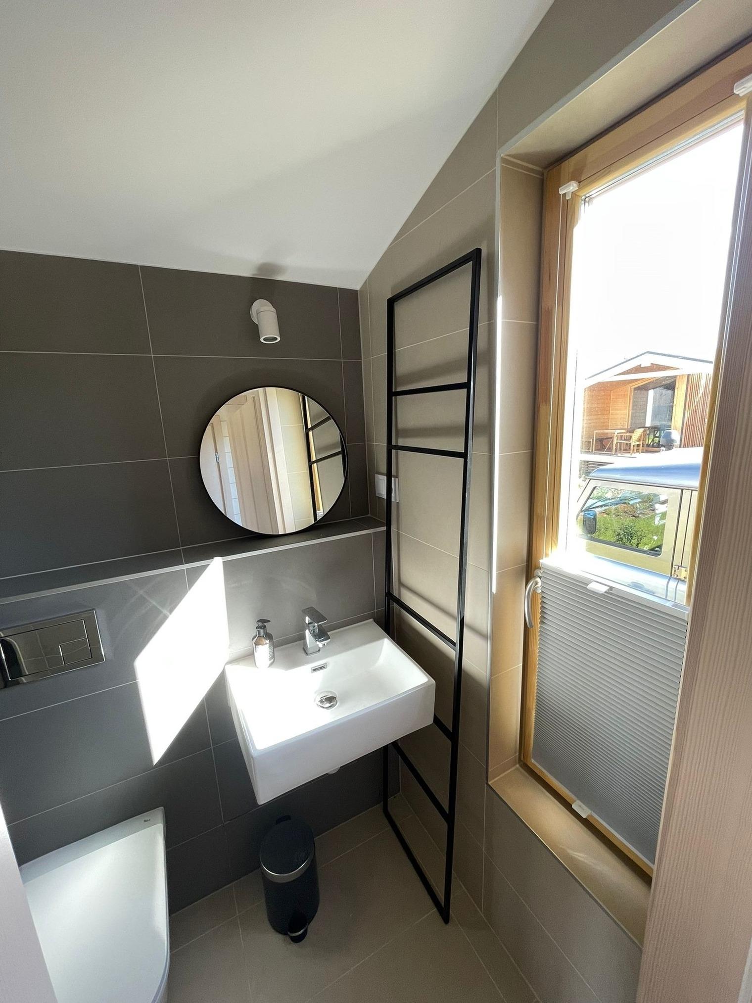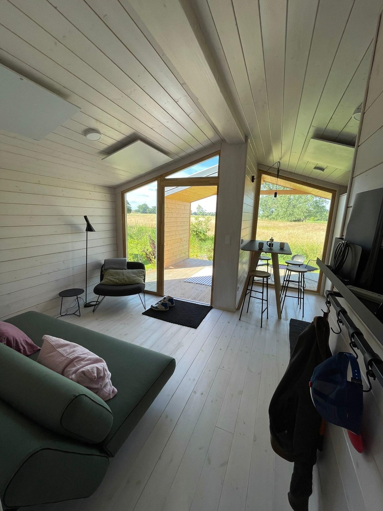 Dieses Tiny House im minimalistischen Design ist hochwertig eingerichtet und läßt keinen Komfort vermissen. Es besteht aus zwei Räumen mit separatem Tageslicht-Bad.