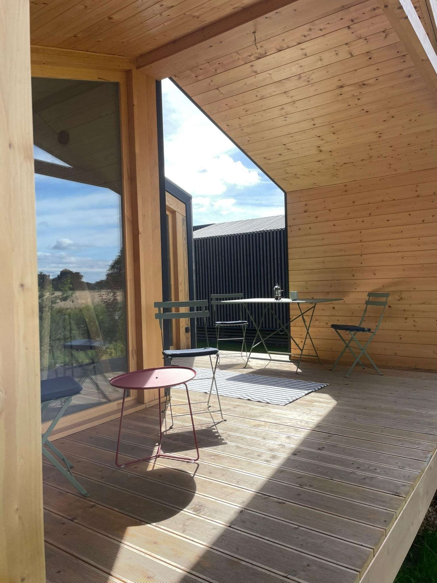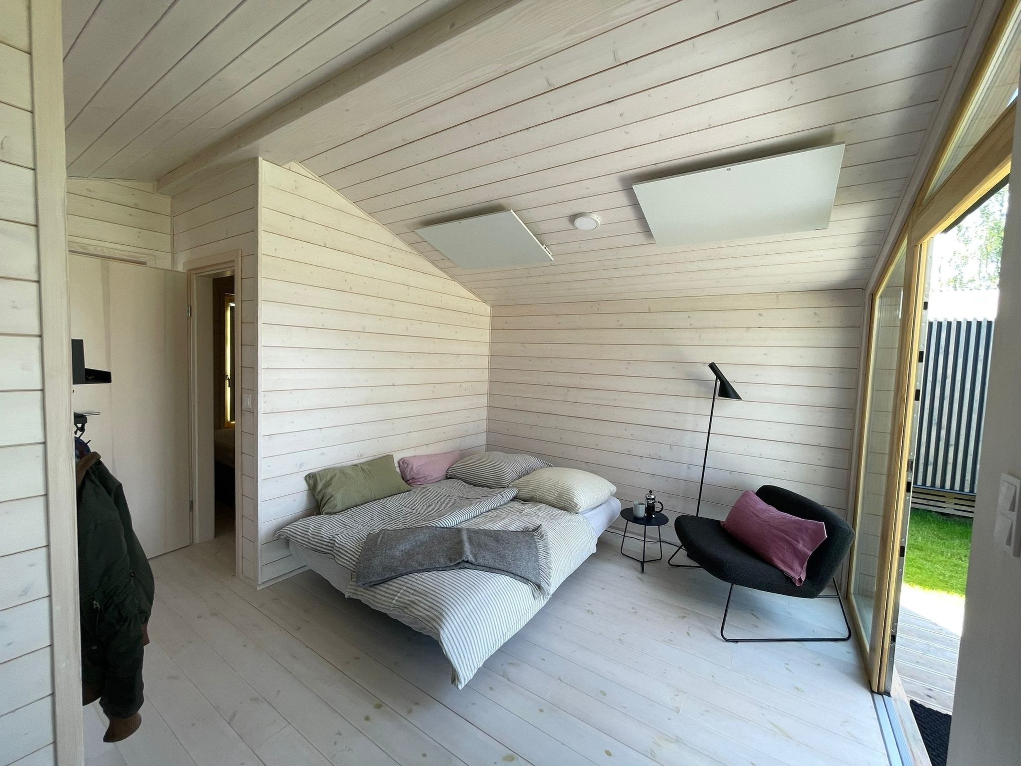 Es verfügt über eine voll ausgestattet Küche inkl. Geschirrspüler und Kombi-Mikrowellenofen, Duschbad mit Regendusche und Fußbodenheizung, einem Wohnraum mit einem herrlichen Blick durch die Panaromafenster in die grüne Natur sowie einer überdachten Holzterrasse mit unverbautem Blick. Im separaten Schlafzimmer befindet sich ein Doppelbett (160 x 200cm) mit viel Stauraum. Auf dem Schlafsofa (140 x 200cm) im Wohnraum können zwei weitere Personen schlafen.