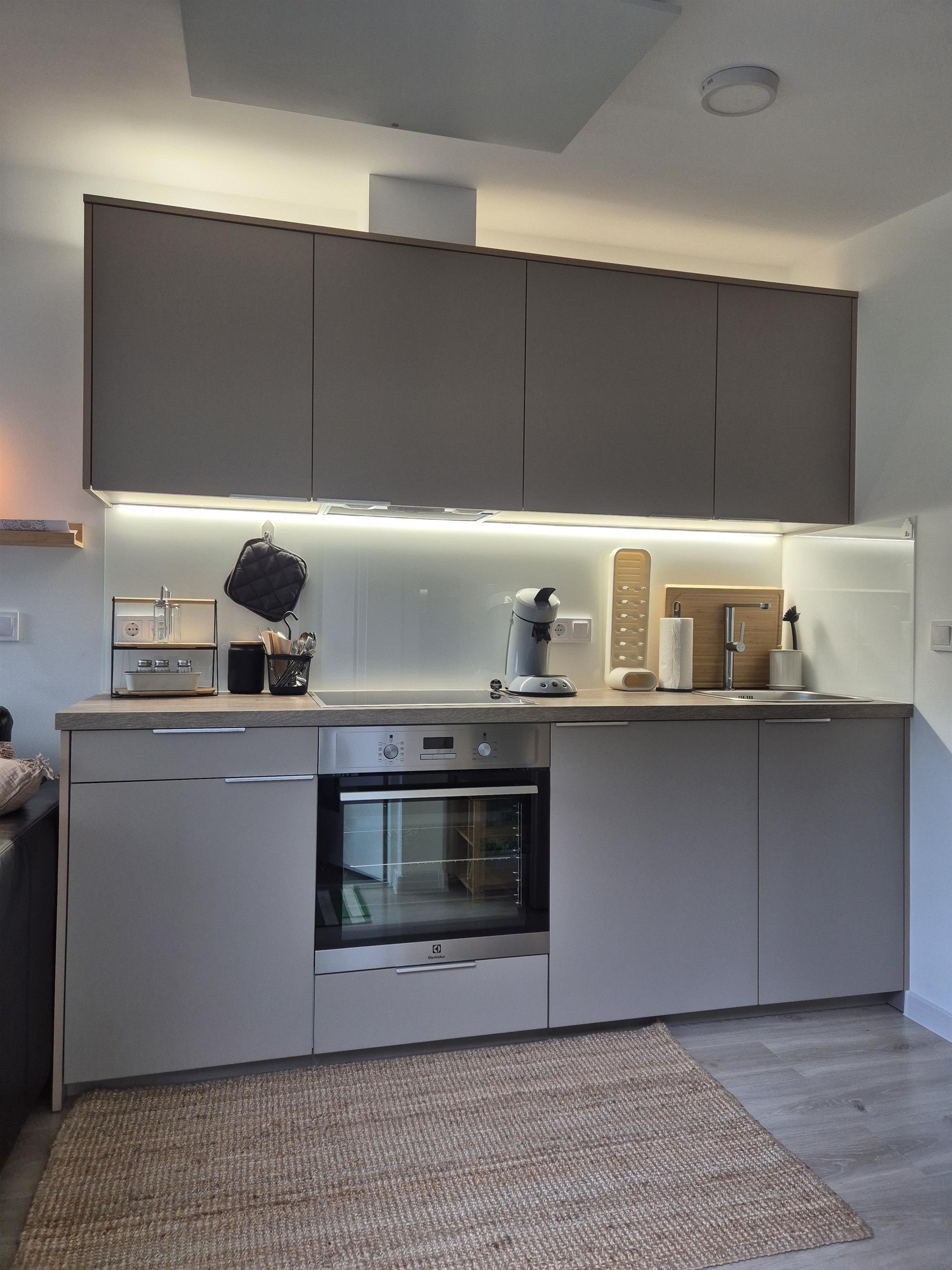 1 große Küche mit Kühlschrank mit Gefrierfach, Backofen, 4-Platten Kochfeld, Senseo-Kaffeemaschine und Toaster