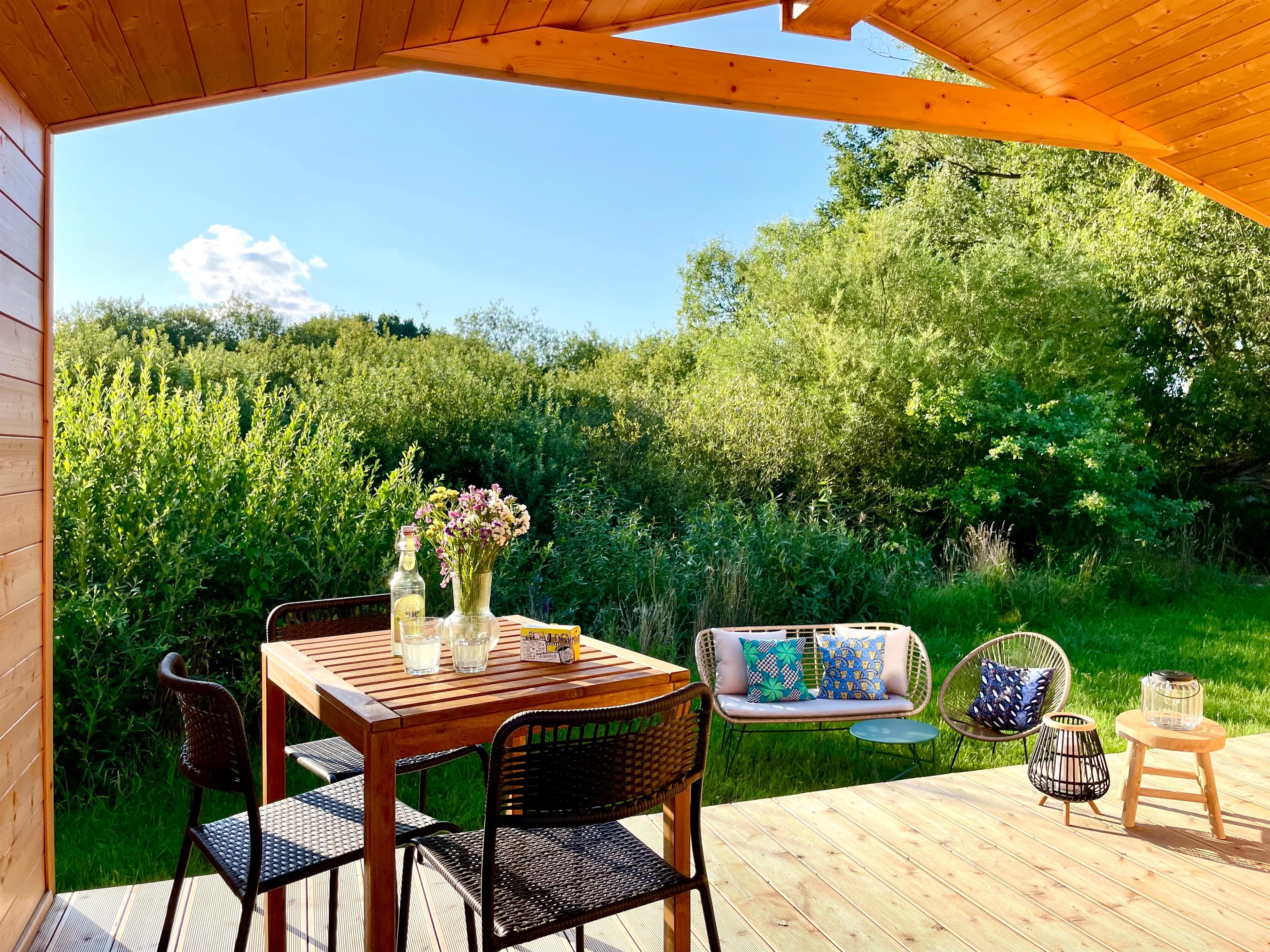 Da das Tiny House über Glasfaser-WLAN und über einen großen Tisch verfügt, bietet es sich auch als Homeoffice-Platz im Grünen an.
