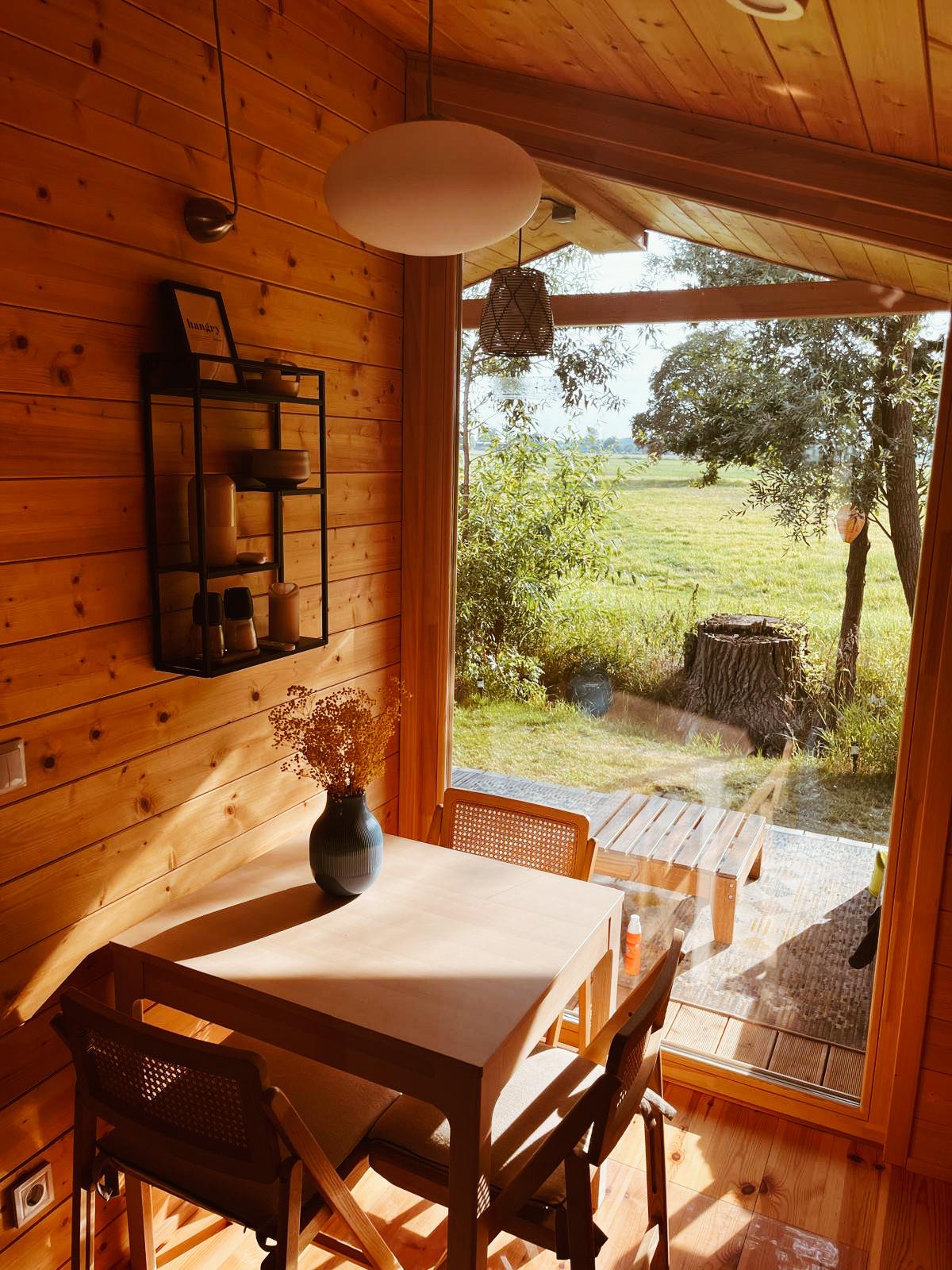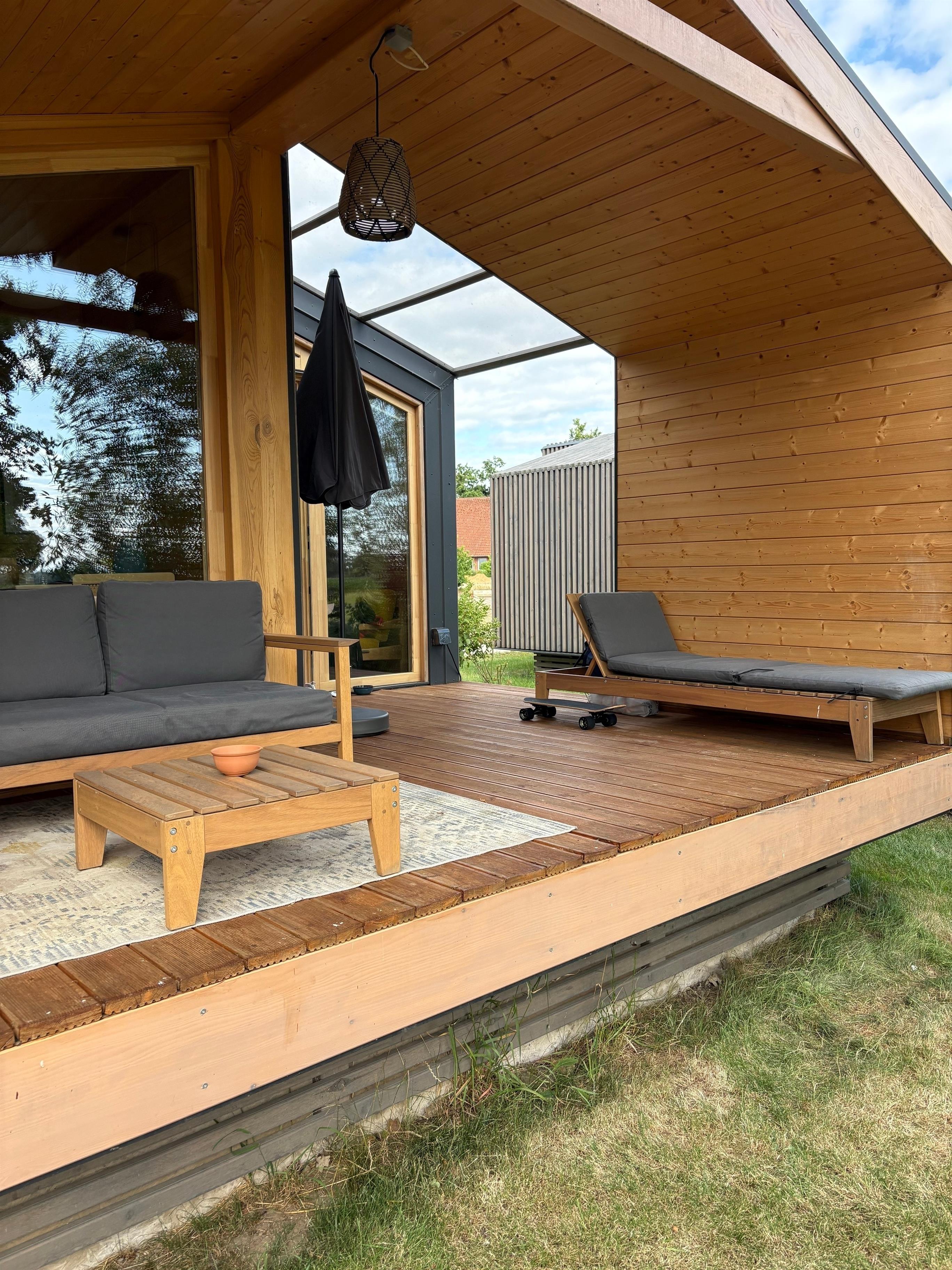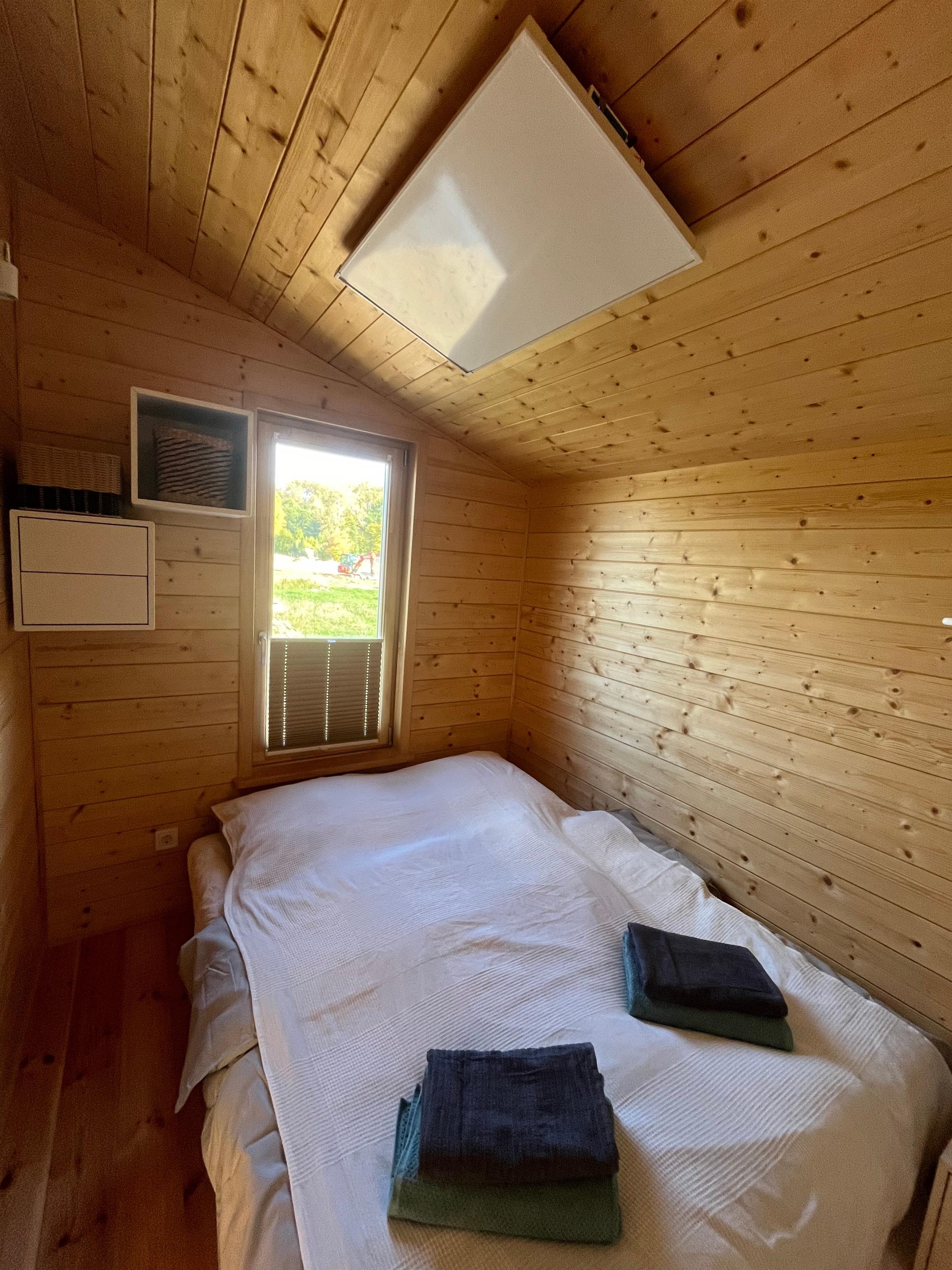 Abends können Sie die Ruhe des eigenen Gartens genießen, umgeben von Natur und mit Blick ins Grüne. Ob Sie den Tag bei einem Glas Wein oder mit einem entspannten Film ausklingen lassen, unser Tiny House bietet Ihnen die perfekte Kulisse für Ihren Urlaub.