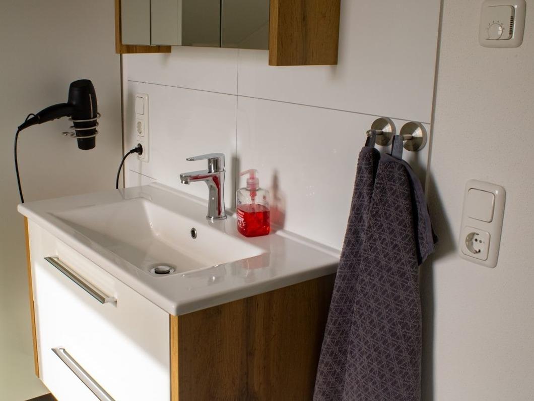 Bad mit bodengleicher Dusche, Fön, Waschmaschine