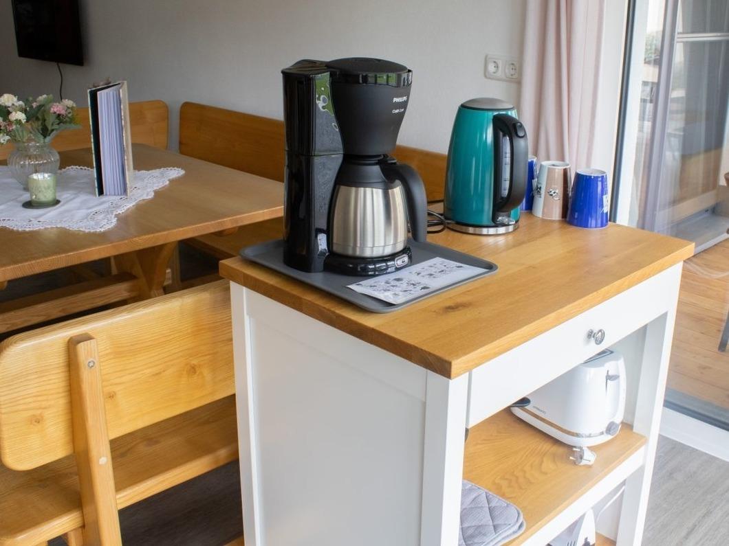 Wohnküche: Kühl- Gefrierkombination, Ceranfeld, Backofen, Spülmaschine, Toaster, Mikrowelle, Wasserkocher, Kaffeemaschine, Senseo Pad-Maschine, Essecke, TV und bequeme Couchgarnitur