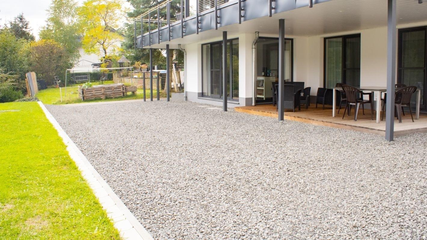 Bodentiefe Fenster in allen Wohnräumen mit direktem Zugang zur überdachten Terrasse mit Esstisch und Lounge