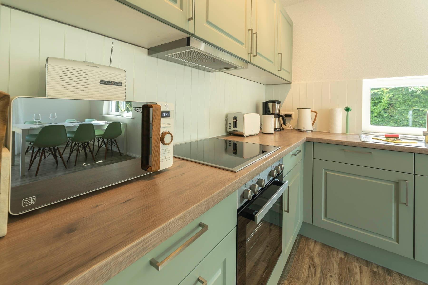 Das Ferienhaus Belvedere 2c besticht durch seine elegante und hochwertige Ausstattung im Schwedenstil. Mit einer Fläche von 95 m² bietet es Platz für bis zu 6 Personen (4 Erwachsene und 2 Kinder). Der helle Wohnbereich verfügt über eine Sofaecke mit zusätzlicher Schlafoption sowie einen Esstisch für bis zu 8 Personen. Die offene Küche ist modern ausgestattet mit einem Ceran-Herd, Backofen, Spülmaschine und Mikrowelle, was viel Bewegungsfreiraum ermöglicht.