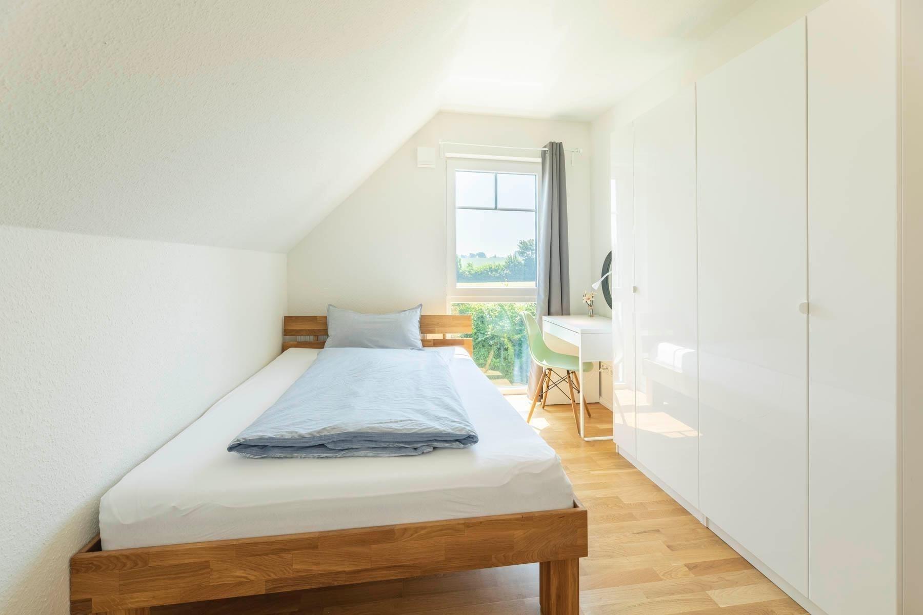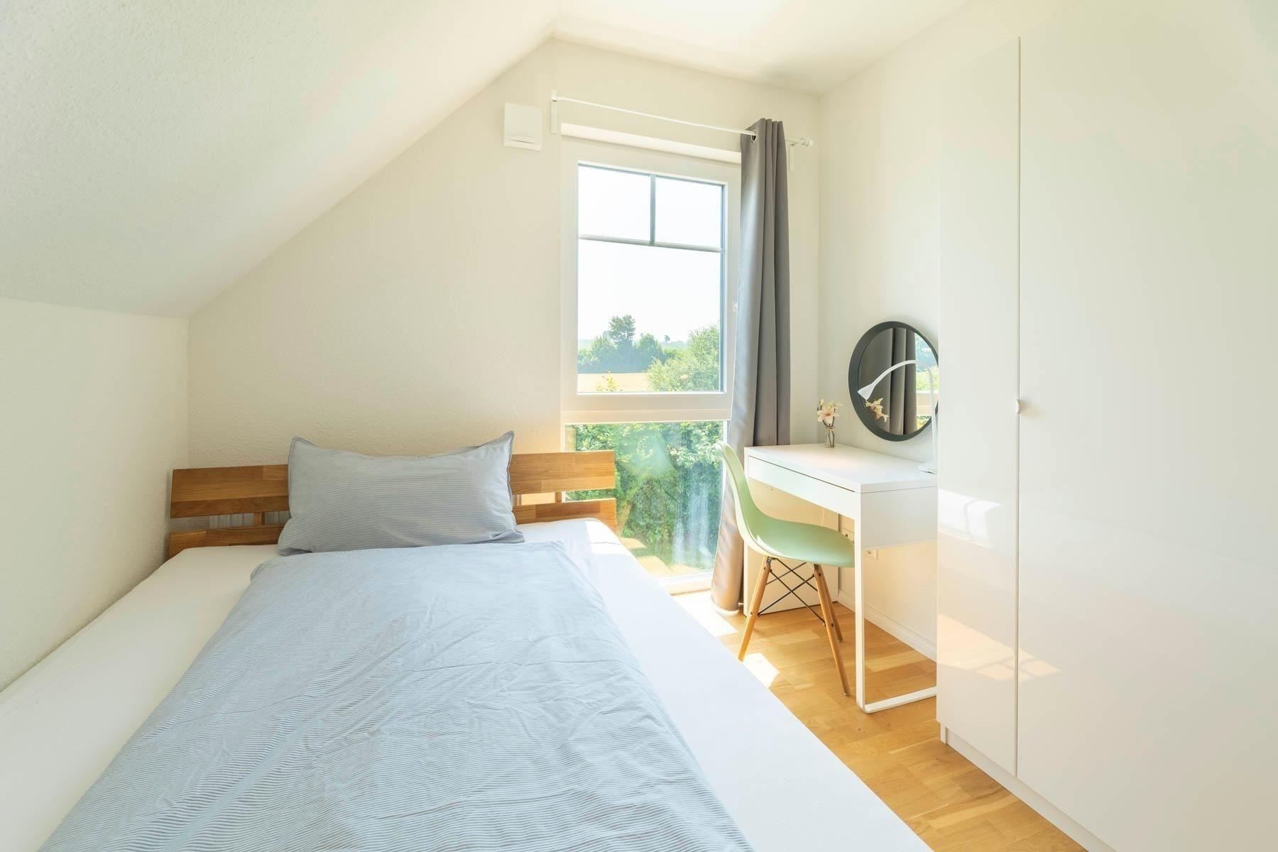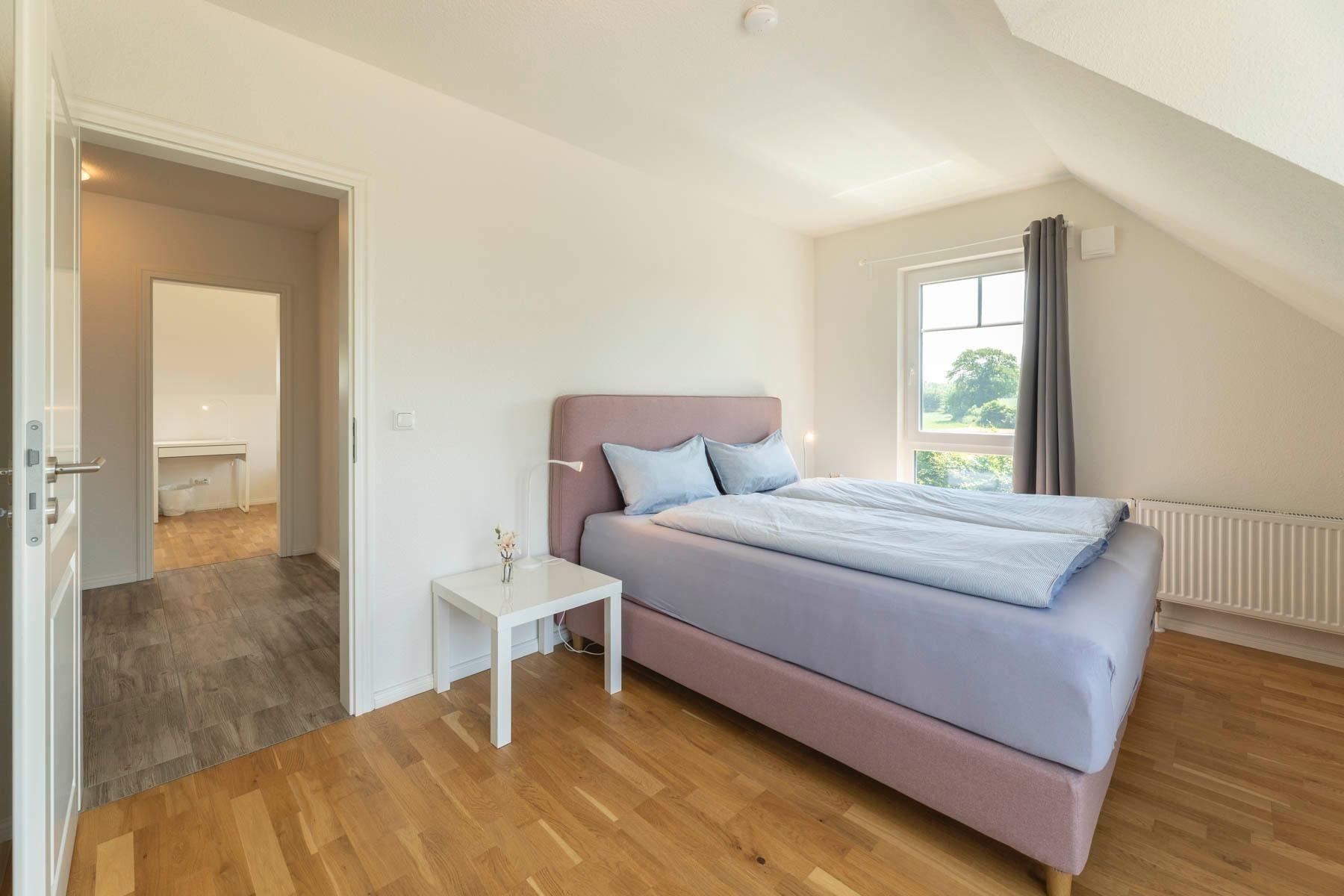 Es gibt zwei Schlafzimmer: eines mit einem Doppelbett und einer Ausziehcouch, das andere mit zwei Einzelbetten. Eine bodennahe Dusche und eine Sauna im Obergeschoss sowie eine Gästetoilette im Erdgeschoss runden die Ausstattung ab. Ein Hauswirtschaftsraum mit Waschmaschine und Trockner ist ebenfalls vorhanden. WLAN steht zur Verfügung, und Hunde sind willkommen.