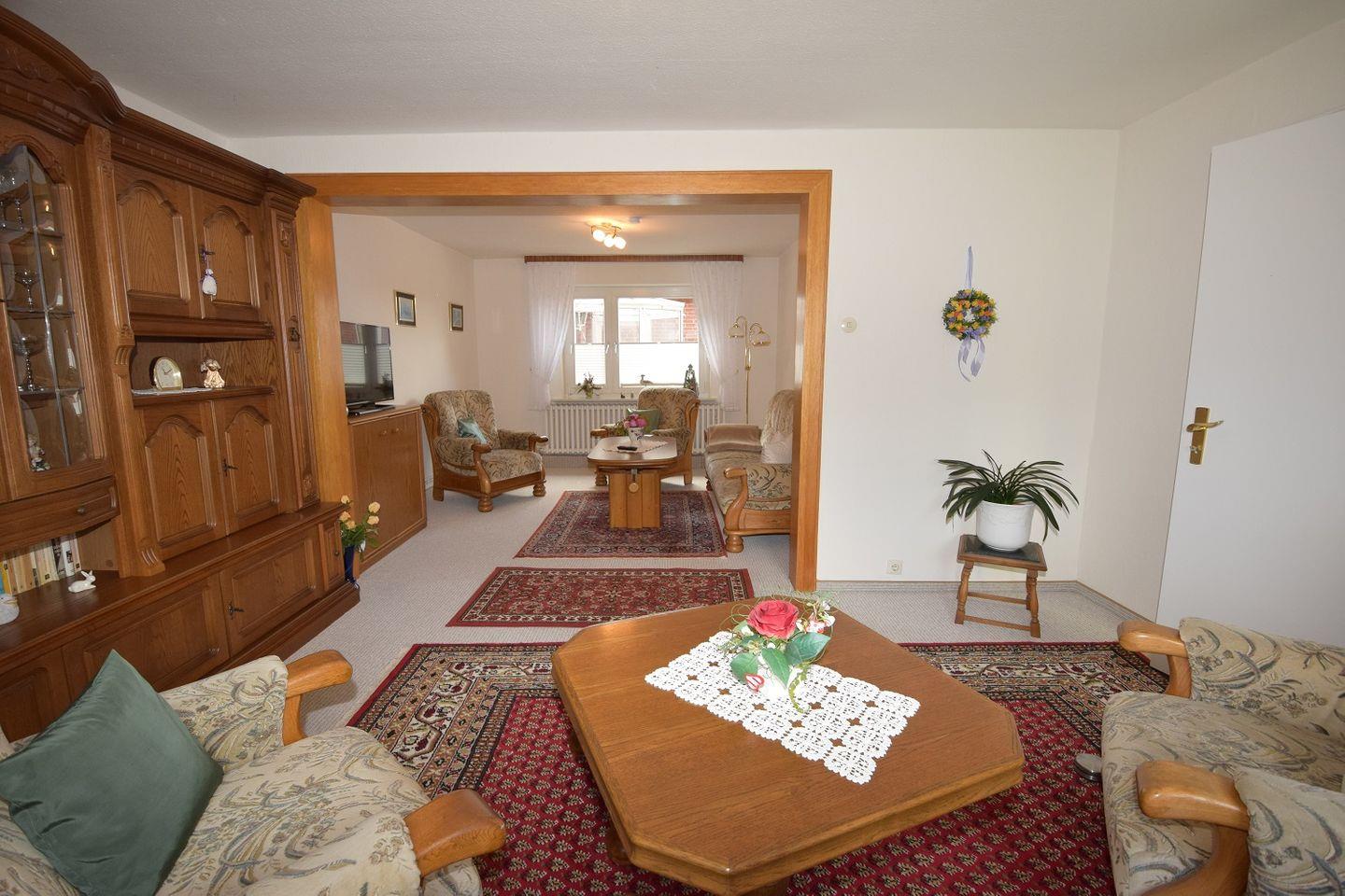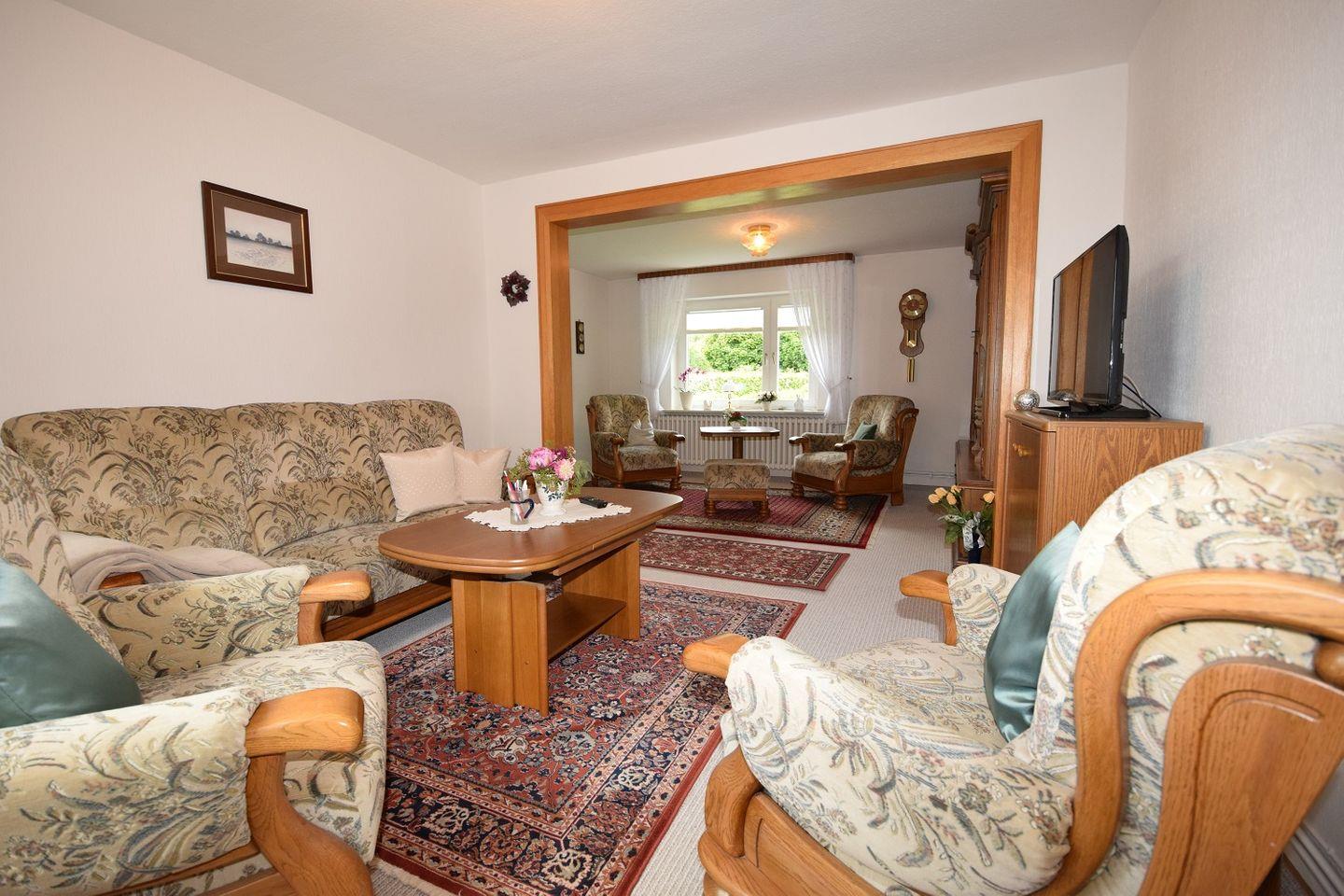 Das große sowie sehr gemütlich eingerichtete Wohnzimmer lädt zum Verweilen gemeinsamer Abendstunden ein.