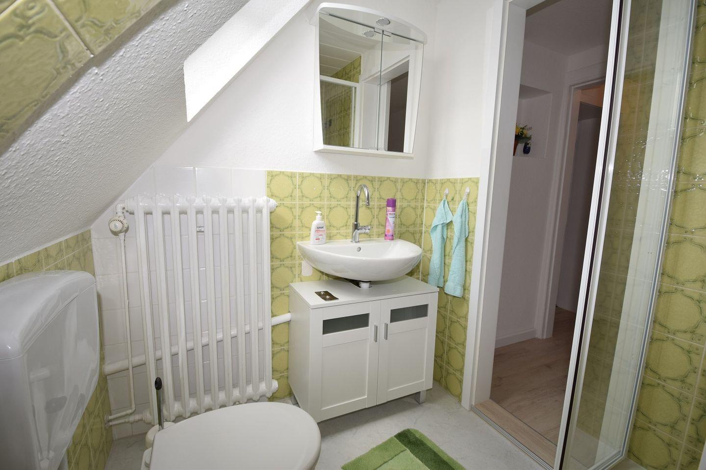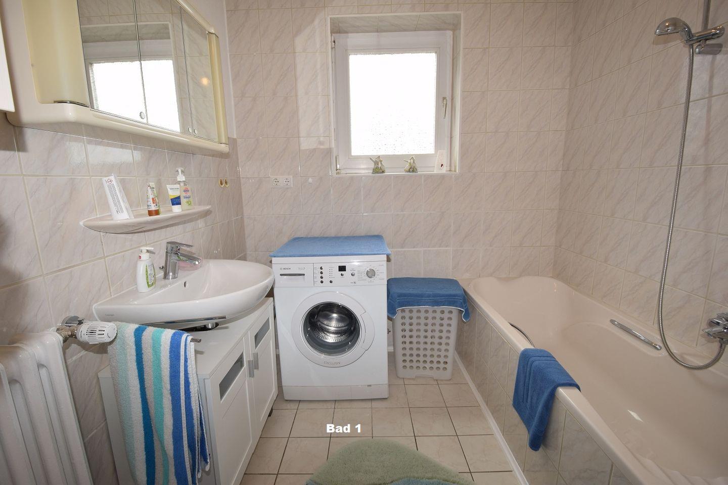 Der letzte Raum im Erdgeschoss ist das 1. Badezimmer des Hauses, in diesem finden Sie eine Badewanne, ein Waschbecken, über diesem einen Spiegelschrank, ein WC, eine Waschmaschine, ein Fenster, welches für Tageslicht sorgt, sowie reichlich Stauraum für Ihre Pflegeartikel.