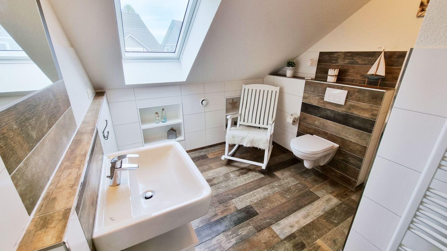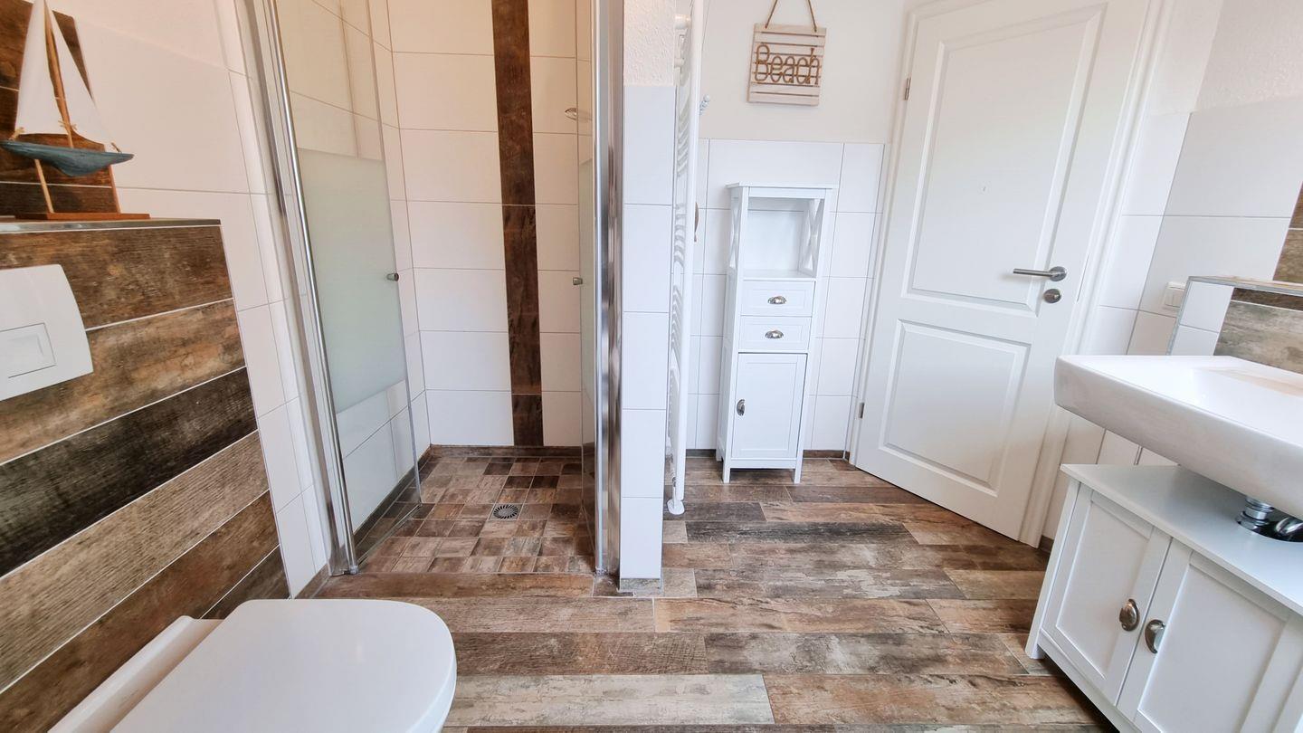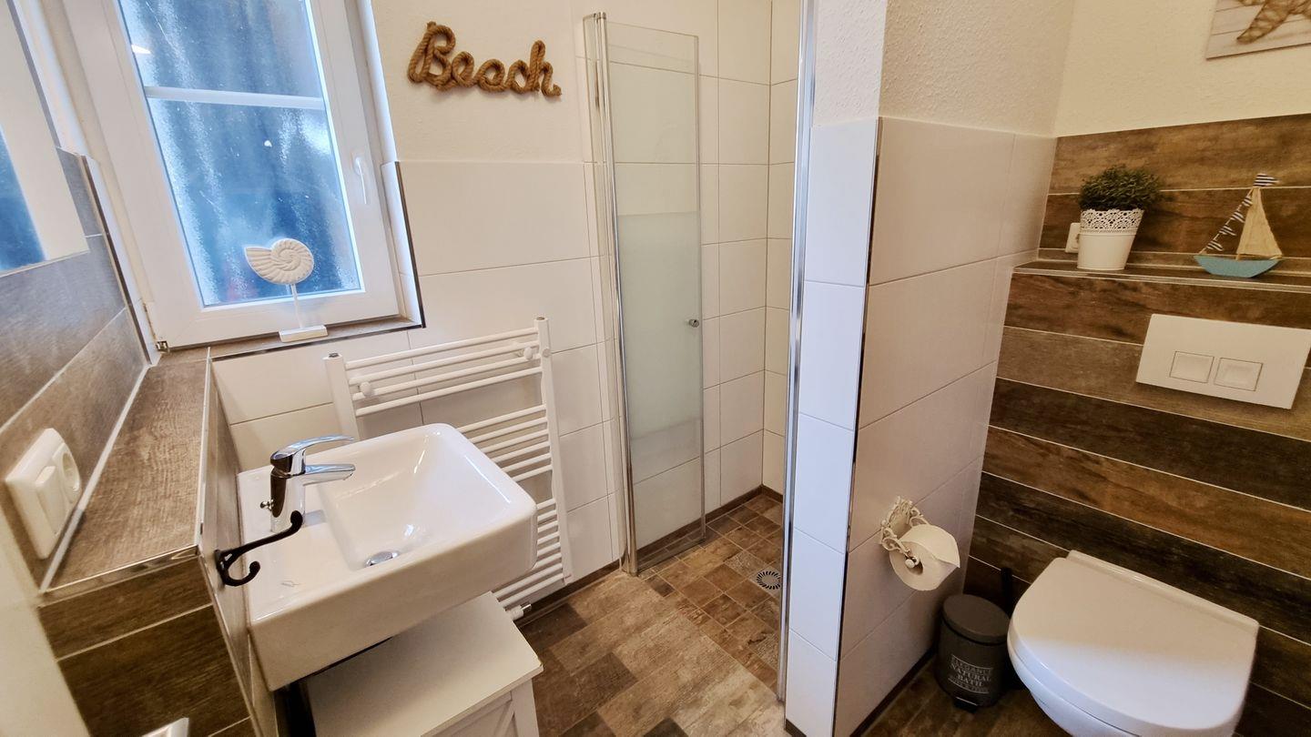 Badezimmer I (OG): Dusche / Waschbecken / WC / Föhn / Handtuchheizkörper