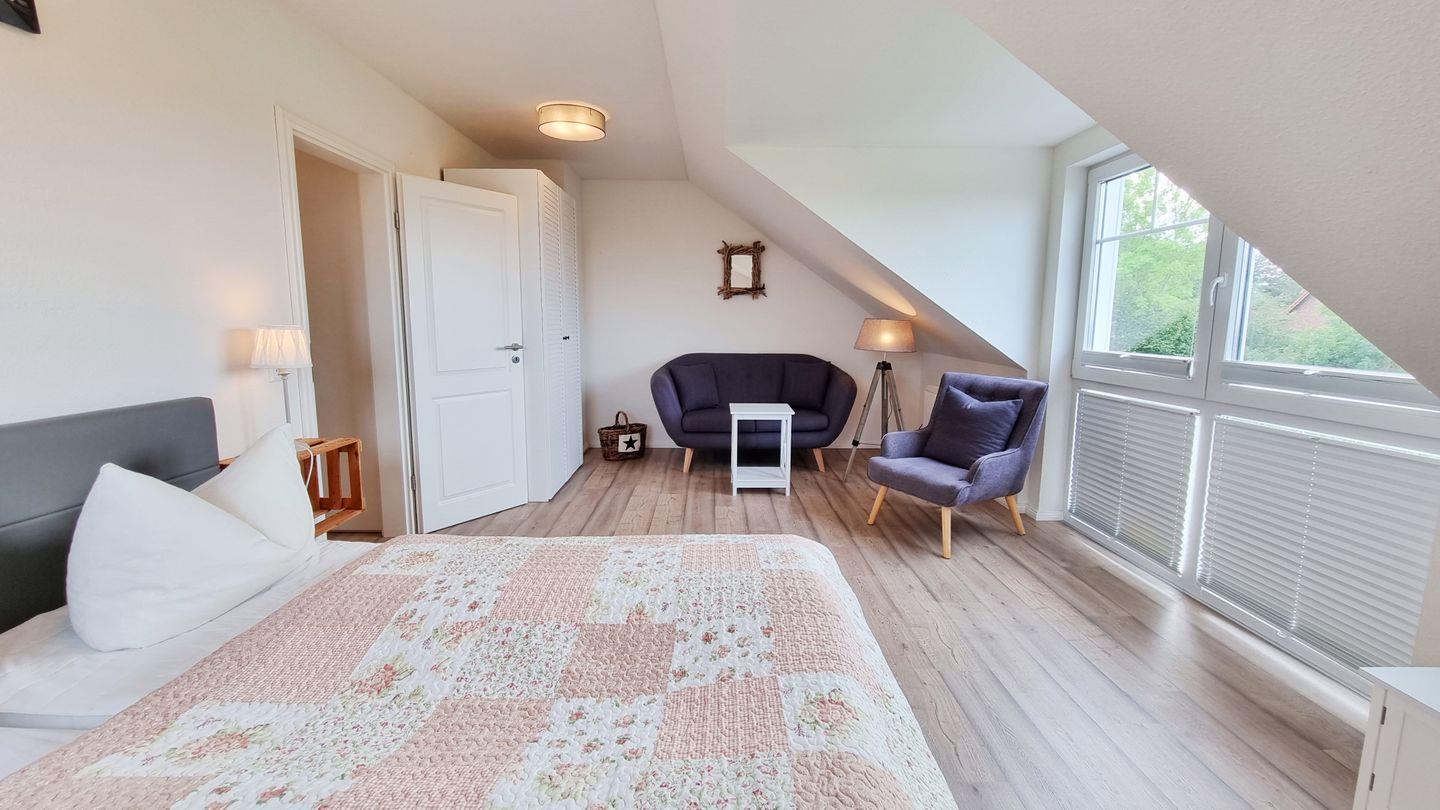 Schlafzimmer II (OG): Doppelbett (180x200cm) / Schrank / Fernseher / Sessel / Plissees