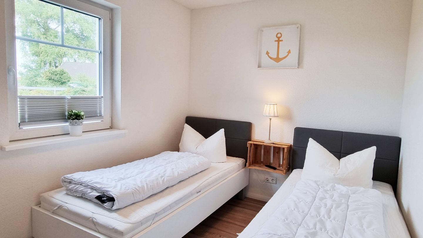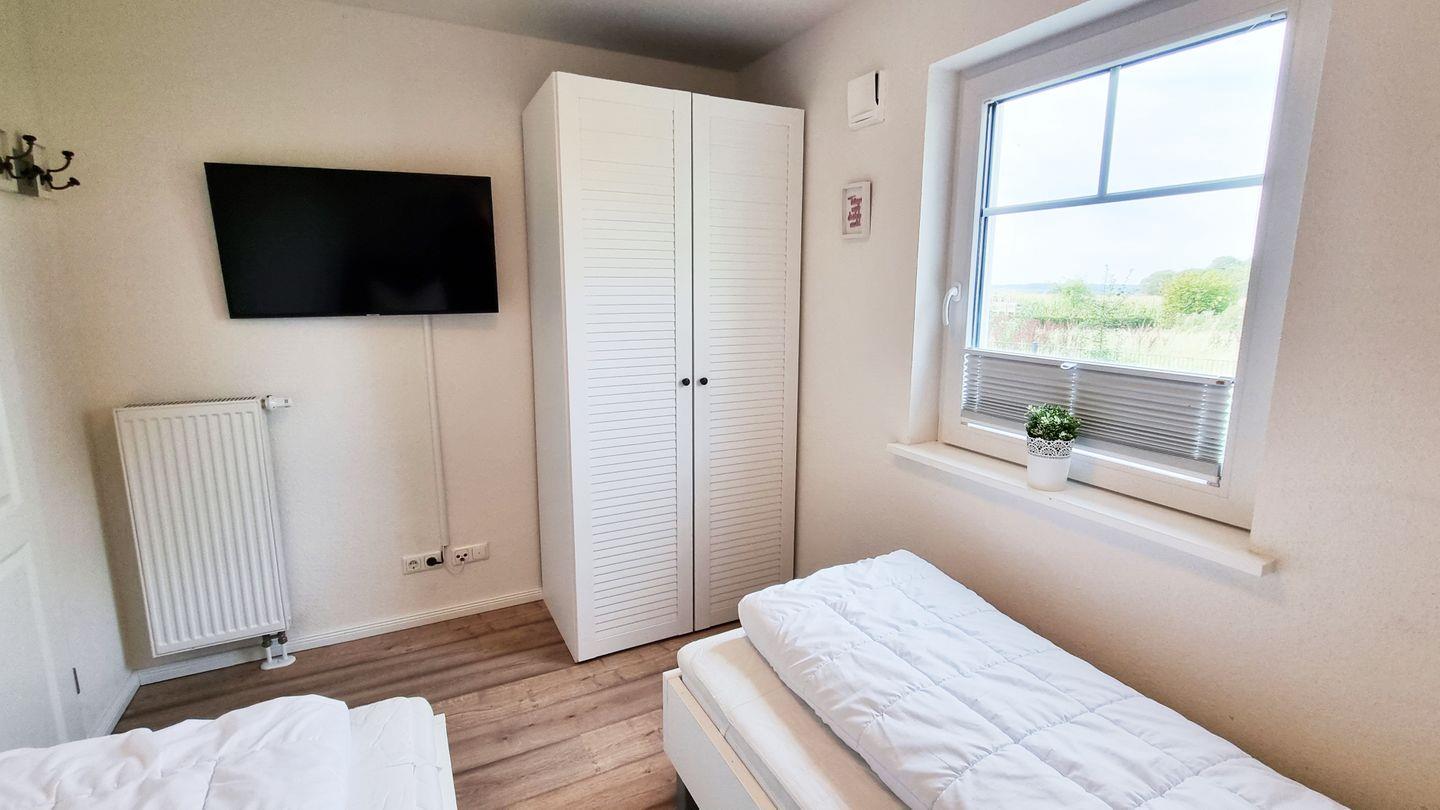 Schlafzimmer III (EG): zwei Einzelbetten / Schrank / Plissees