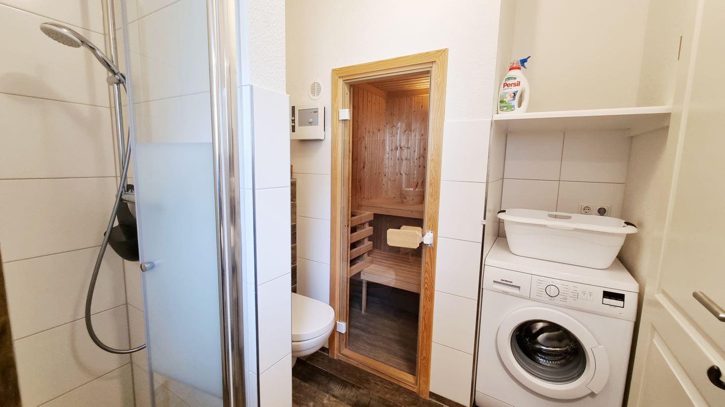 Badezimmer II (EG): Dusche / Waschbecken / WC / Handtuchheizkörper / Sauna