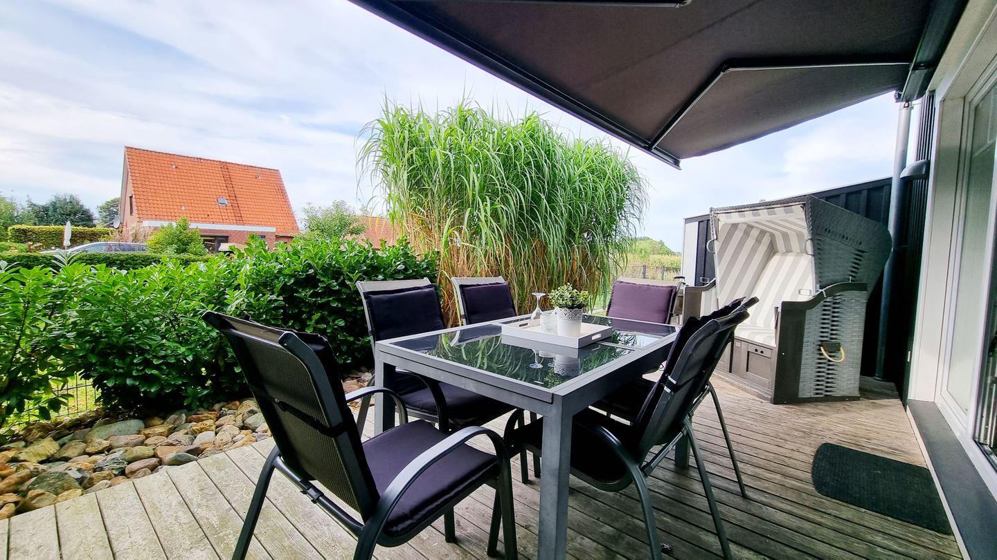 Garten und Terrasse: 320qm eingezäunt / Strandkorb am Haus / Tisch / 6 Stühle / Holzkohlegrill / elektrische Markise/ Kinderspielturm