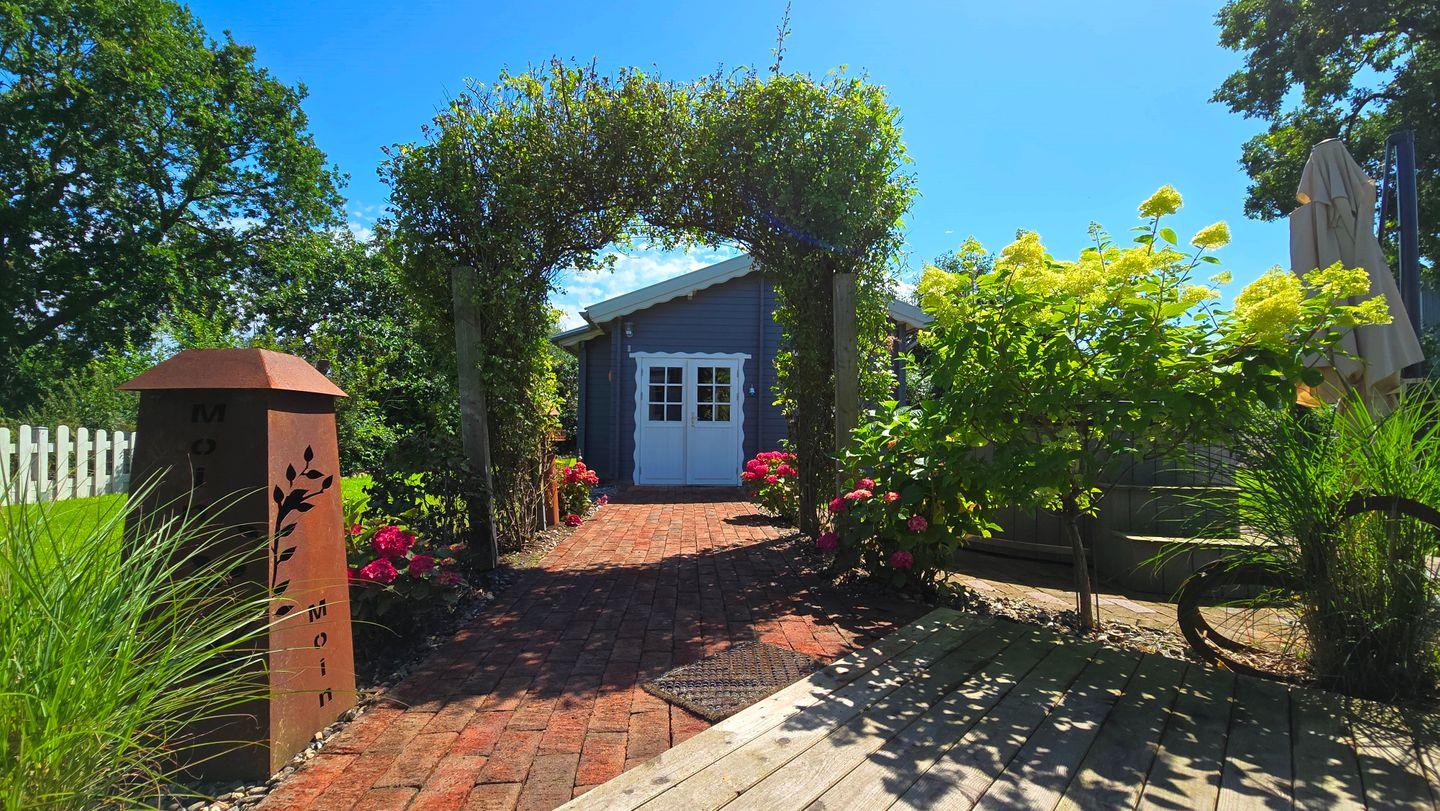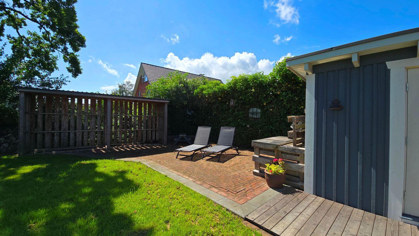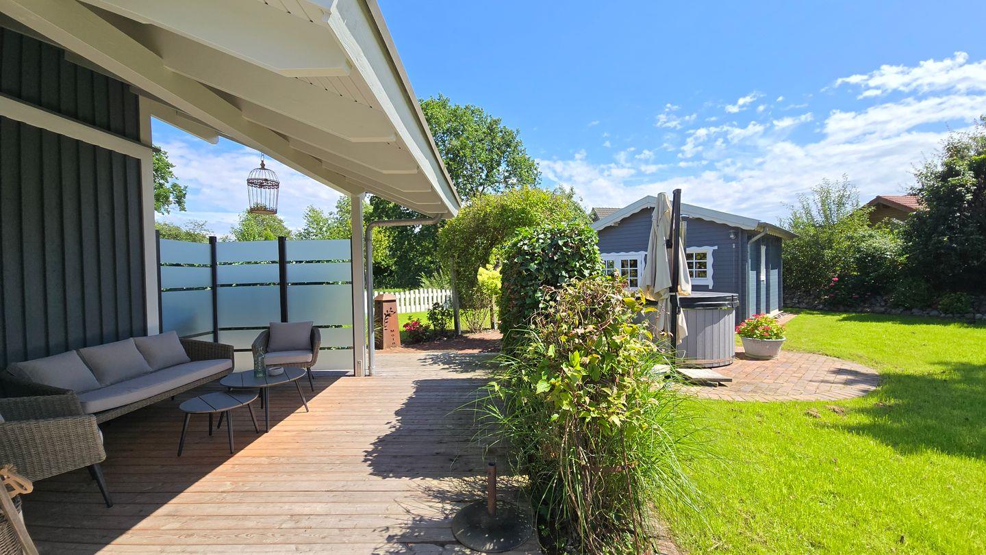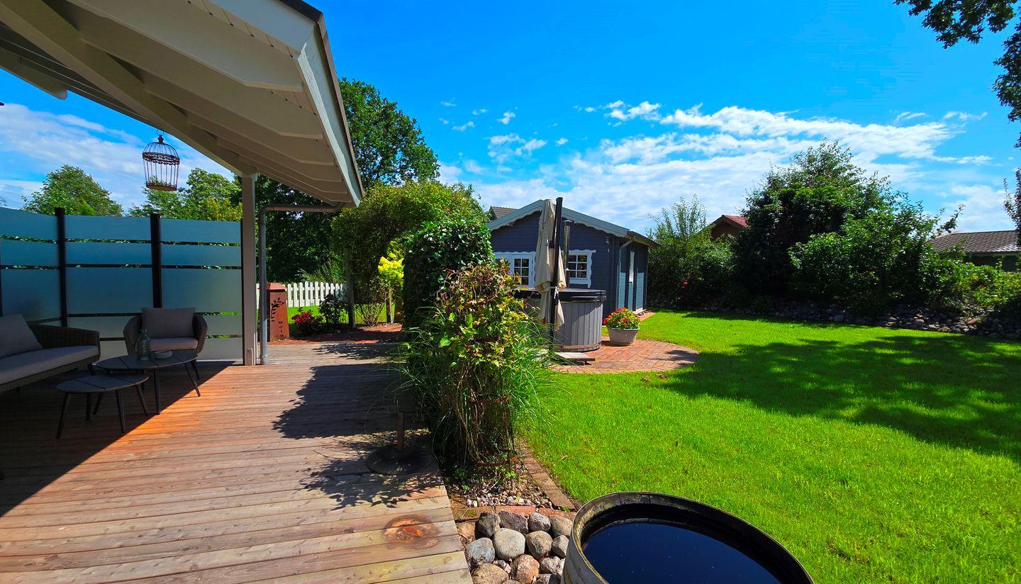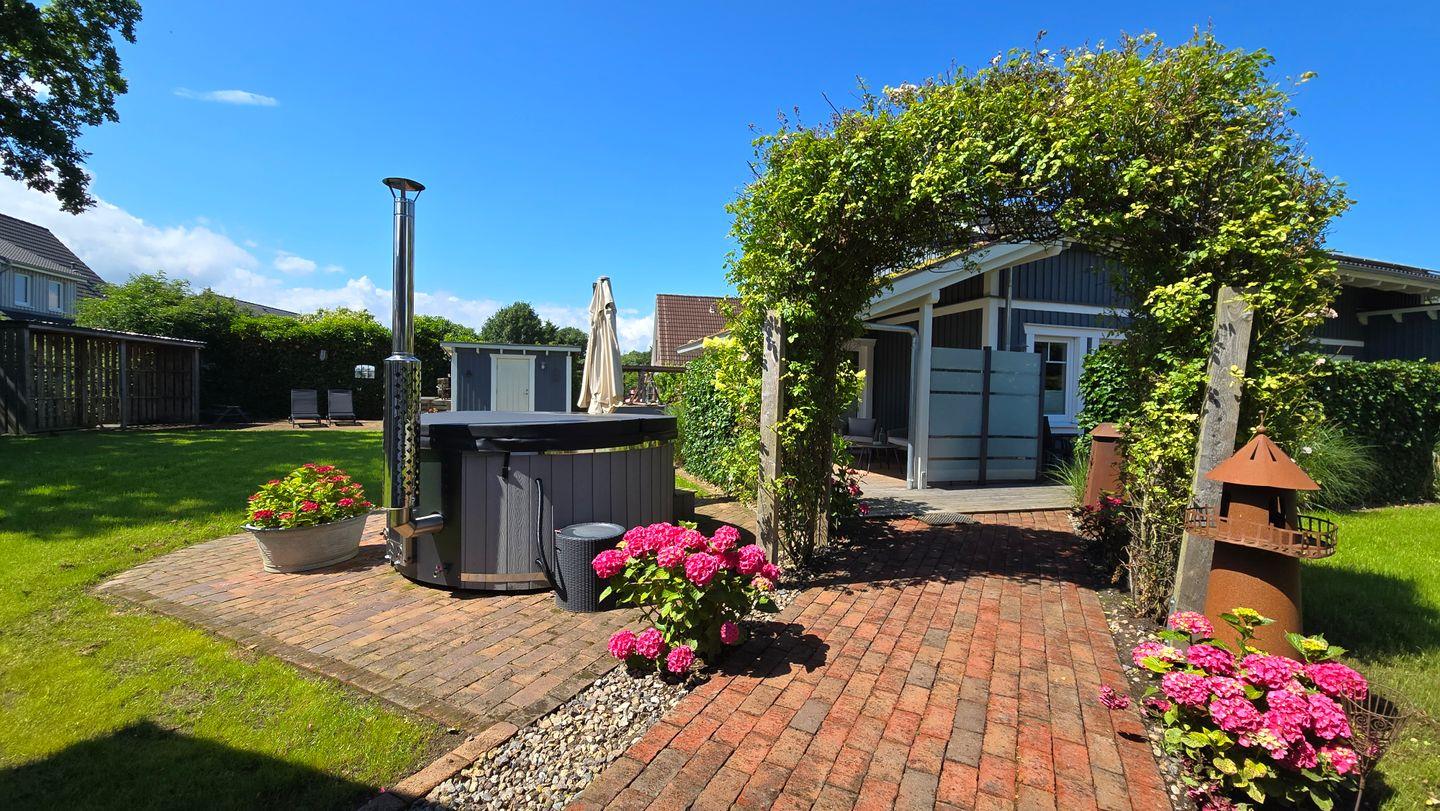 Der voll eingezäunte Garten kann mit viel Rasenfläche, Strandkorb am Haus, Holzkohlegrill, Terrasse und überdachter Loungeecke aufwarten. Das absolute Highlight bietet die Outdoor-Badetonne mit Whirlpool-Funktion, die optional zugebucht werden kann. Es steht dazu ein großer Schuppen zum Unterstellen von Fahrrädern zur Verfügung.