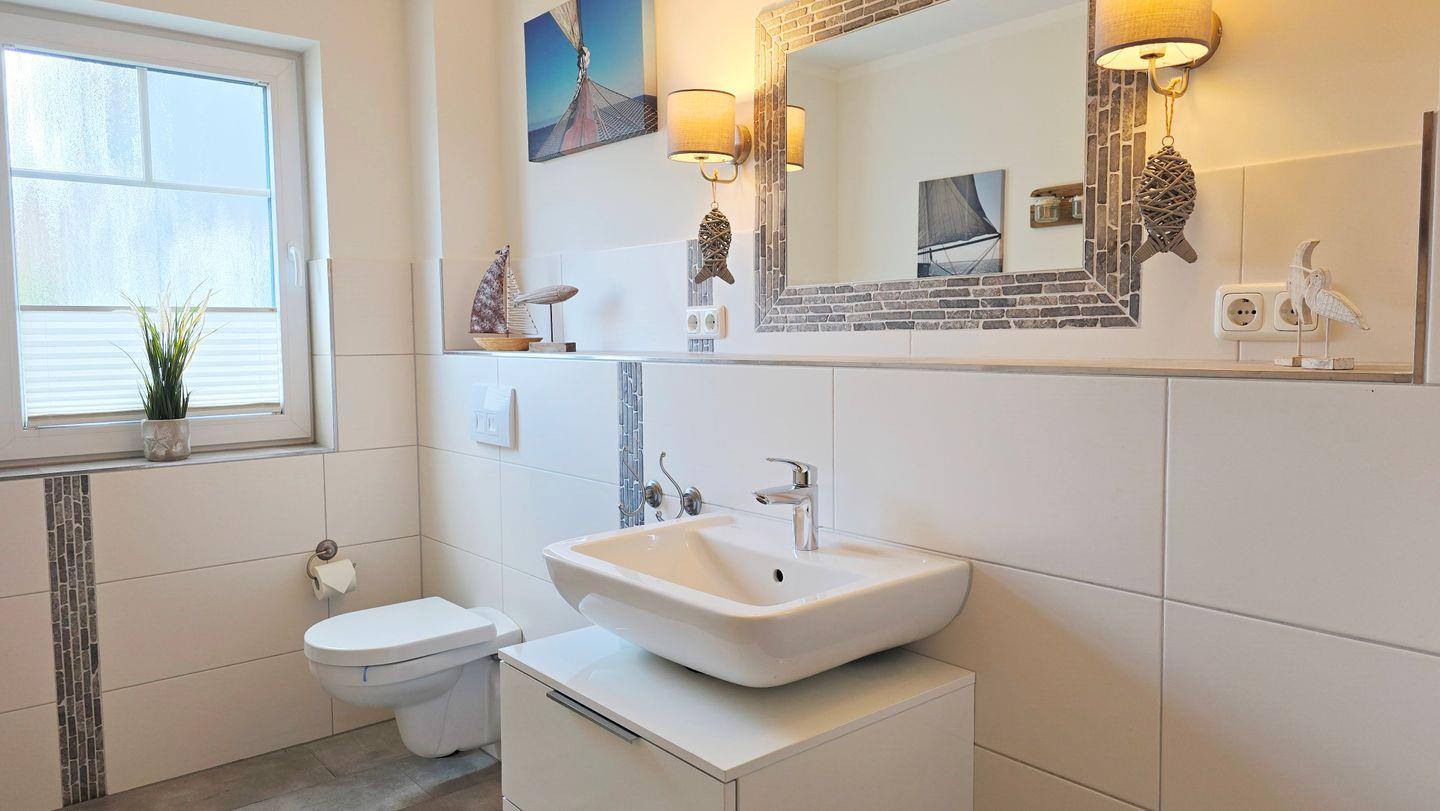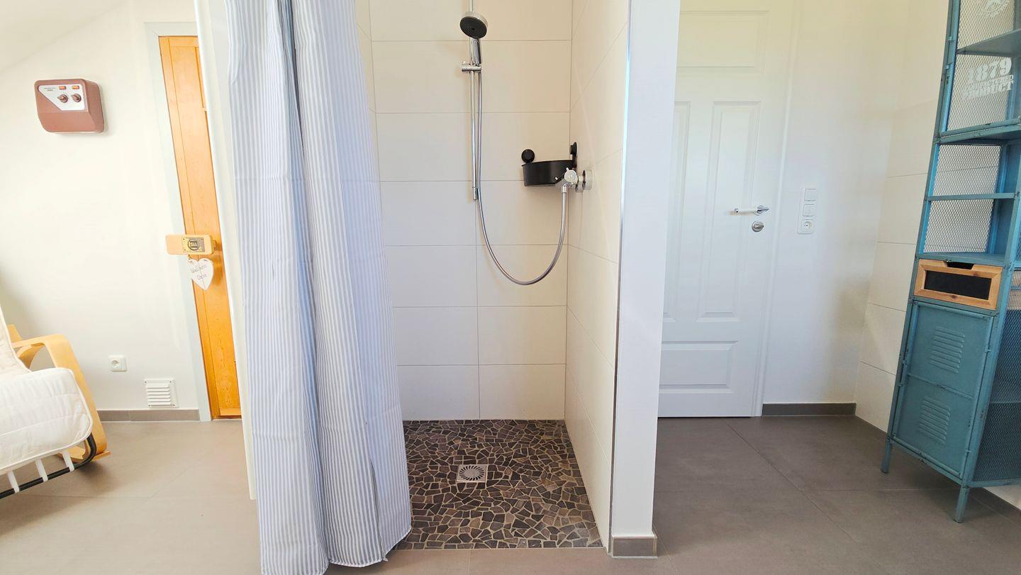 Badezimmer I (EG): ebenerdige Dusche / Waschbecken / WC / Handtuchheizkörper