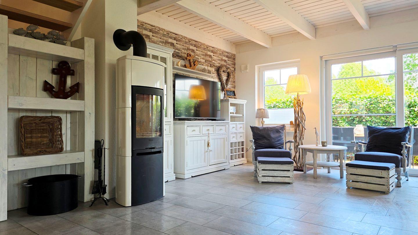 Wohn- Essbereich: großes Ecksofa / gemütlicher Sessel / Fernseher / Kamin (Holz exkl.) / Esstisch / 12 Stühle