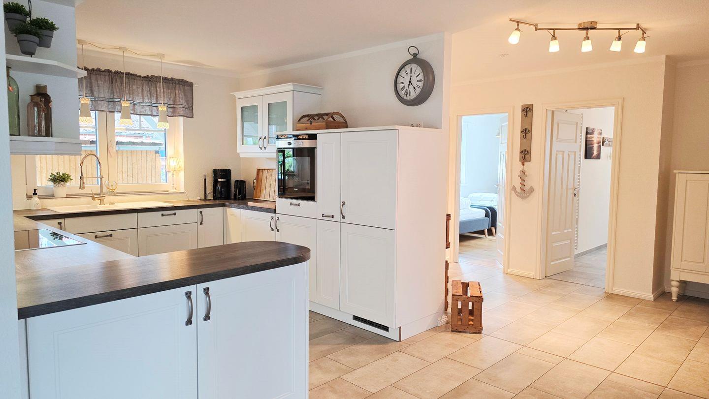 Küche: offene Küche im Landhausstil / Induktionskochfeld / Dunstabzugshaube / Backofen / Mikrowelle / Geschirrspüler / Toaster / Filterkaffeemaschine / Wasserkocher / Kühlschrank mit 3-Fächer Gefrierschrank / Mixer
