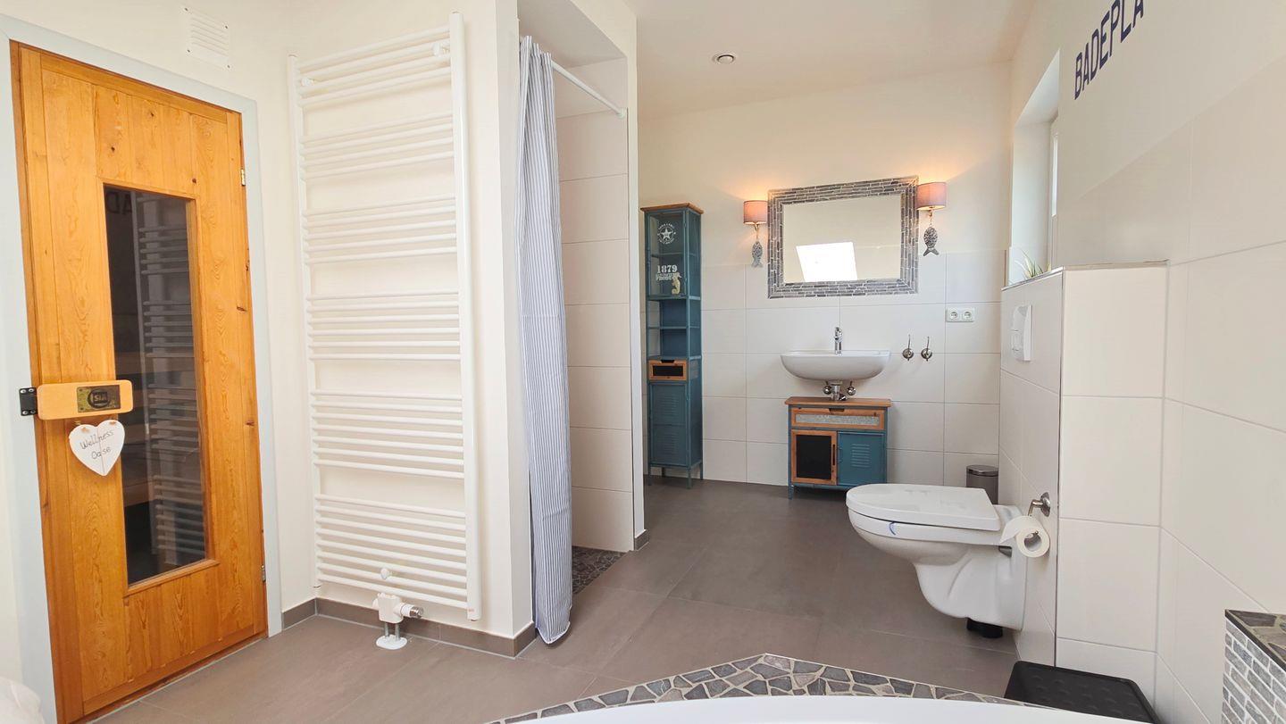 Badezimmer II (OG): ebenerdige Dusche / Eckbadewanne / Sauna / Waschbecken / WC / Handtuchheizkörper