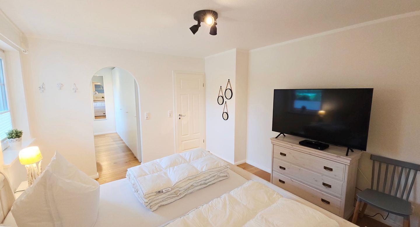 Schlafzimmer II (EG): Doppelbett (180x200cm) / begehbarer Kleiderschrank / Fernseher / Babybett