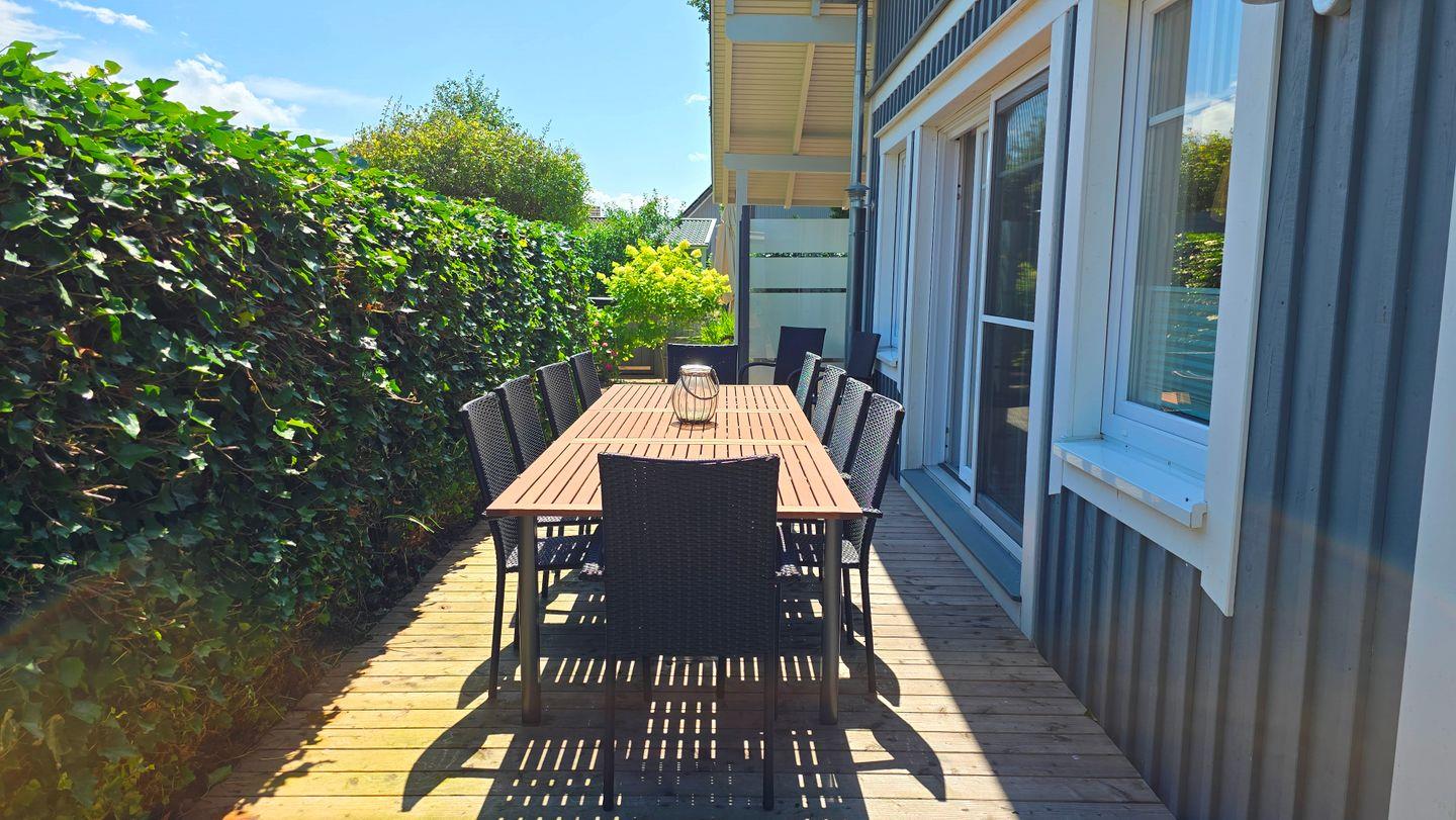 Terrasse: Tisch / 12 Stühle / Holzkohlegrill