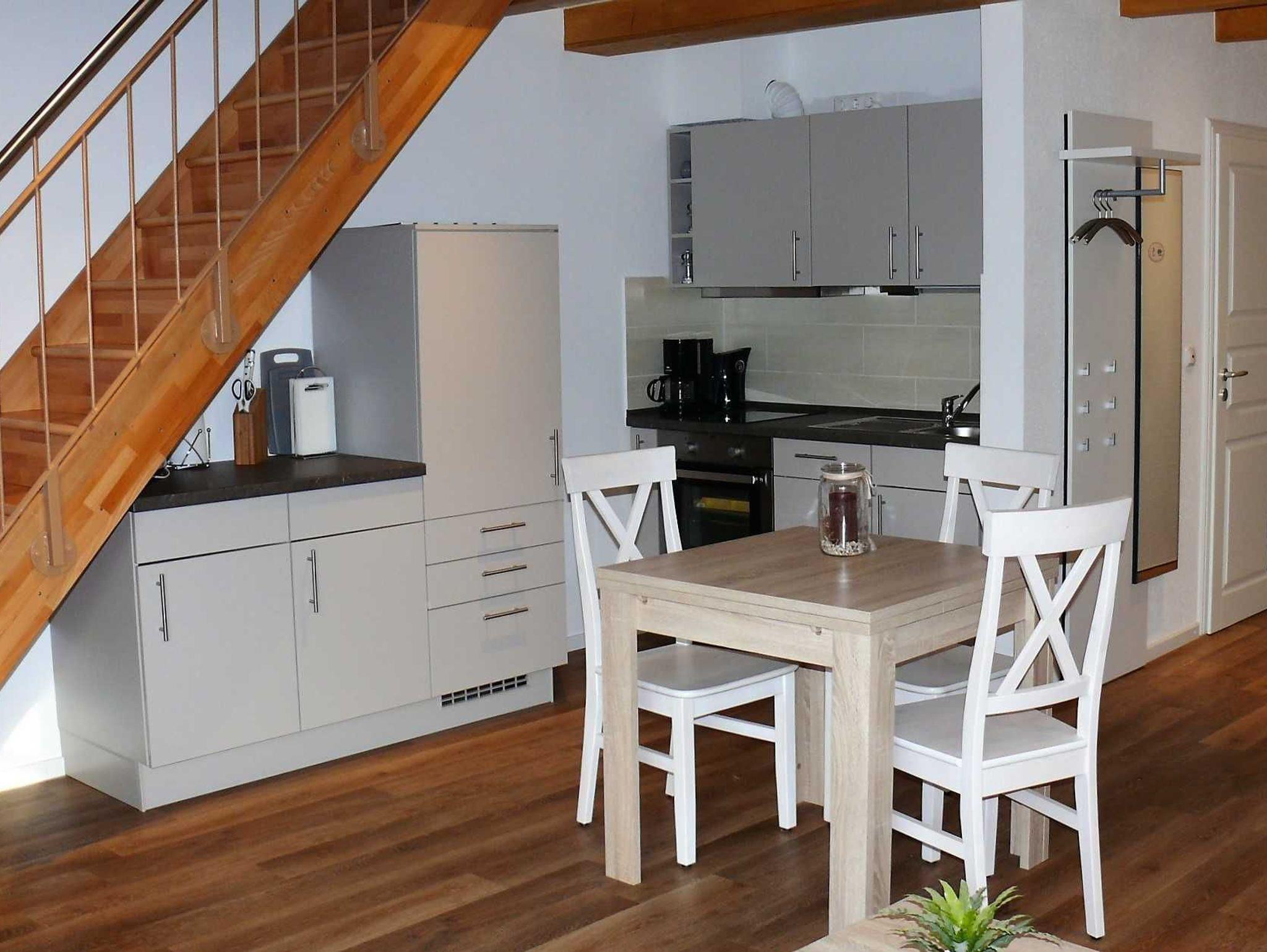 Die liebevoll eingerichtete 2-Zimmerwohnung über zwei Etagen auf dem Tannenhof Meier in Bliedersdorf ist ideal für Erholungssuchende. Die Wohnung befindet sich im ersten Stock des Reetdachhauses. Der Wohn- und Essbereich ist mit einer volleingerichtete Küche kombiniert. Das Schlafzimmer im Dachgeschoss ist mit zwei Einzelbetten sowie einem großen Kleiderschrank und einem Schreibtisch eingerichtet. Außerdem wäre Platz für eine Kinderbett. Ein Schrankbett befindet sich im Wohn- und Essbereich und kann für eine weitere Erwachsene genutzt werden. Das Badezimmer ist mit einer ebenerdigen Dusche ausgestattet.