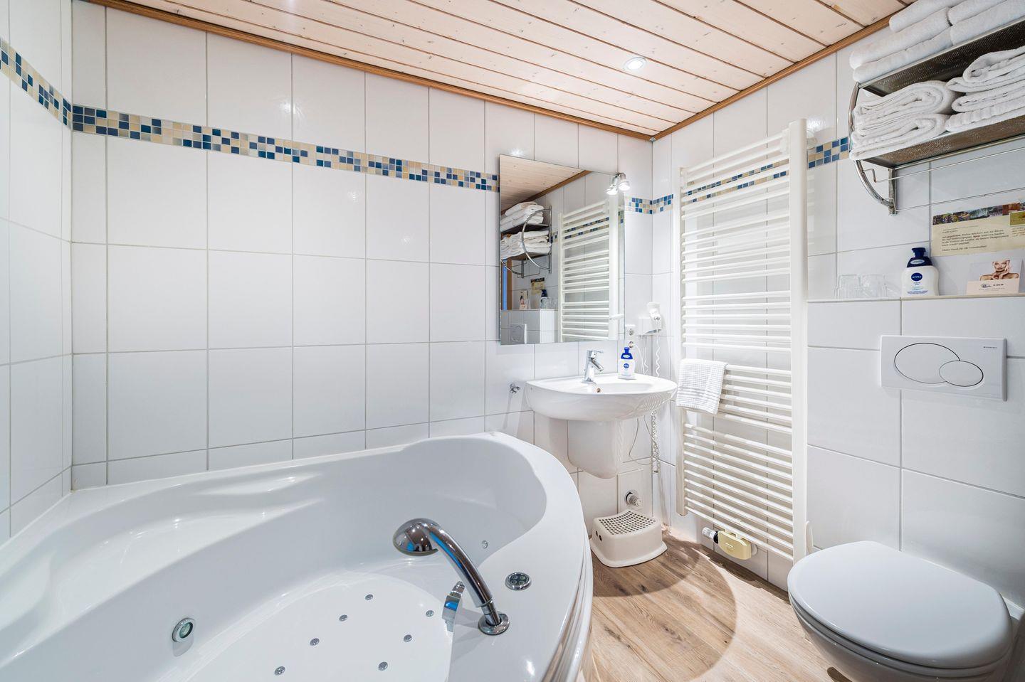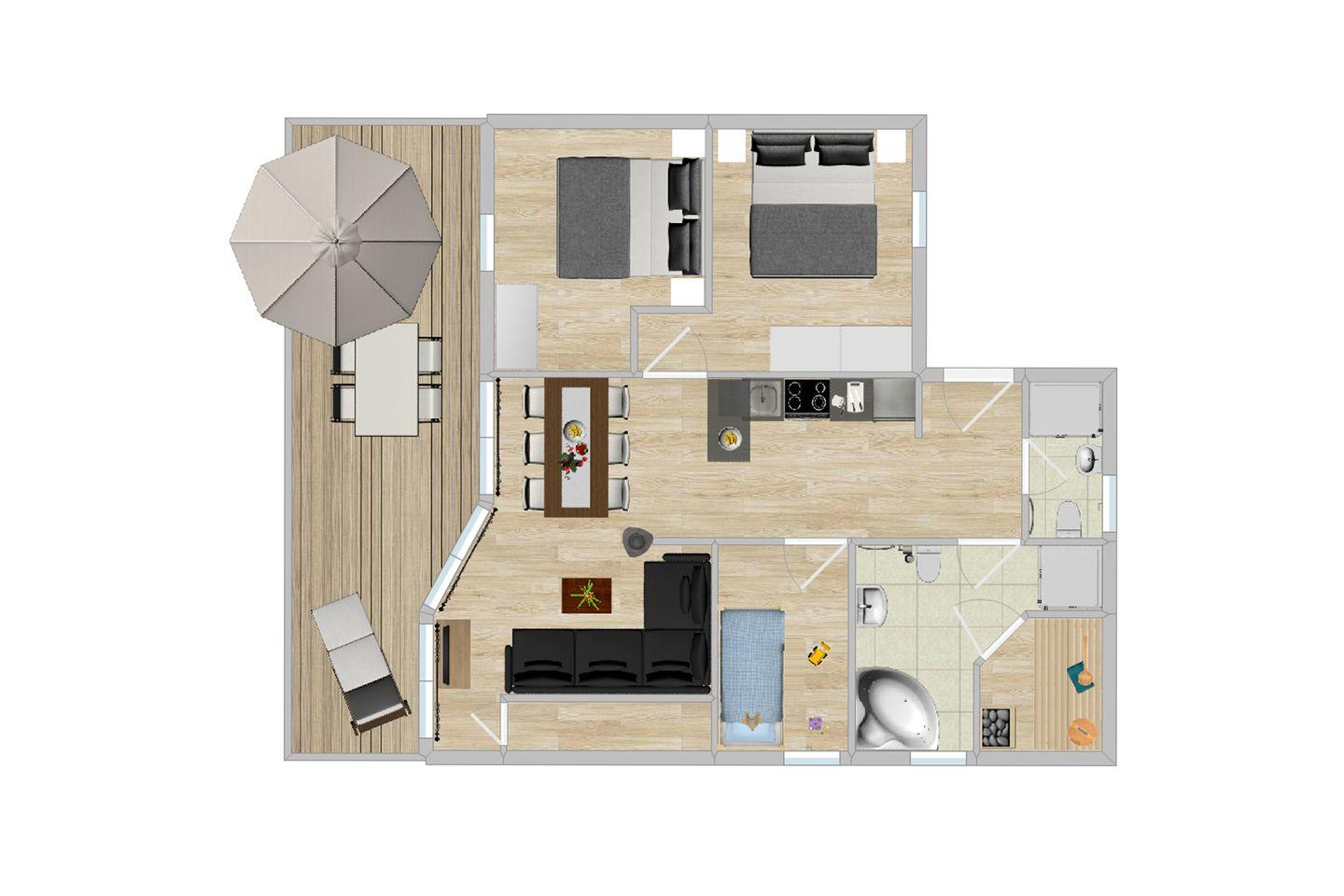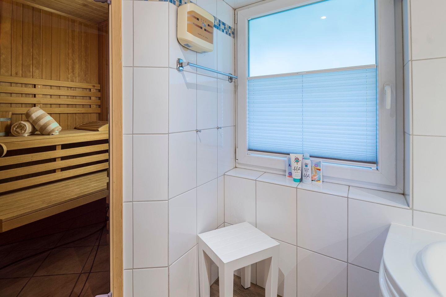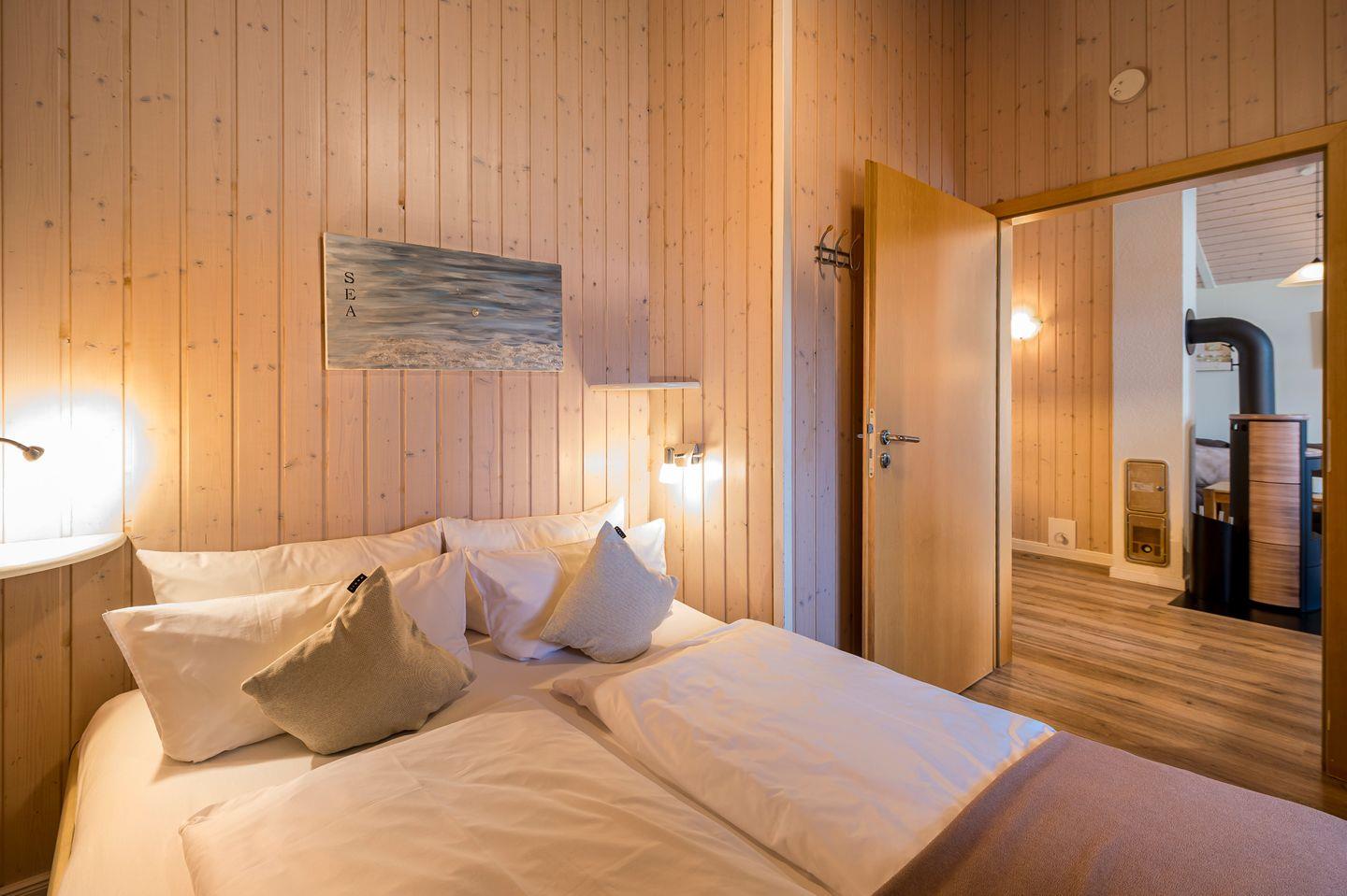 Es ist sehr luxuriös ausgestattet mit Sauna, Whirlbadewanne und Dusche im großen Badezimmer. Zudem gibt es ein separates Gästebad mit WC und Dusche. Die beiden Elternschlafzimmer mit je einem Doppelbett, sowie das Kinderzimmer mit Etagenbett, laden zum gemütlichen Schlafen ein.