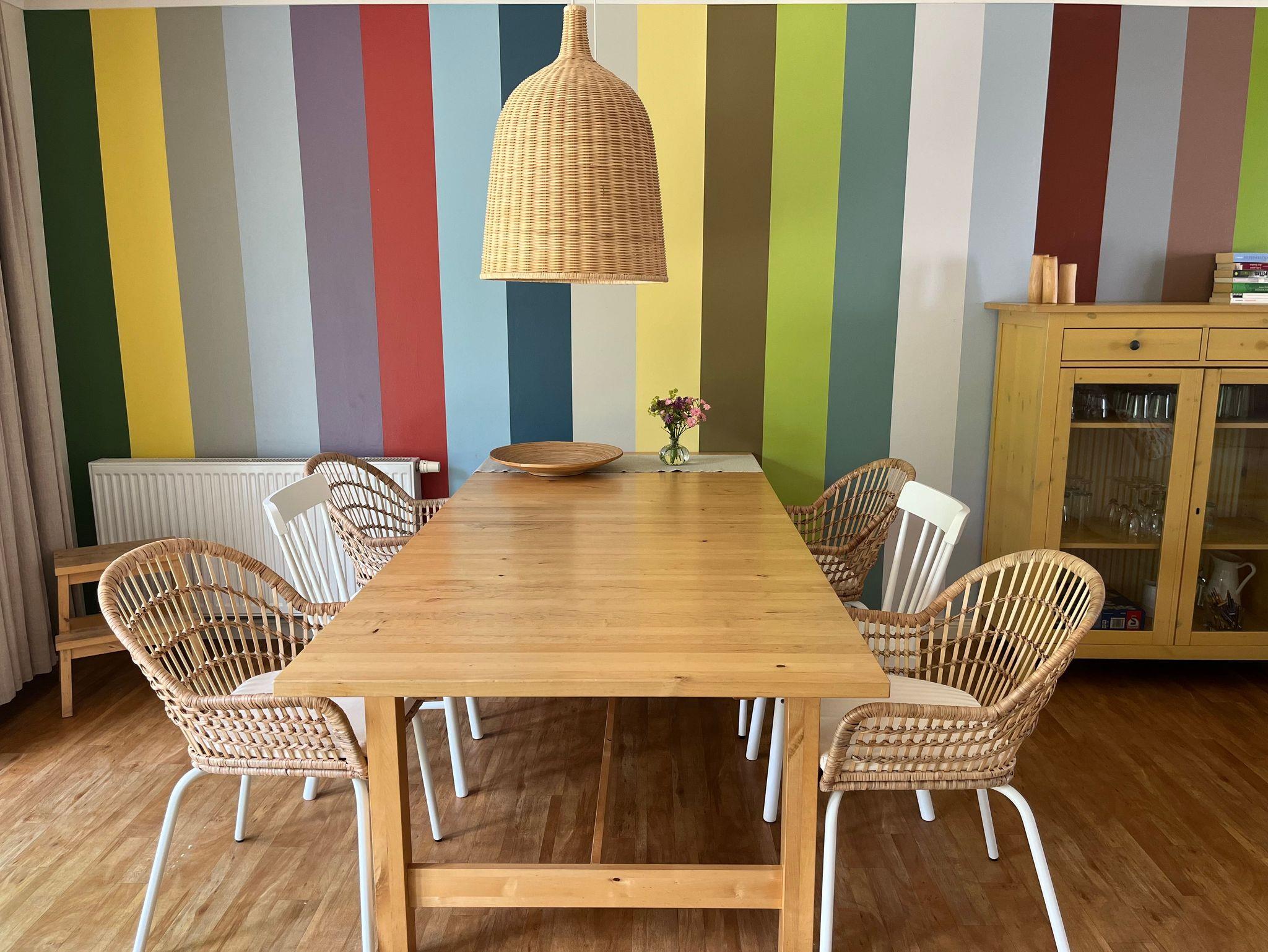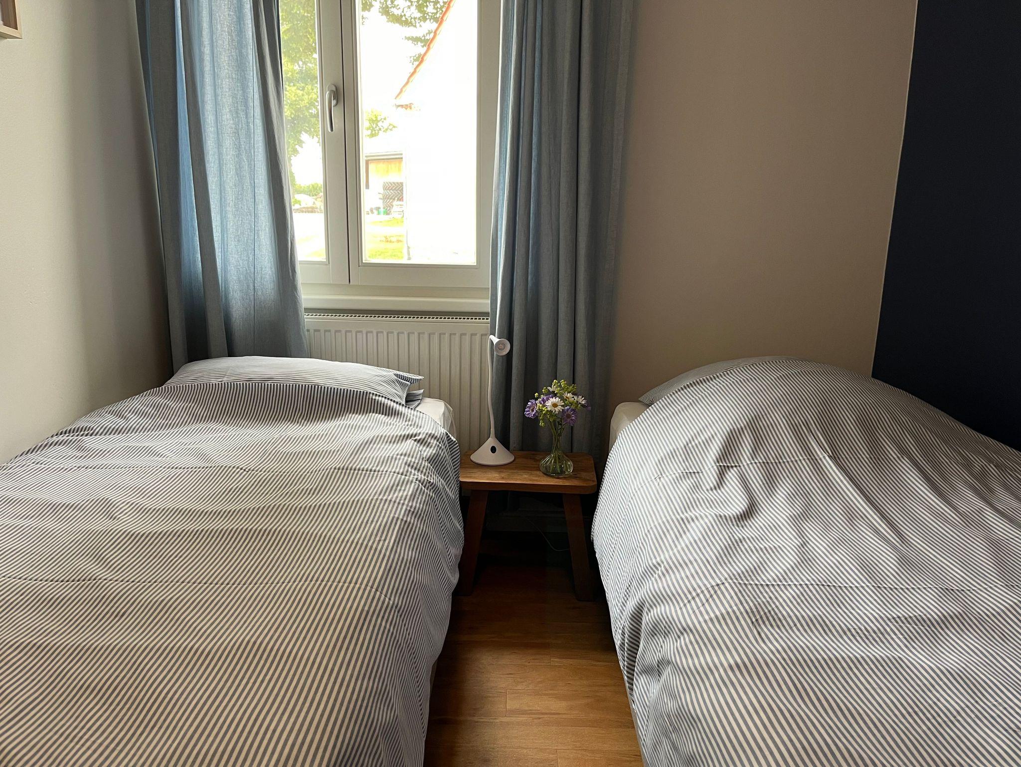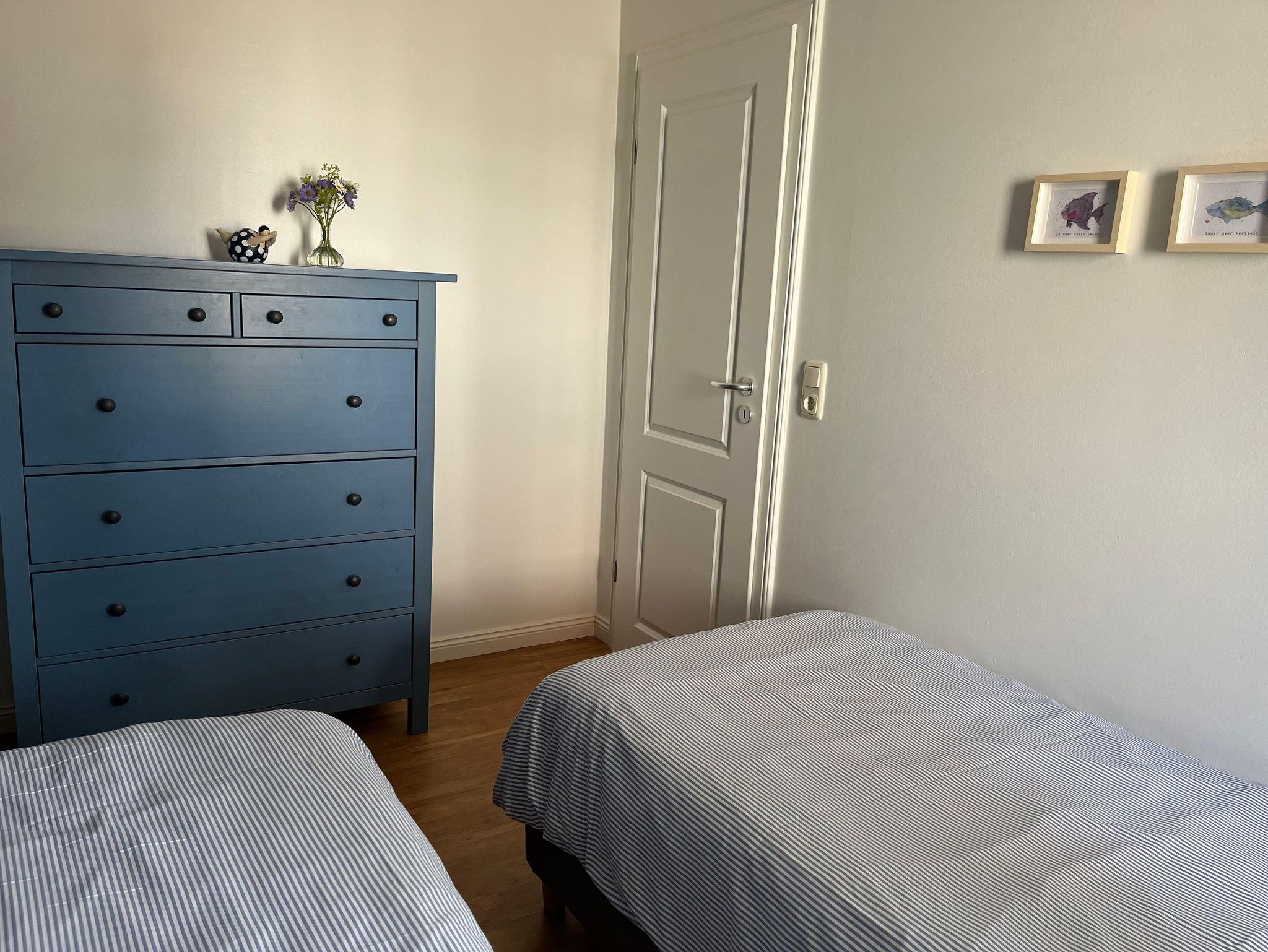 4-Raum-Ferienhaus (94 qm) bis zu 8 Personen mit 2 Bädern. Modern, freundlich gestaltetes Ferienhaus ideal für Familien mit Kindern. Modern, farbenfroh und freundlich eingerichtet. Wohnzimmer mit integrierter Küche, großem Eßtisch und Sitzecke. Küche ausgestattet mit 4 Platten E-Herd, Geschirrspülmaschine, Backofen, Mikrowelle, Kaffeemaschine, Wasserkocher. 1 Schlafzimmer mit Doppelbett, 1 Schlafzimmer mit 2 Einzelbetten, 1 Schlafzimmer mit 2 Einzelbetten. Aufbettung für 7. und 8. Person im Wohnzimmer auf ausziehbarer Schlafcouch (=Doppelbett). Es gibt 2 Badezimmer; 1 Badezimmer mit Dusche, WC und Waschbecken und 1 Badezimmer mit Badewanne, WC und Waschbecken. Direkter Zugang vom Wohnzimmer zur Terrasse mit Gartenmöbel.
