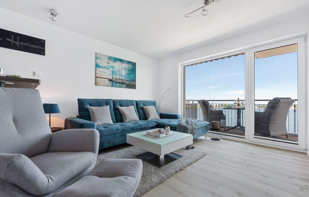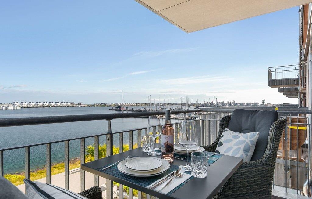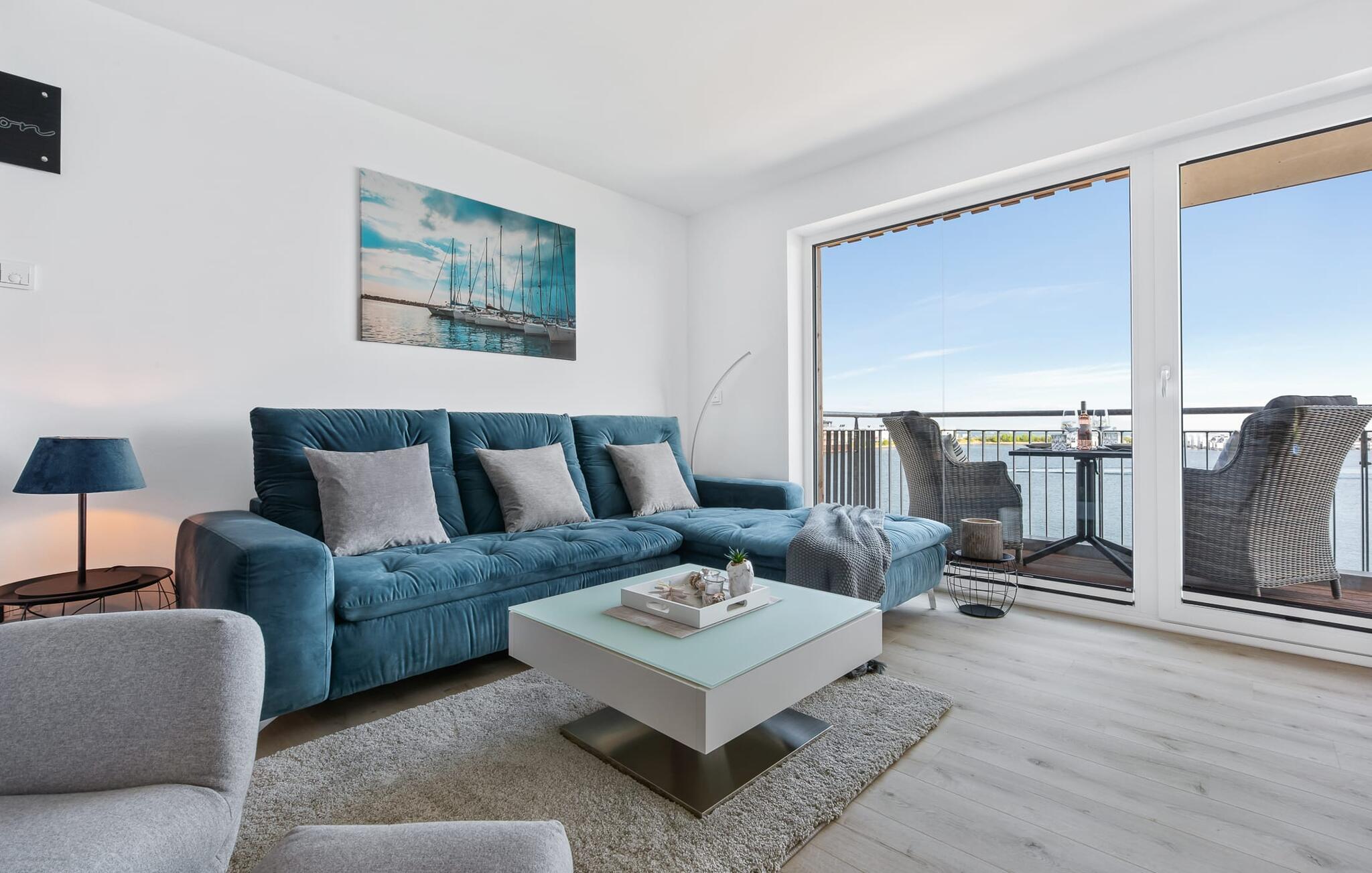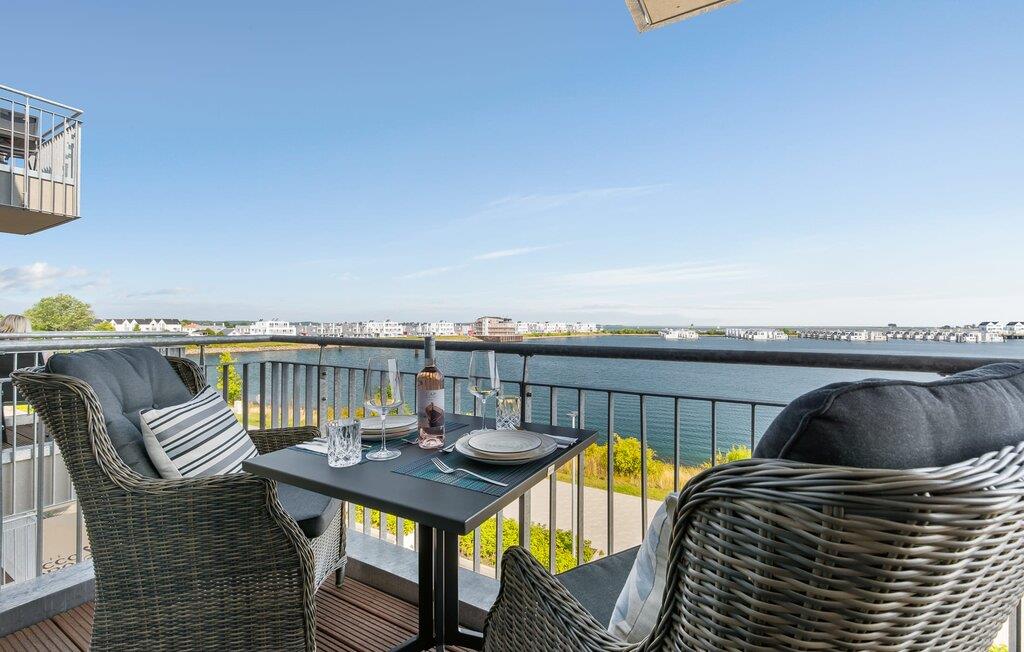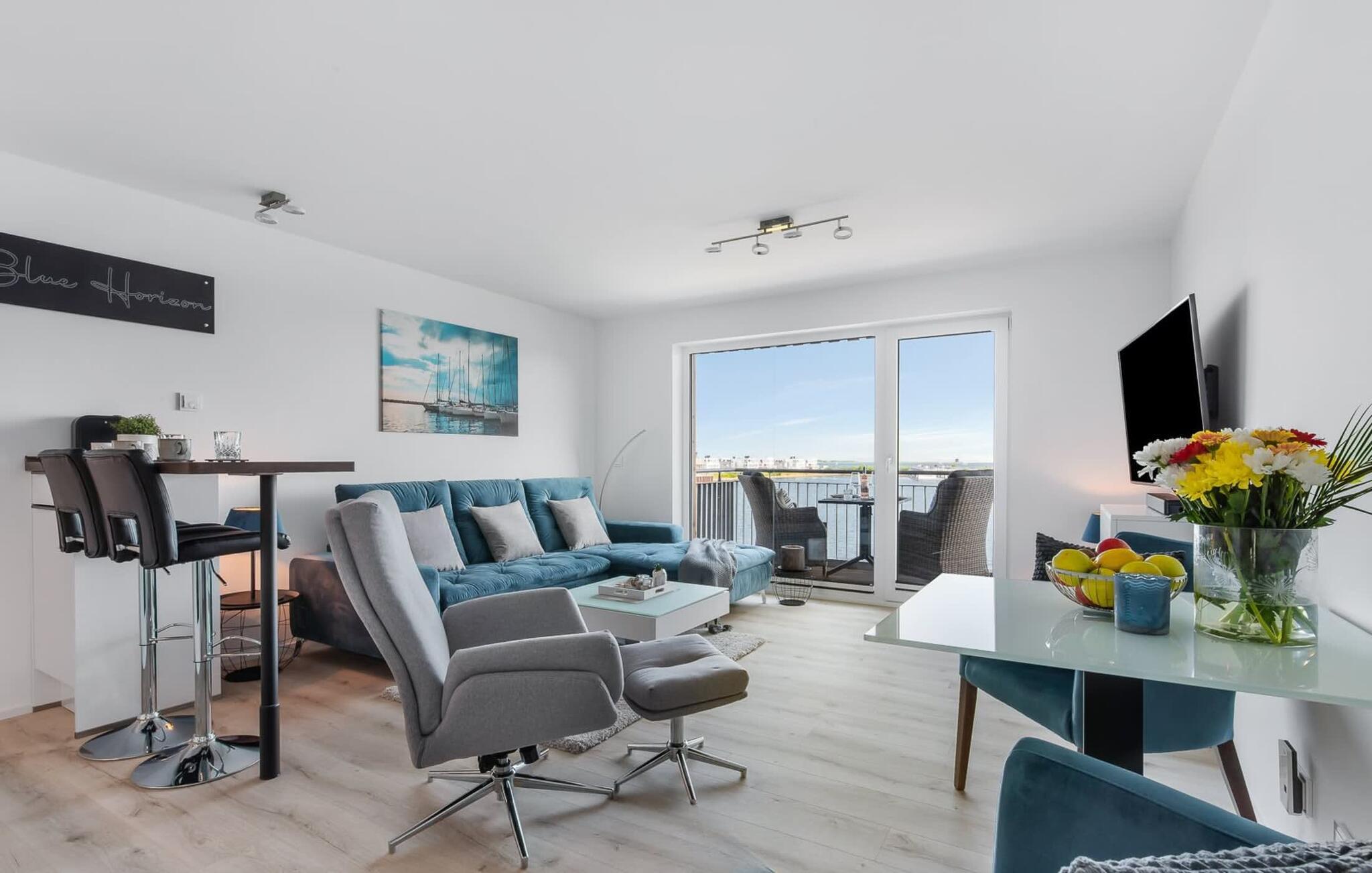 Gennem vinduerne fra gulv til loft og fra balkonen falder udsigten ikke kun på lystbådehavnen og de flydende huse, men også på østersøfjorden Slien og Schimmelünde fyrtårn. Sejlbåde, måger og smukke solnedgange garanterer en ægte feriefølelse.