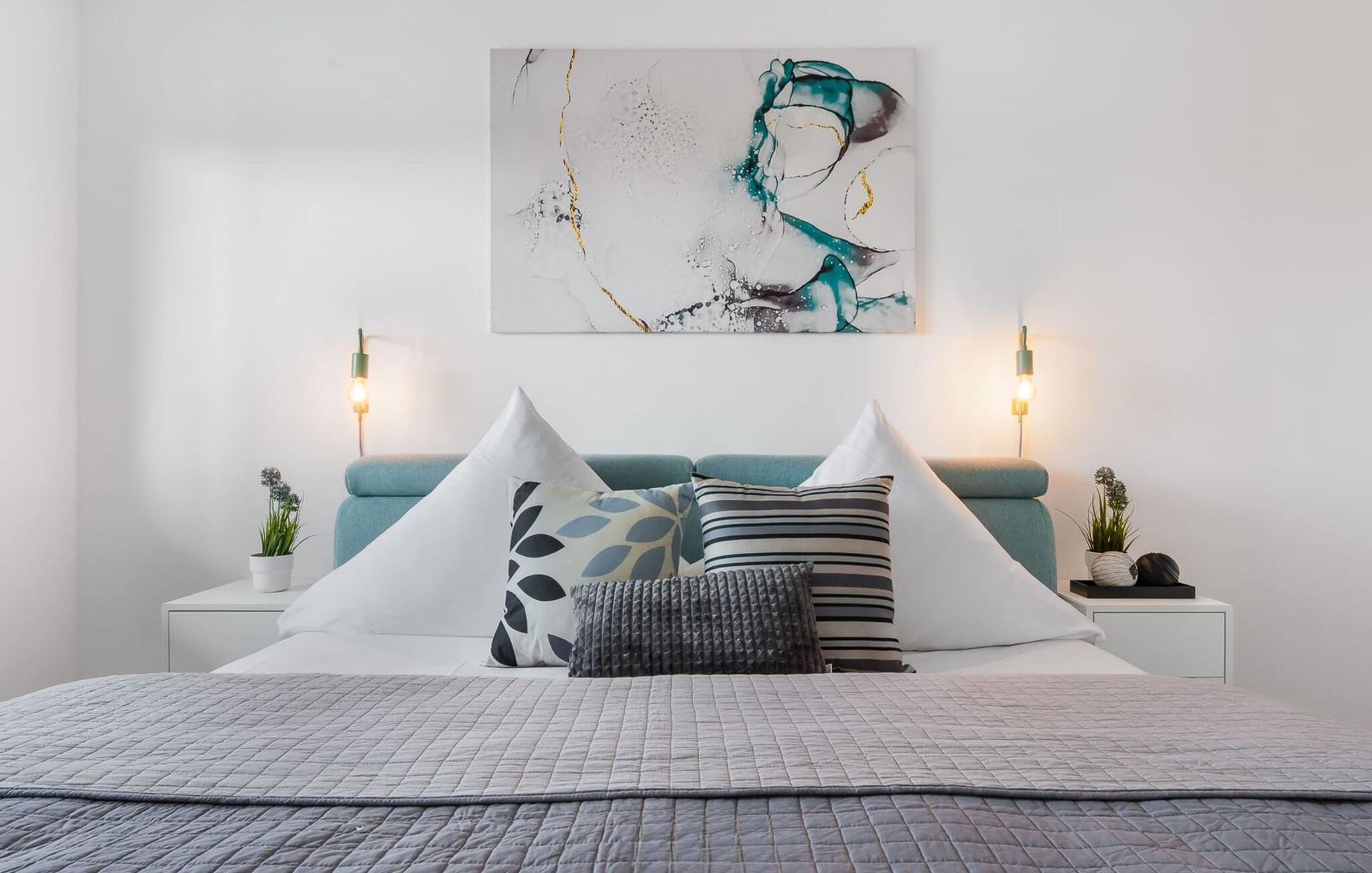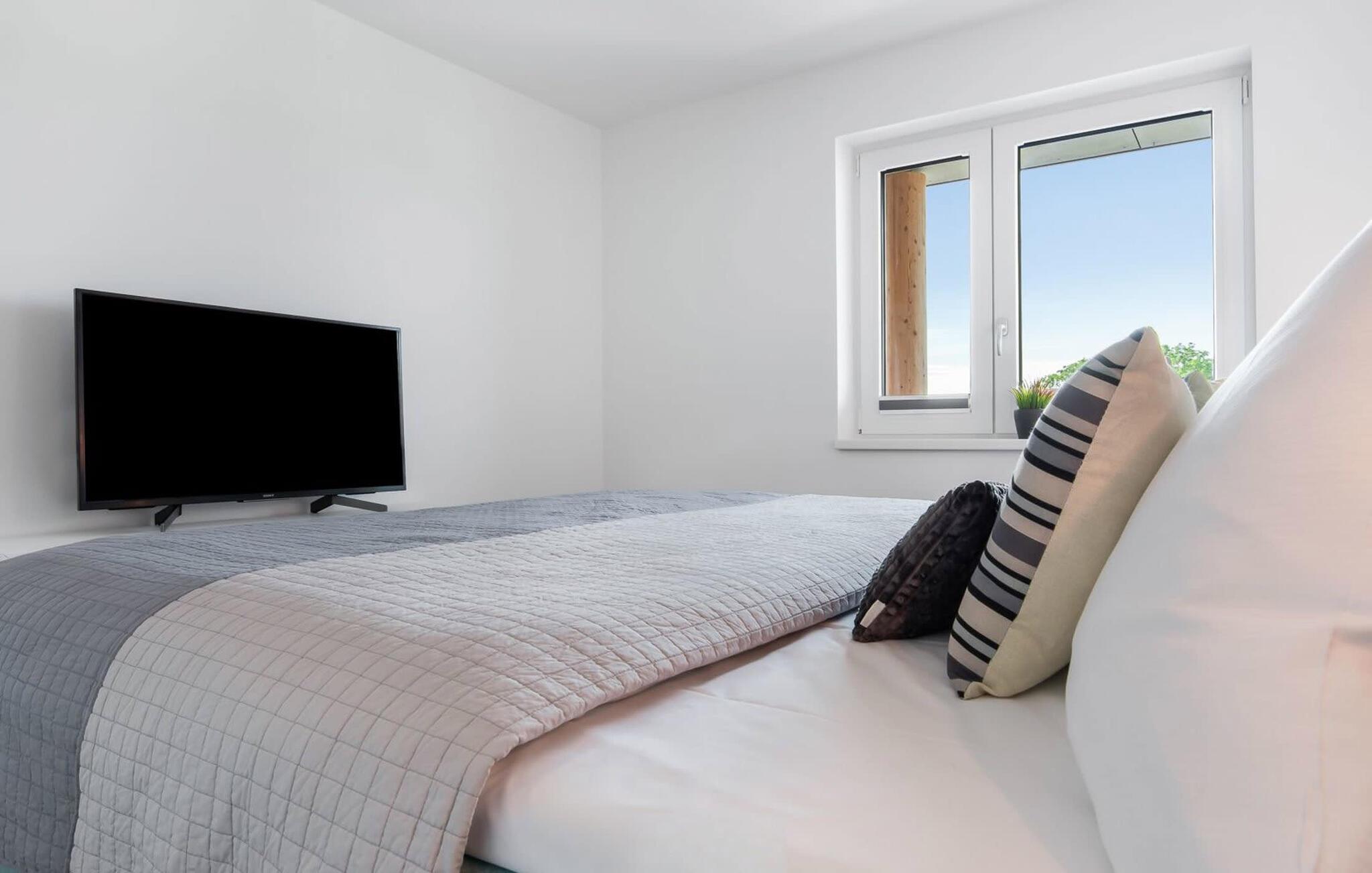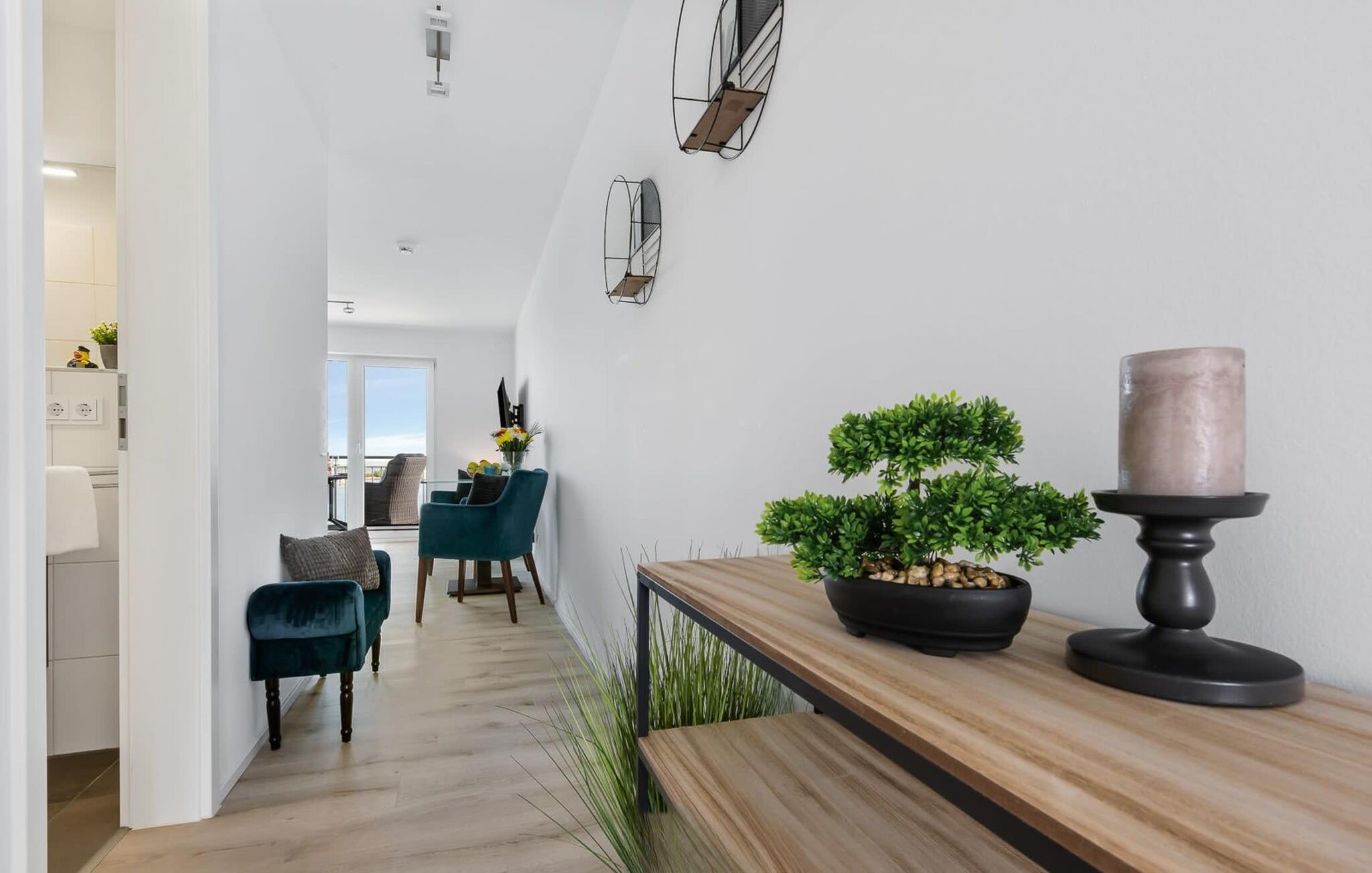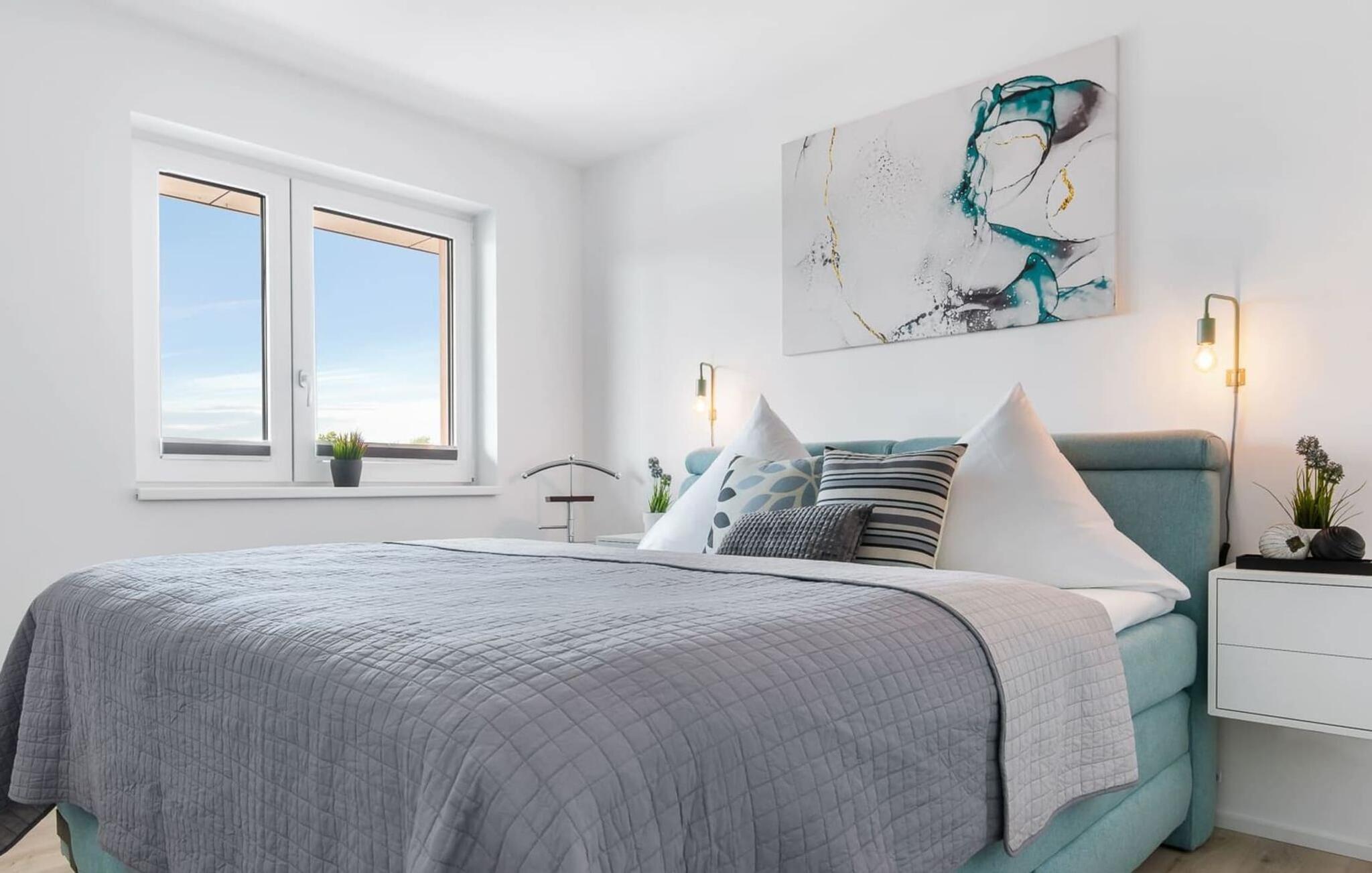 Gennem vinduerne fra gulv til loft og fra balkonen falder udsigten ikke kun på lystbådehavnen og de flydende huse, men også på østersøfjorden Slien og Schimmelünde fyrtårn. Sejlbåde, måger og smukke solnedgange garanterer en ægte feriefølelse.
