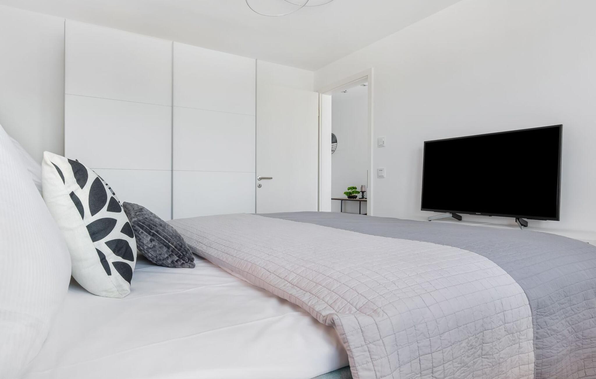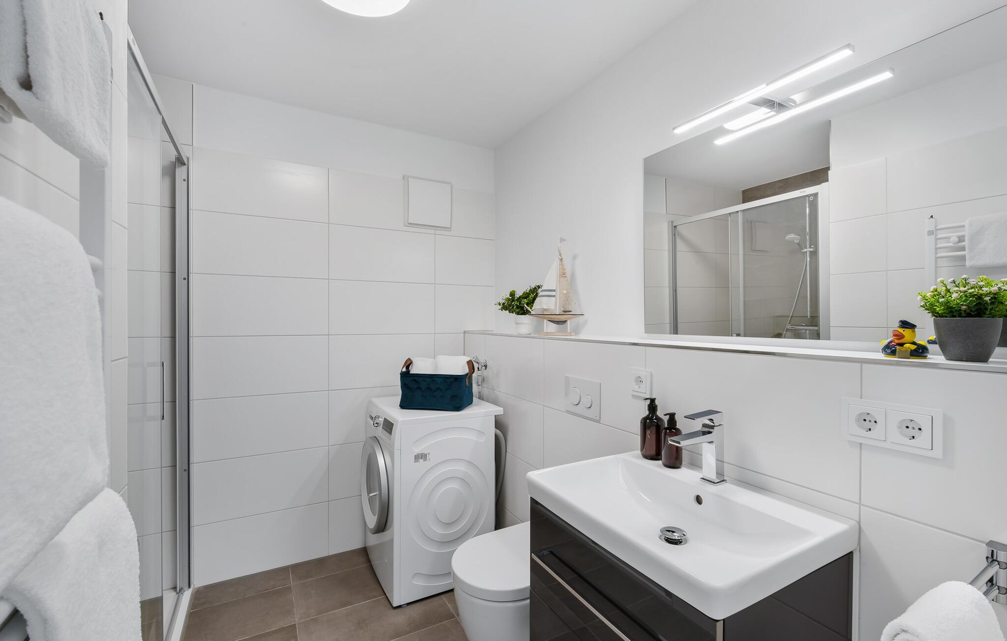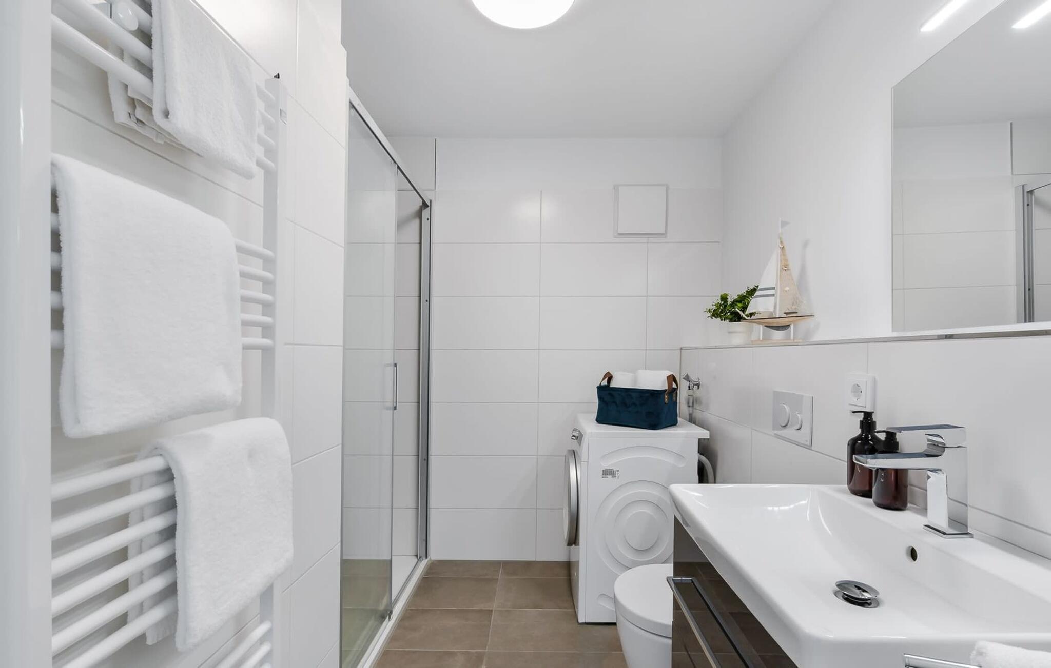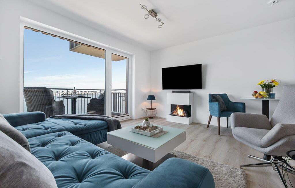 Romantikere pas på: Gulvvarme lover komfort i hver sæson. Opholds-/spiseområdet er særligt hyggeligt takket være den elektriske pejs. Ferielejligheden er oversvømmet med lys, har høj kvalitet møbler og moderne møbler. Bolig- og erhvervsbygningen er opført i skandinavisk stil. Lejlighederne kan nås udefra via arkaderne eller komfortabelt med elevator. Ferielejligheden er designet til at være barrierefri med en stor bruseniche i gulvniveau.