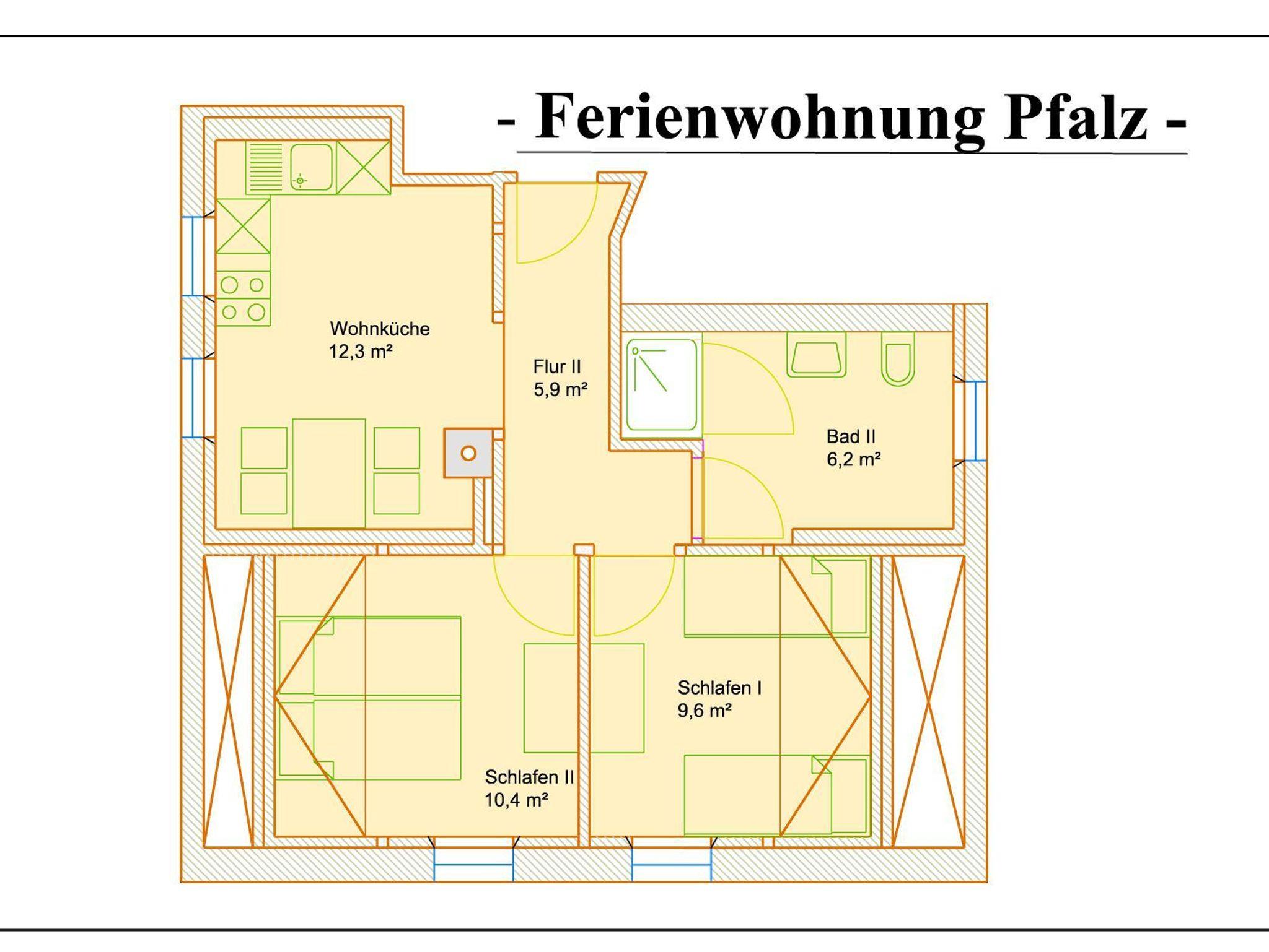 Fröhlich-Daheim, Wohnung Pfalz, WC/Dusch, 2 Schlafzimmer, Wohnküche