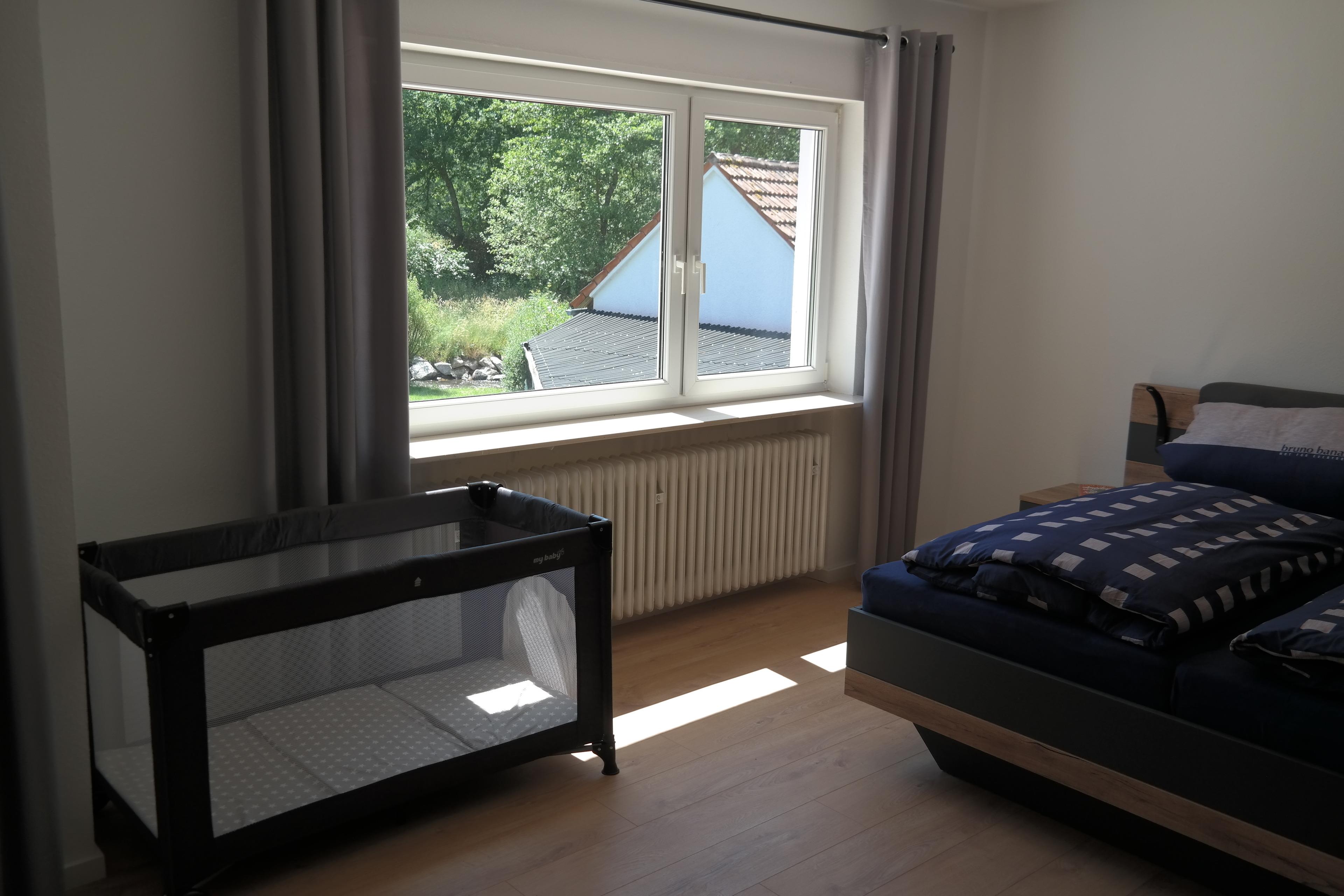 Im großen Schlafzimmer gibt es neben dem Doppelbett (180 cm) noch ein zusätzliches Schlafsofa (140 cm) und ein Babyreisebett. Die Fenster können mit Rollladen komplett abgedunkelt werden.