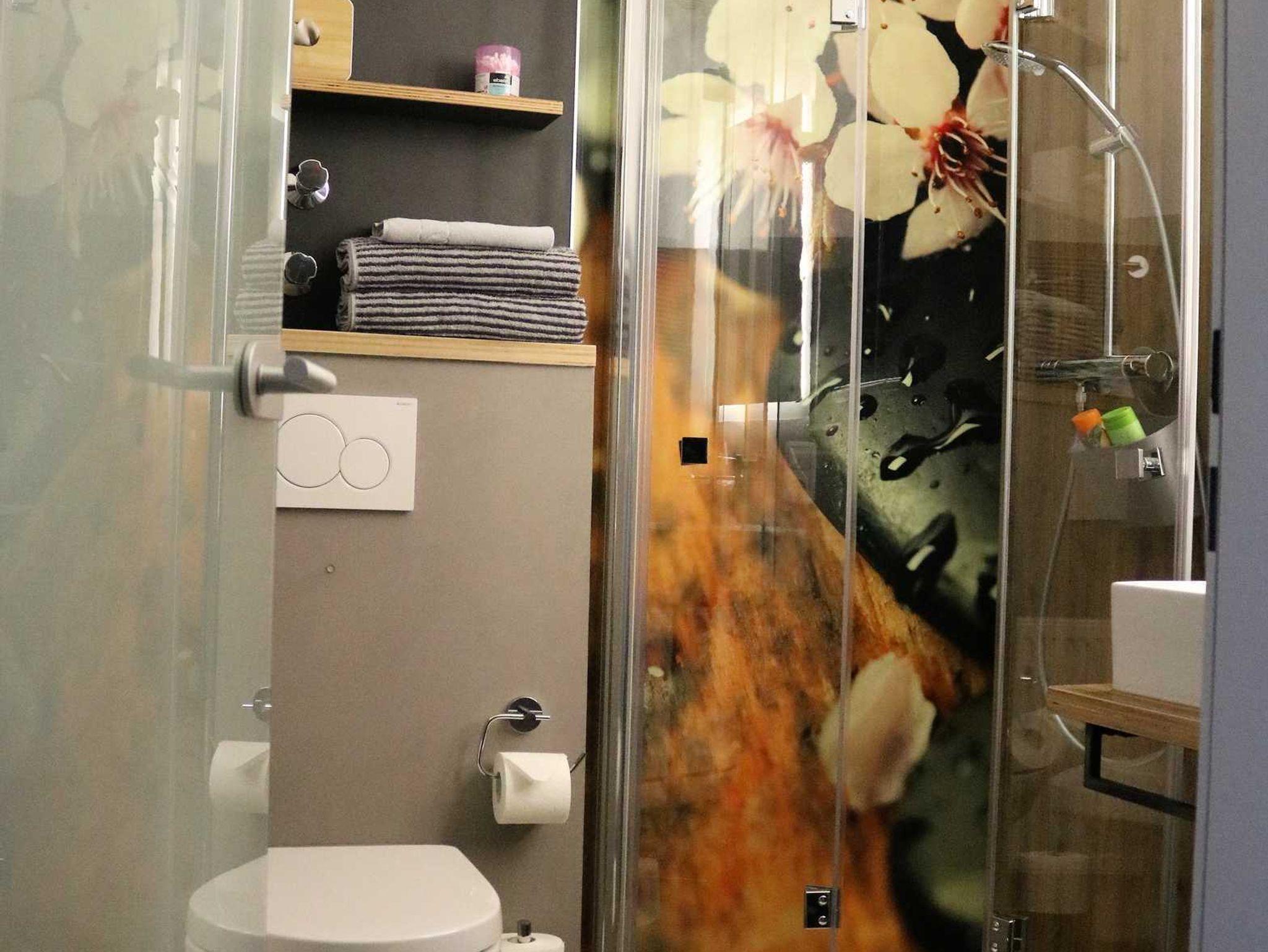 Auch im Bad haben wir alles für einen angenehmen Aufenthalt für Sie vorbereitet. Ein Haartrockner, div. Pflegeprodukte und eine traumhafte bodennahe Dusche mit digitalem Fotodruck warten auf Sie.