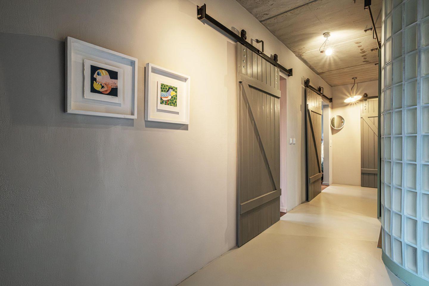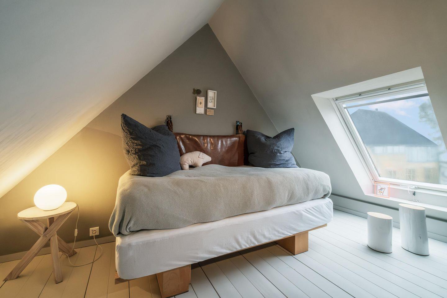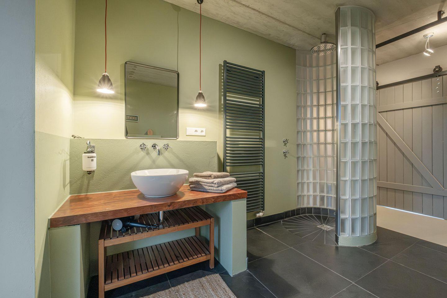 Im Erdgeschoss befinden sich die beiden Schlafzimmer mit komfortablen Doppelbetten und jeweils mit Terrassenzugang. Im blauen Schlafzimmer ist die Matratze 140 x 200 cm und im rosa Schlafzimmer 160 x 200 cm. Außerdem liegt im EG das außergewöhnliche Badezimmer mit gusseiserner Badewanne und Glas-Stein-Dusche – ein echter Hingucker. Bad und Schlafzimmer liegen gegenüber von einander und sind mit stylischen Holzschiebetüren (Achtung: hellhörig) ausgestattet.