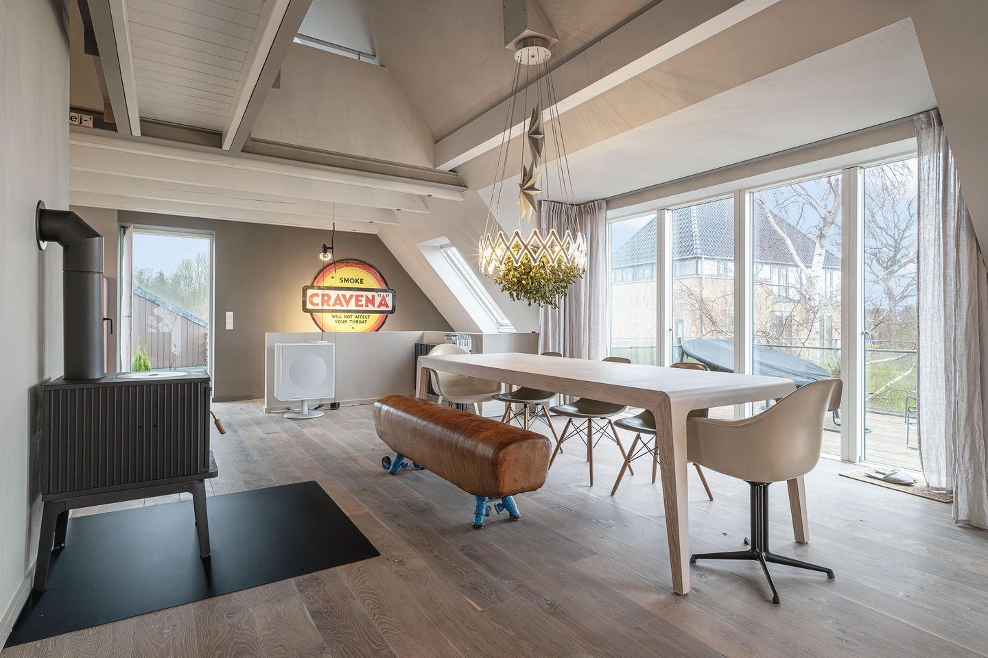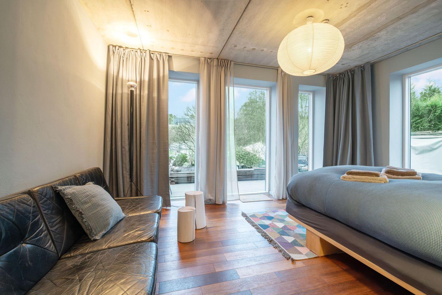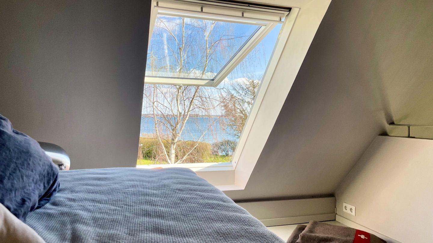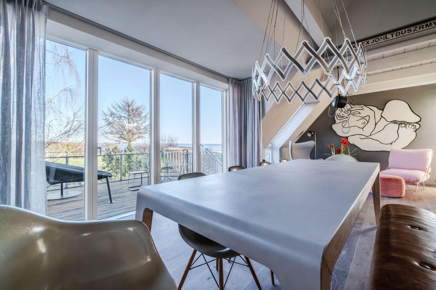 Der großzügige Wohnbereich mit Rund-Um-Meerblick liegt im Obergeschoss und hält eine große, umfangreich ausgestattete Küche, einen Holzofen und eine gemütliche Sofa-TV-Ecke bereit. Der lange Esstisch, der das Zentrum des Wohnbereiches bildet, bietet nicht nur das perfekte Setting, um in geselliger Runde zu tafeln, sondern auch für Spieleabende und lange Gespräche. Genießt hier gemeinsame Stunden mit Blick auf die Flensburger Förde. Von hier aus gelangt man auch auf die erhöhte Terrasse mit Blick auf die Ostsee. Auf den Terrassen rund ums Haus gibt es Platz für jede Tageszeit. Im Haus bietet eine Galerie über dem Wohnbereich, Platz für Workation oder eine Mittagsstunde.
