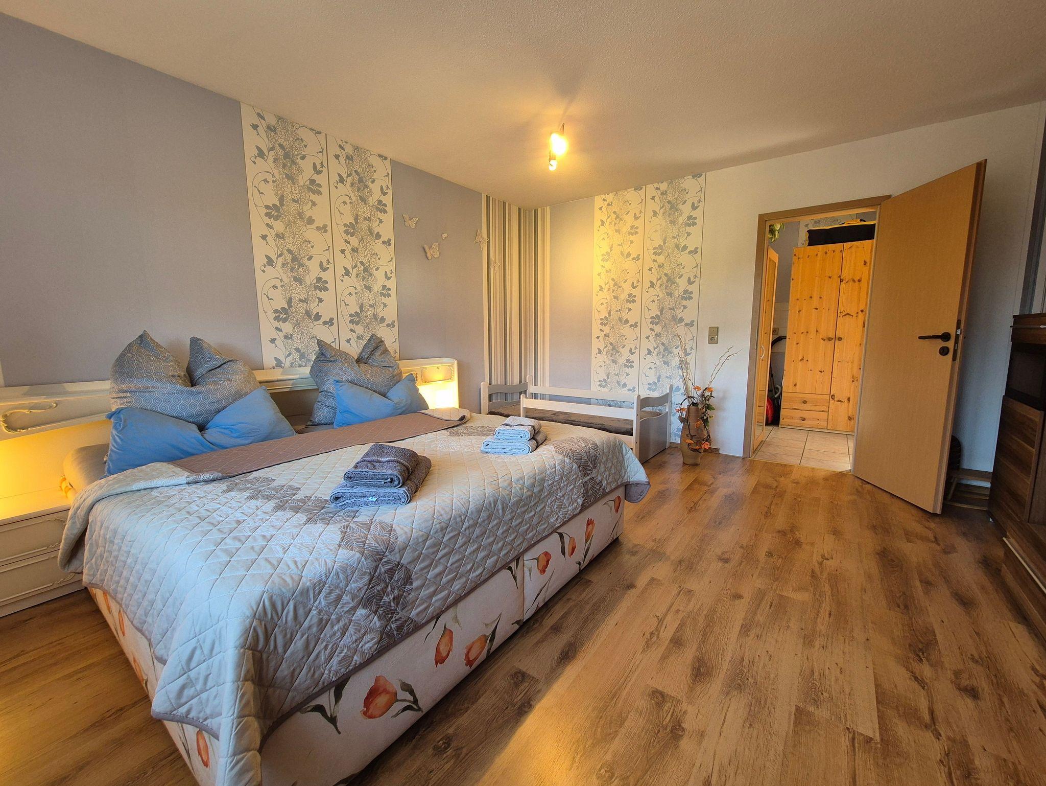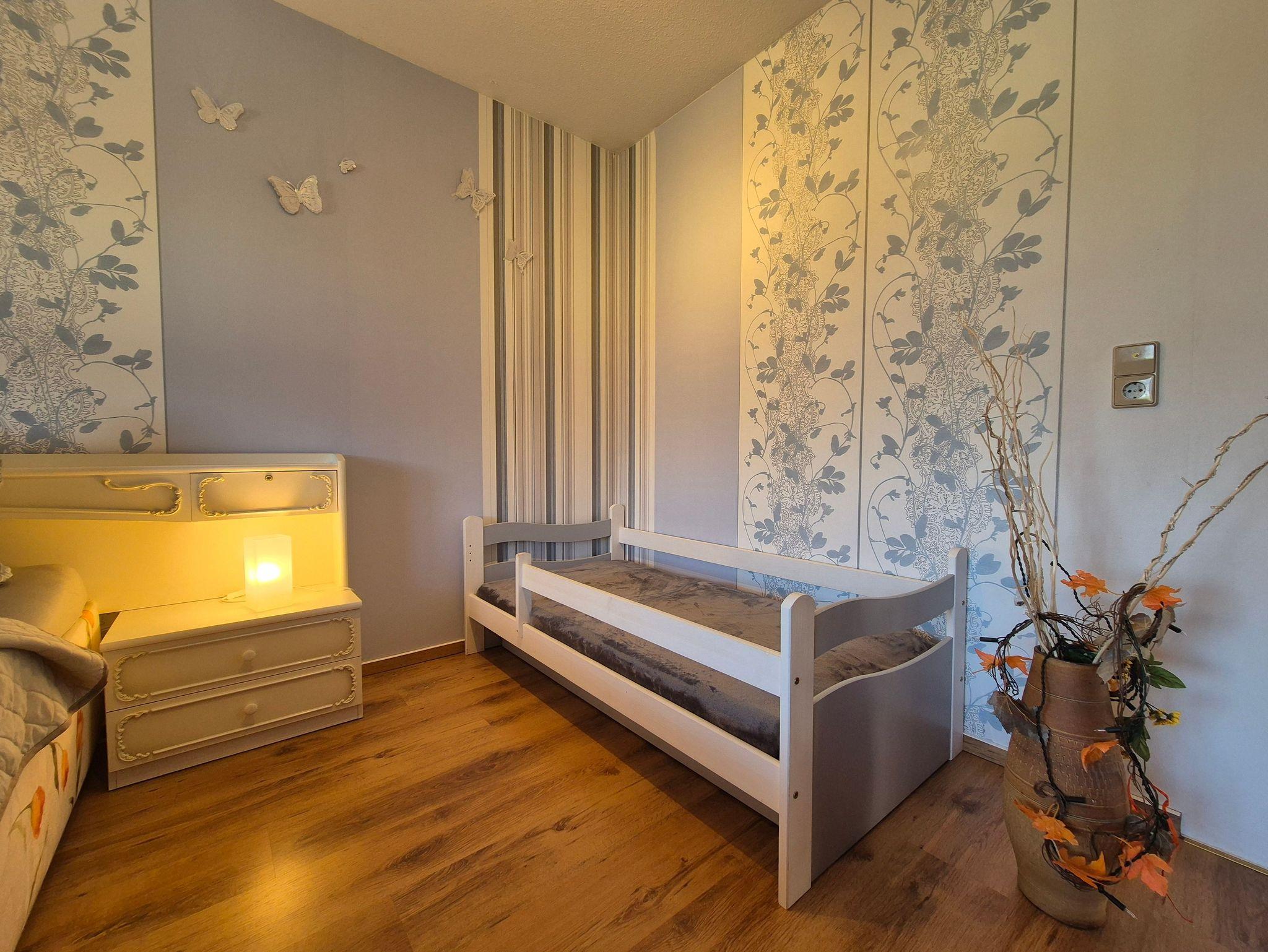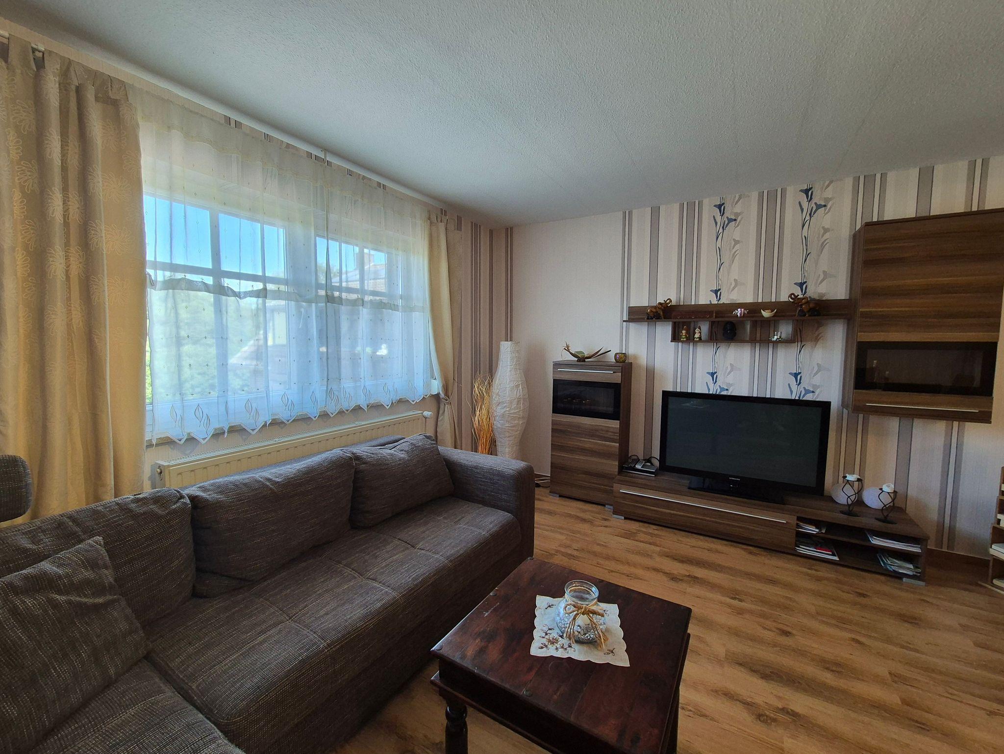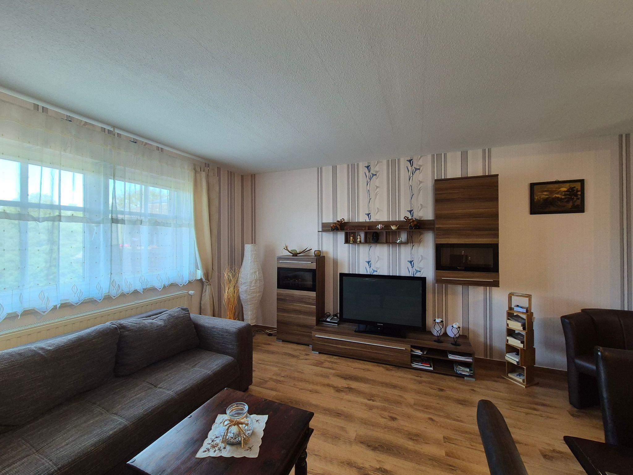 Die Ferienwohnung selbst bietet Ihnen ein komfortables Wohnzimmer mit einer Eckschlafcouch für zwei Personen, einen Esstisch, eine kleine Anbauwand, einen Flachbild-TV und eine offene Wohnküche. Die Einbauküche ist vollständig ausgestattet mit allen wichtigen technischen Geräten wie Geschirrspüler, Backofen, Herd und vielem mehr. Das Schlafzimmer verfügt über ein gemütliches Doppelbett, ein Kinderbett (160 cm lang x 80 cm breit), eine kleine Anbauwand und einen weiteren Flachbild-TV. Im kleinen Tageslicht-Badezimmer finden Sie eine Dusche, einen Waschtisch und ein WC.