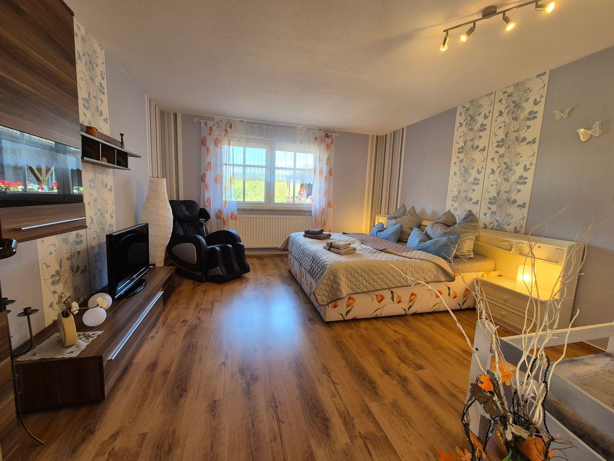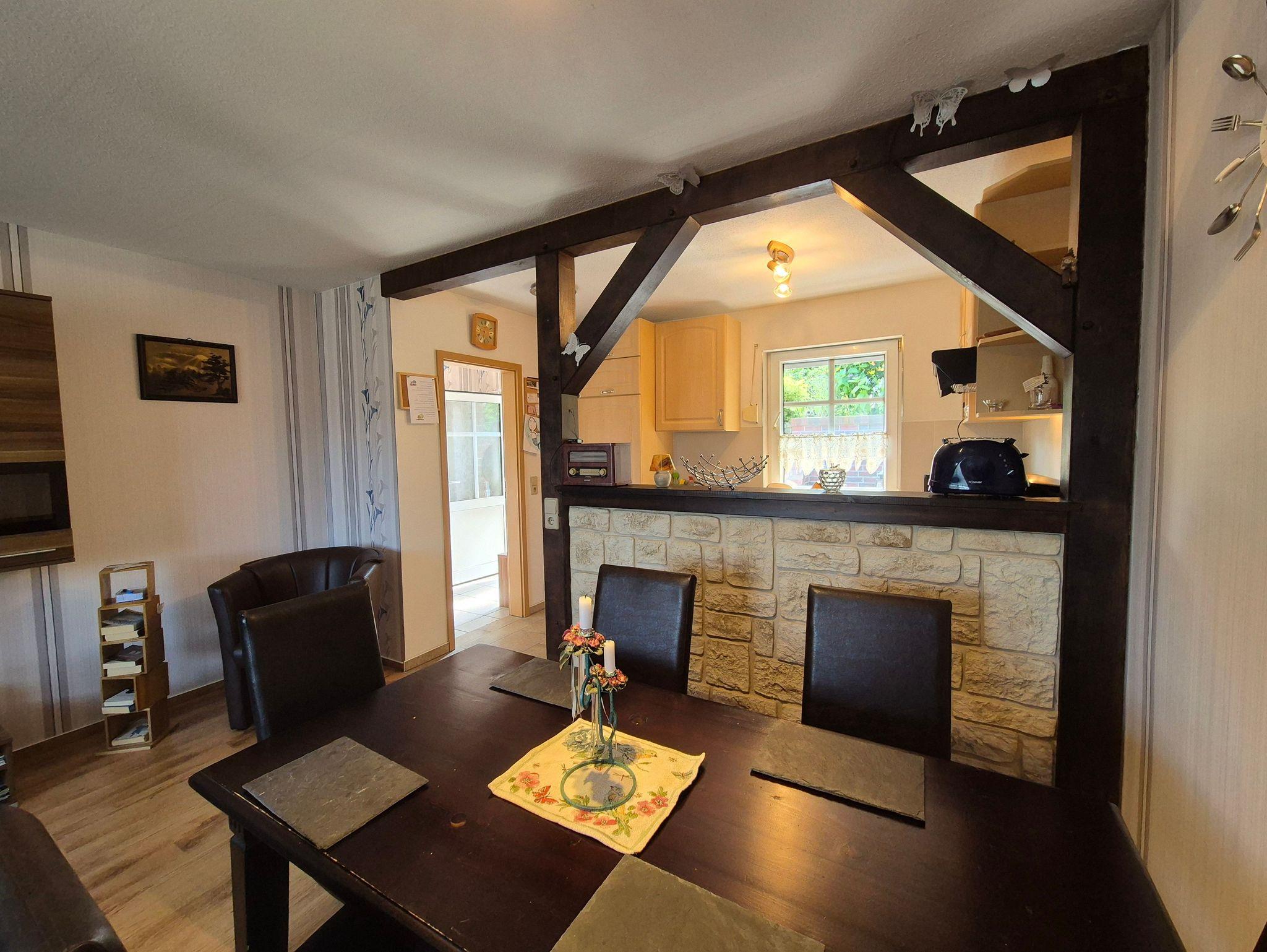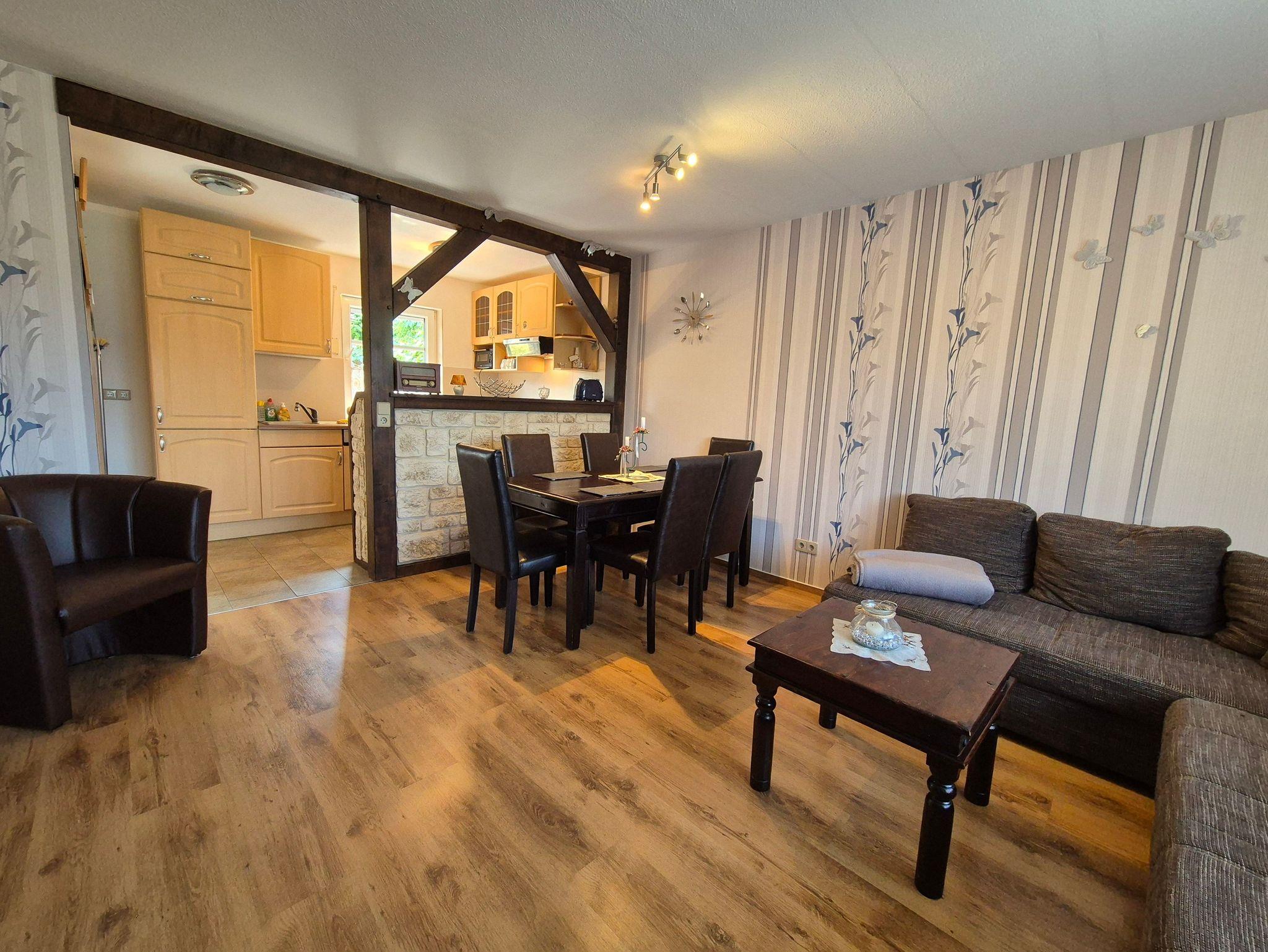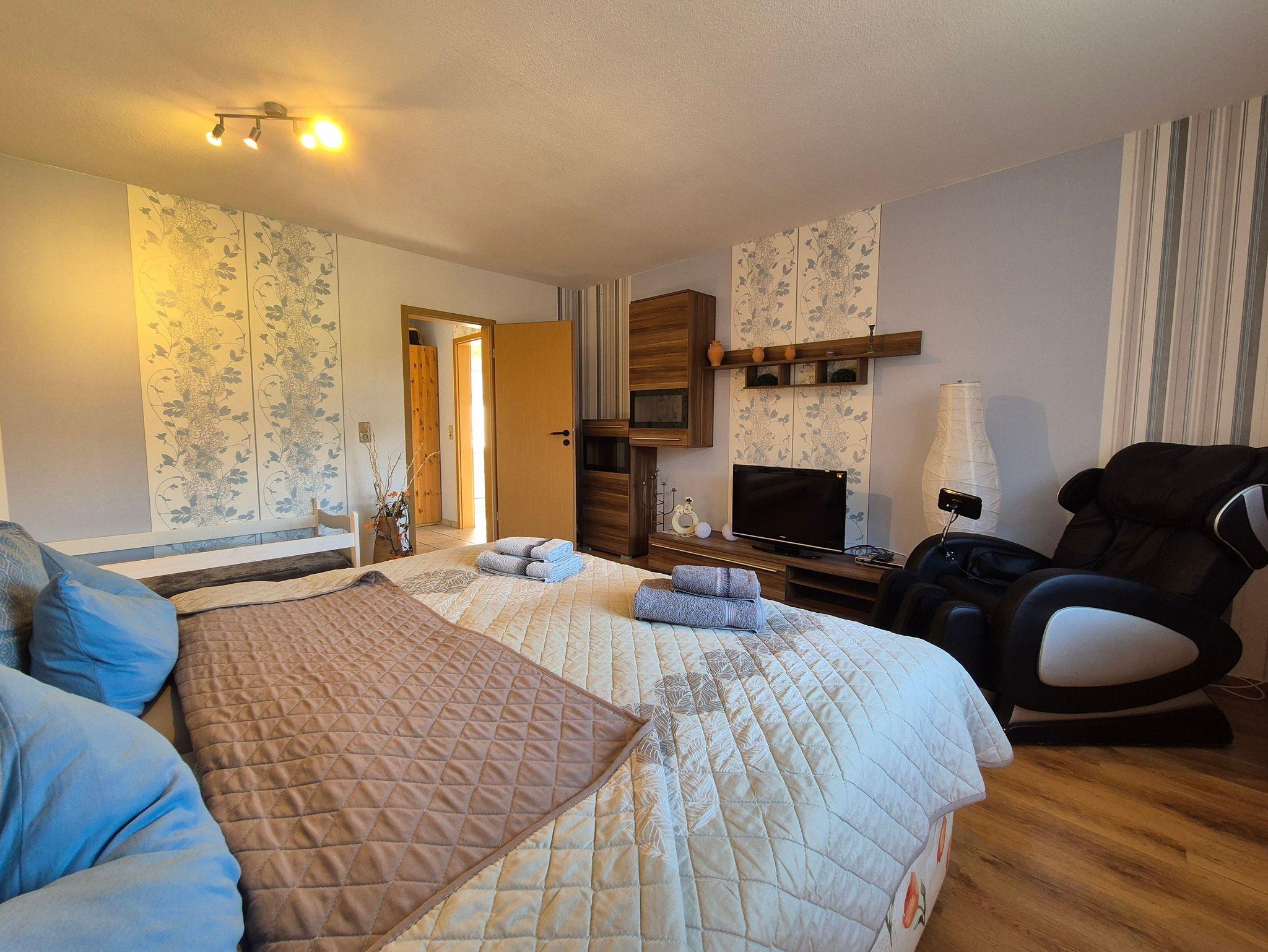 Die Ferienwohnung selbst bietet Ihnen ein komfortables Wohnzimmer mit einer Eckschlafcouch für zwei Personen, einen Esstisch, eine kleine Anbauwand, einen Flachbild-TV und eine offene Wohnküche. Die Einbauküche ist vollständig ausgestattet mit allen wichtigen technischen Geräten wie Geschirrspüler, Backofen, Herd und vielem mehr. Das Schlafzimmer verfügt über ein gemütliches Doppelbett, ein Kinderbett (160 cm lang x 80 cm breit), eine kleine Anbauwand und einen weiteren Flachbild-TV. Im kleinen Tageslicht-Badezimmer finden Sie eine Dusche, einen Waschtisch und ein WC.