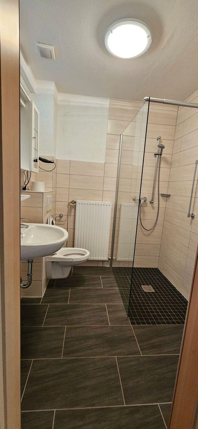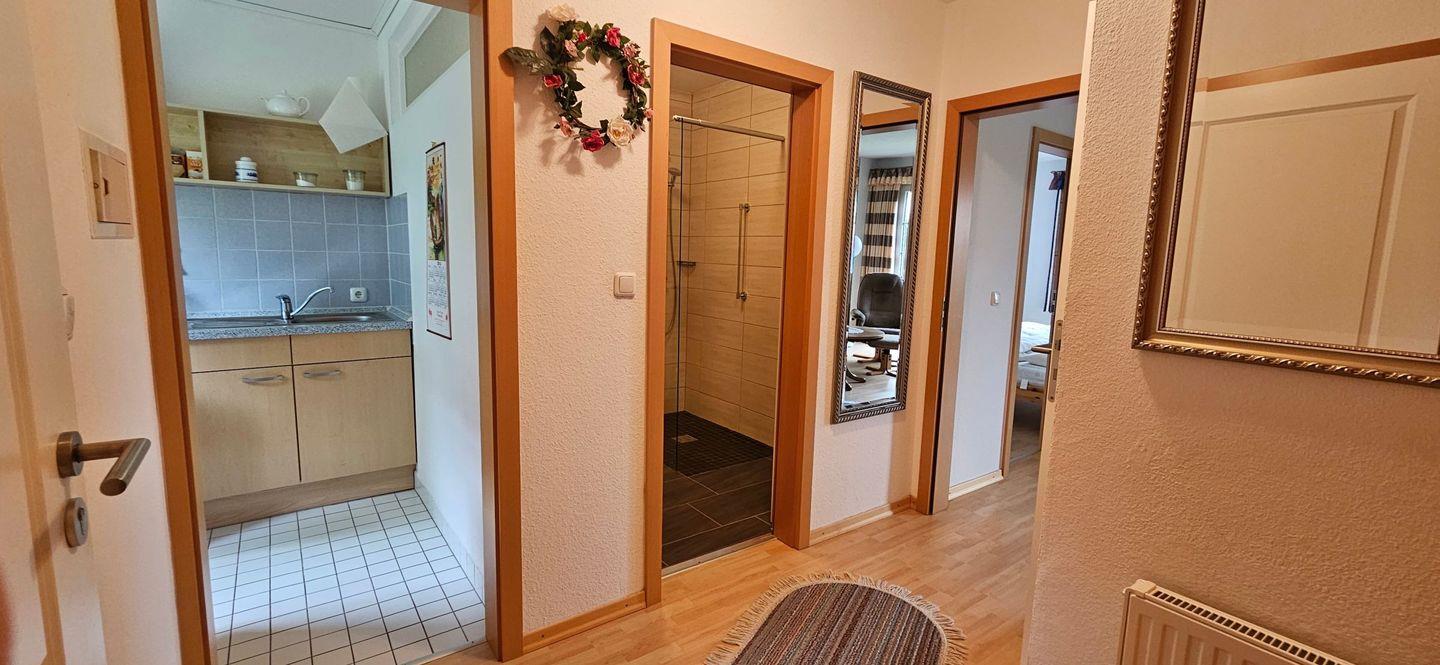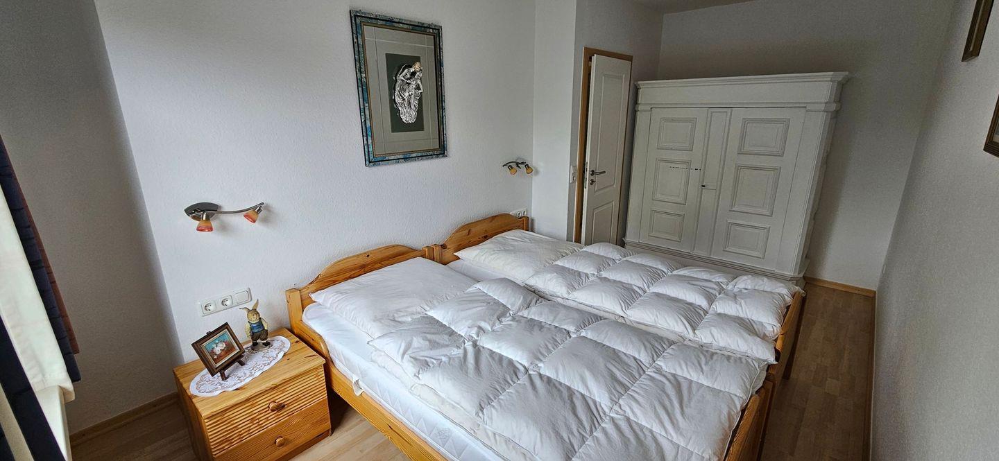 Die Fewo Esche 1 bietet einen ruhigen Schlafbereich mit einem komfortablen Schlafzimmer, das ausreichend Platz für bis zu vier Personen bietet. Hier können Sie nach einem aufregenden Tag in der Natur entspannen und neue Energie tanken. Das Badezimmer ist modern gestaltet und verfügt über eine bodengleiche Dusche, ein WC, ein Waschbecken sowie praktische Annehmlichkeiten wie einen Haartrockner.