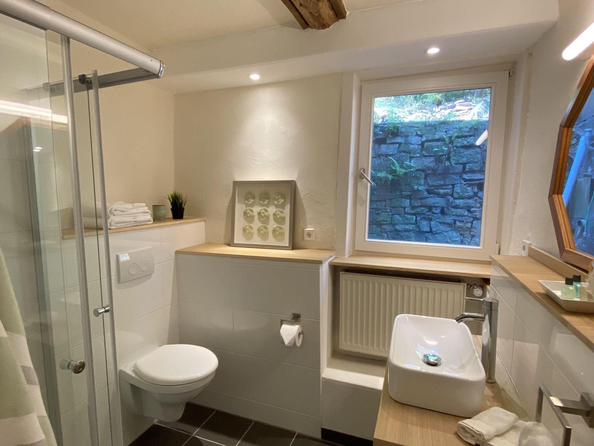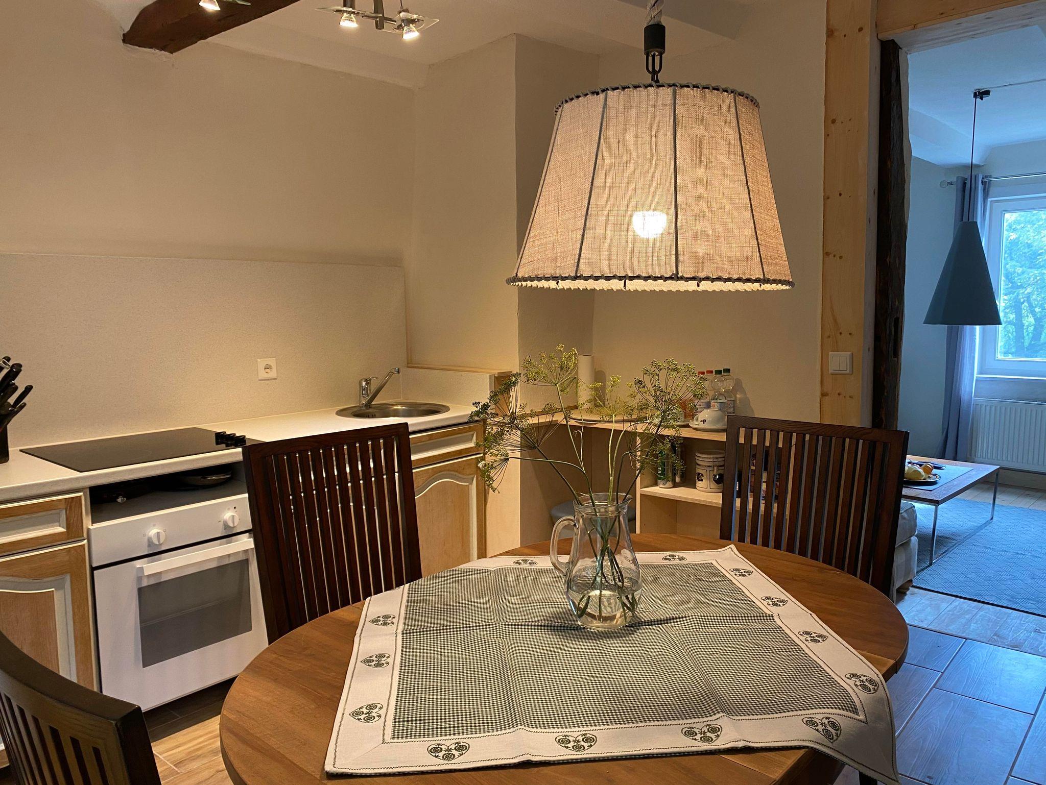 Freut Euch auf ein stilvolles Ambiente mit einem gemütlichen Schlafzimmer, ausgestattet mit einem komfortablen Kingsize-Bett (1,80 x 2,00 m inkl. Bettwäsche) und einem separaten Wohnzimmer mit Schlafcouch (Doppelbett inkl. Bettwäsche). Die offene Küche ist mit allem ausgestattet, was Ihr braucht, darunter ein Ceran-Kochfeld, ein Backofen und ein Kühl-/Gefrierschrank. Der angrenzende Essbereich bietet Platz für 4 Personen – perfekt für gesellige Mahlzeiten. Das Badezimmer ist mit hochwertigen Handtüchern, einem Fön sowie Seife und Duschgel ausgestattet – hier könnt Ihr den Tag erfrischt beginnen. Genießt die ruhige Atmosphäre auf unserer geschützten Garten-Terrasse mit Liegen und gemütlichen Sitzmöglichkeiten – der ideale Ort zum Entspannen. Frühstück – Genuss von Anfang an Der Übernachtungspreis umfasst die Wohnung, jedoch nicht das Frühstück. Auf Wunsch könnt Ihr unser köstliches Frühstück dazu buchen. Wir servieren es täglich von 8:00 bis 10:00 Uhr – solltet Ihr früher aufbrechen müssen, gebt uns einfach am Vorabend Bescheid. Unser Frühstück bietet Euch alles, was Ihr für einen guten Start in den Tag braucht: frisches Brot, selbst gemachte Marmelade, regionaler Honig, frische Rühreier, Bio-Käse, luftgetrockneter Schinken, Stracke-Wurst sowie Joghurt und Müsli aus Bio-Produkten. Ein wahrer Genuss für nur 9,50 Euro pro Person. Für aktive Gäste: Fahrräder zur Miete Für unsere Gäste, die ohne Fahrräder anreisen, halten wir 4 hochwertige Räder zur Miete bereit, damit Ihr die Umgebung bequem erkunden könnt. Unsere Stube – Gemütlichkeit und regionale Köstlichkeiten Direkt gegenüber erwartet Euch unsere „Stube“ – ein einladender Raum, um den Tag ausklingen zu lassen. Morgens könnt Ihr Euch hier bei unserem Frühstück mit Bio-Produkten stärken. Nach einem erlebnisreichen Tag laden wir Euch ein, bei selbst gebackenem Kuchen, frisch gebrühtem Kaffee und Bio-Tee zu verweilen. Wenn Ihr Lust auf eine herzhaftes Brotzeit habt, genießt regionale Bio-Käse und Wurst auf der Terrasse. Für den entspannten Abend bieten wir eine Auswahl an ausgesuchten Weinen und kühlem Bier, die immer für Euch bereitstehen. Und an den Wochenenden sowie an speziellen Tagen bieten wir unseren beliebten Grill- / Barbecue-Abend – perfekt für gesellige Stunden!