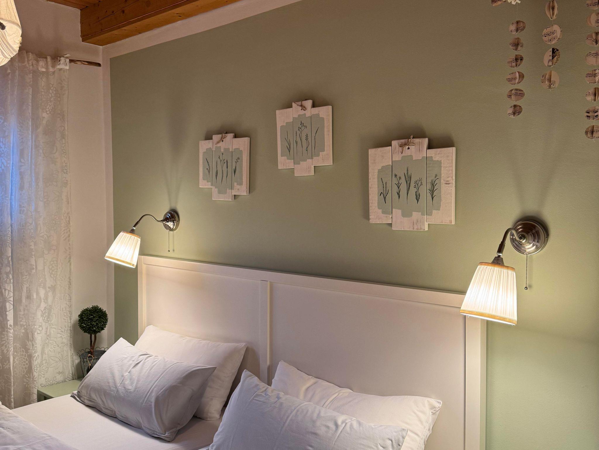 Schlafzimmer mit bezugfertigem Doppelbett (180x200cm, ohne Fußteil), welches durch seine zarten Farben und liebevollen Highlights zur Entspannung einlädt.
