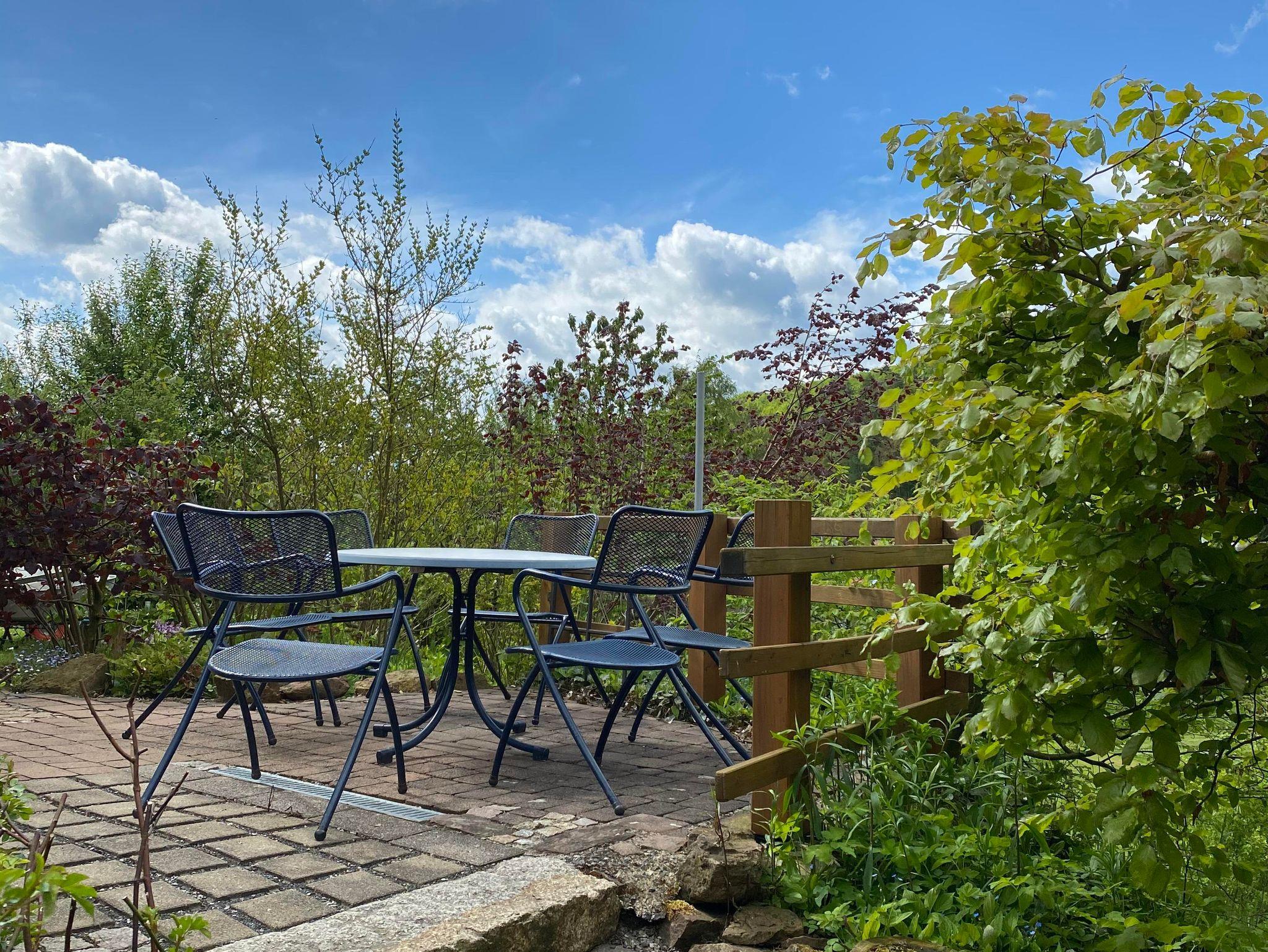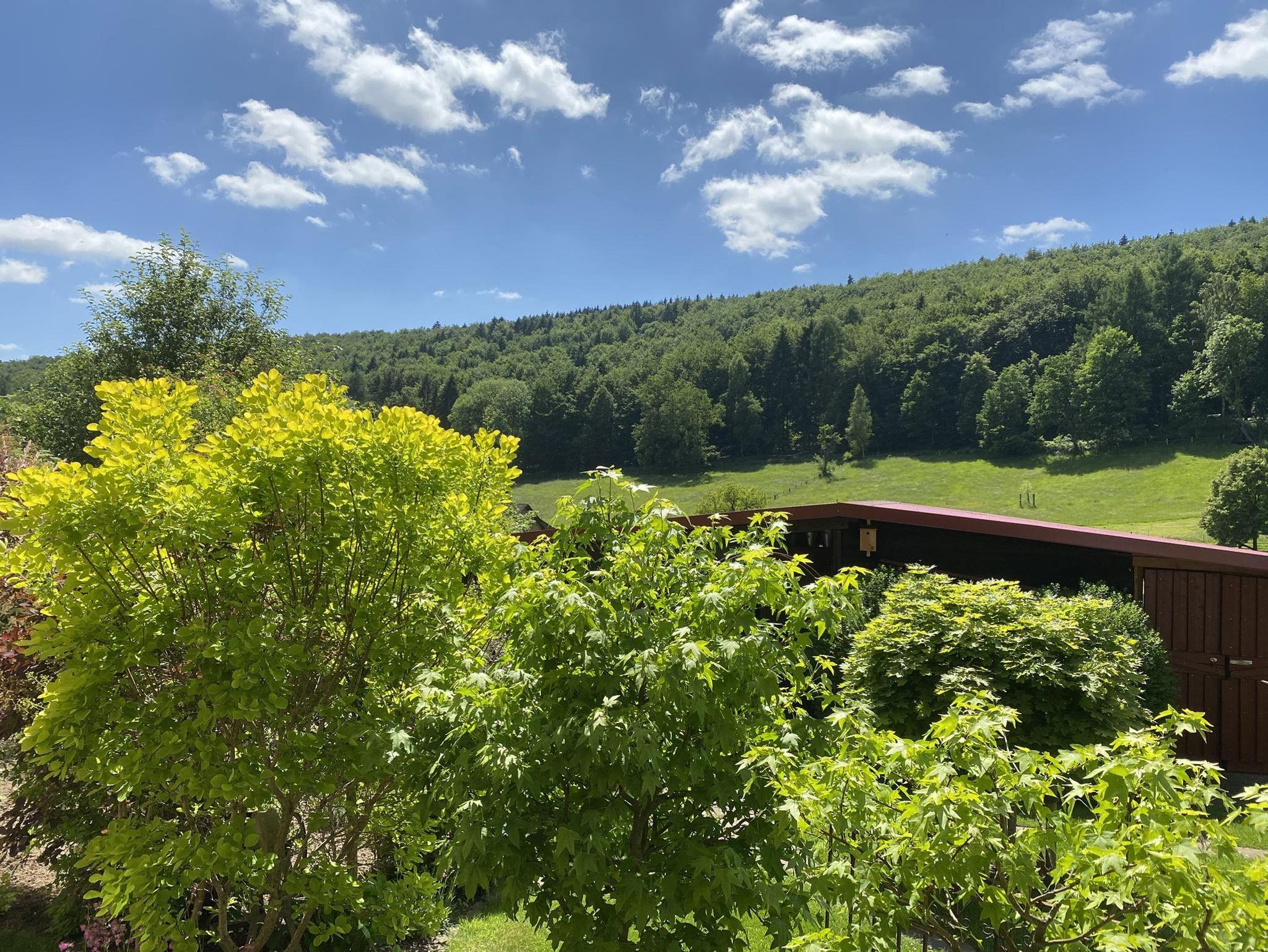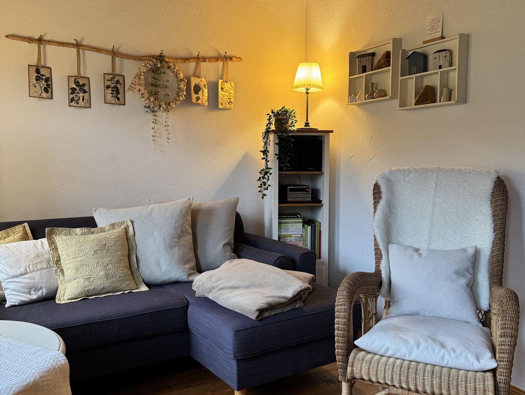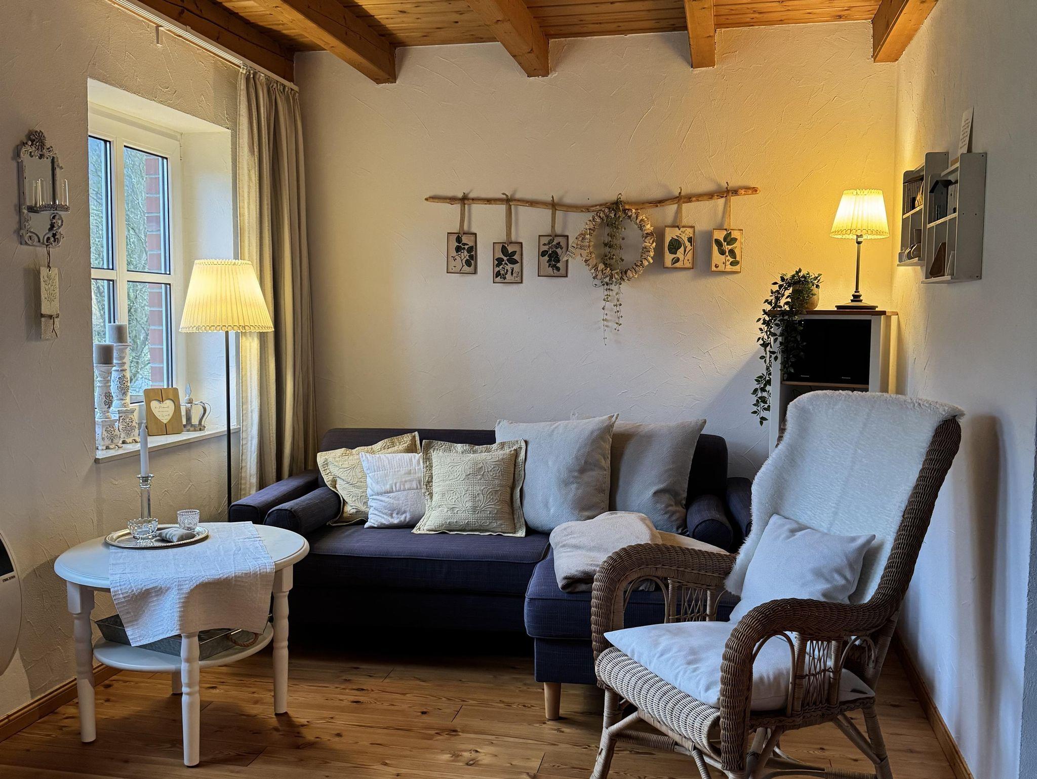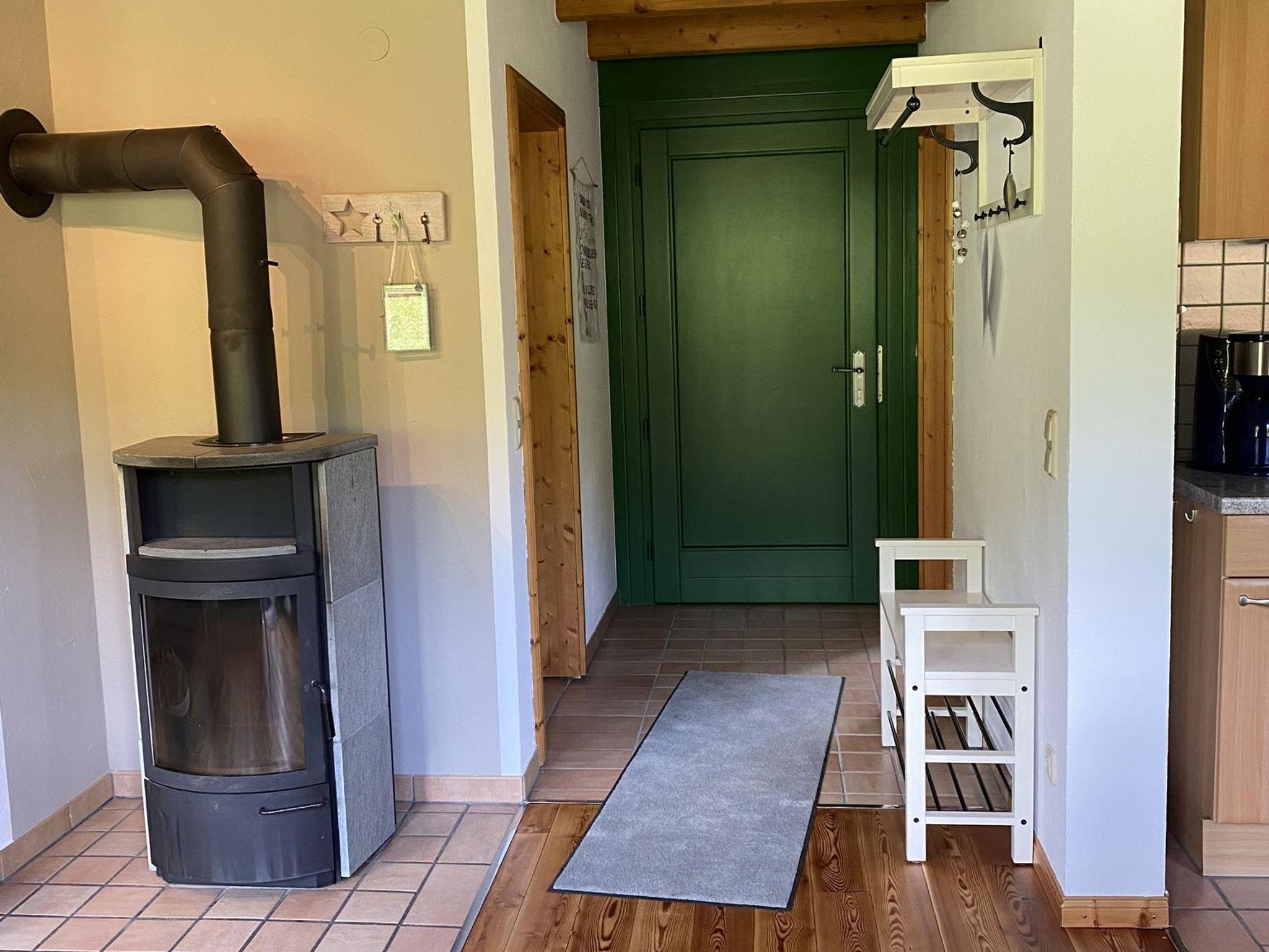 Leicht am Hang gelegen, empfängt das Ferienhaus mit 55m², seine Gäste mit einer sehr gemütlichen Atmosphäre, Dielenboden, offenen Küchen-, Ess- und Wohnbereich, Sofa für zwei Personen und Korbsessel; SAT-TV und Musikanlage. Abgerundet durch den Kaminofen und direktem Zutritt zum Balkon, mit teils überdachter Sitzecke, zwei Liegestühlen und freier Sicht auf Wiesen und Wald.