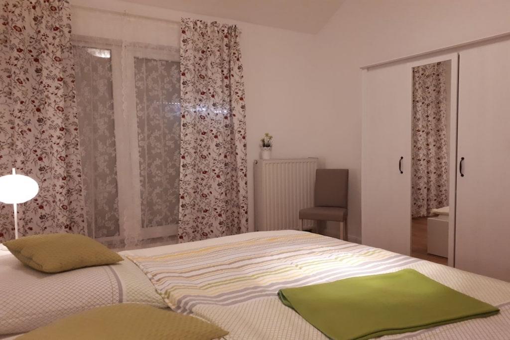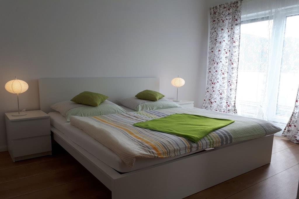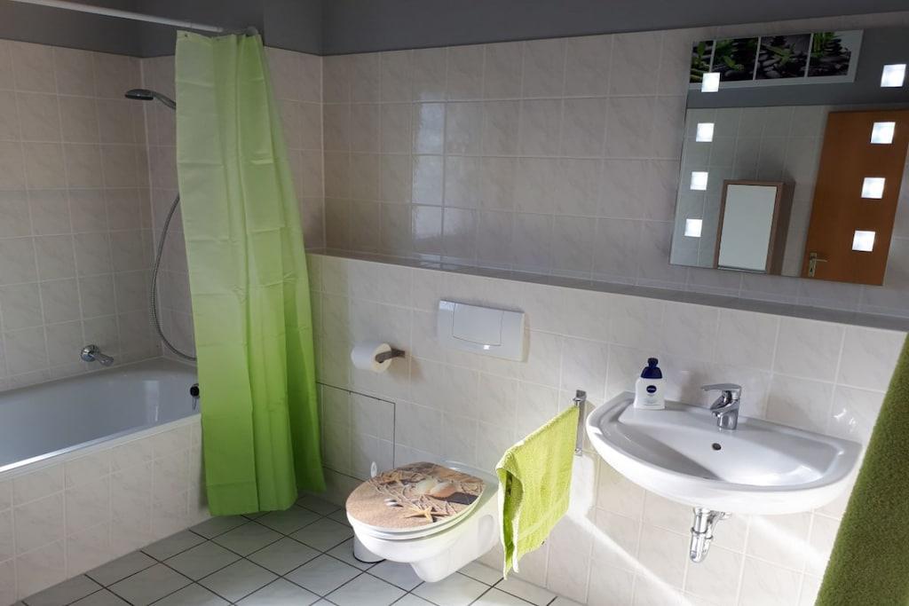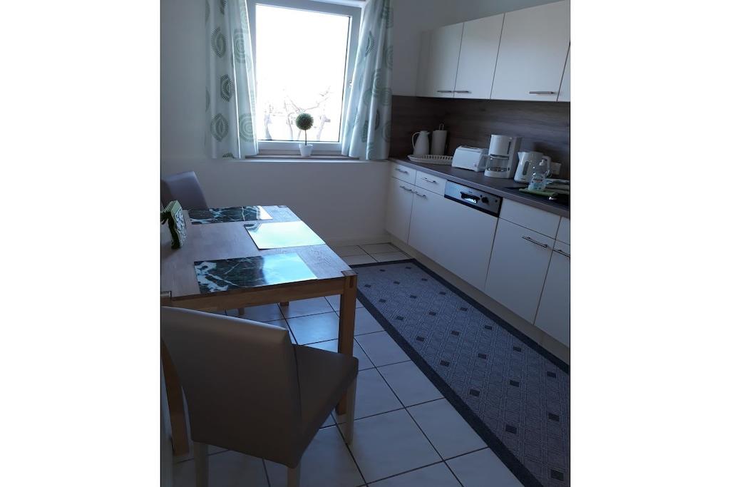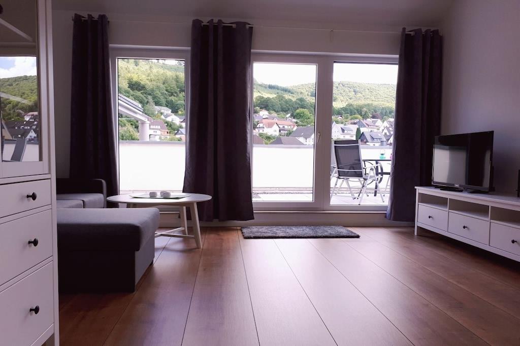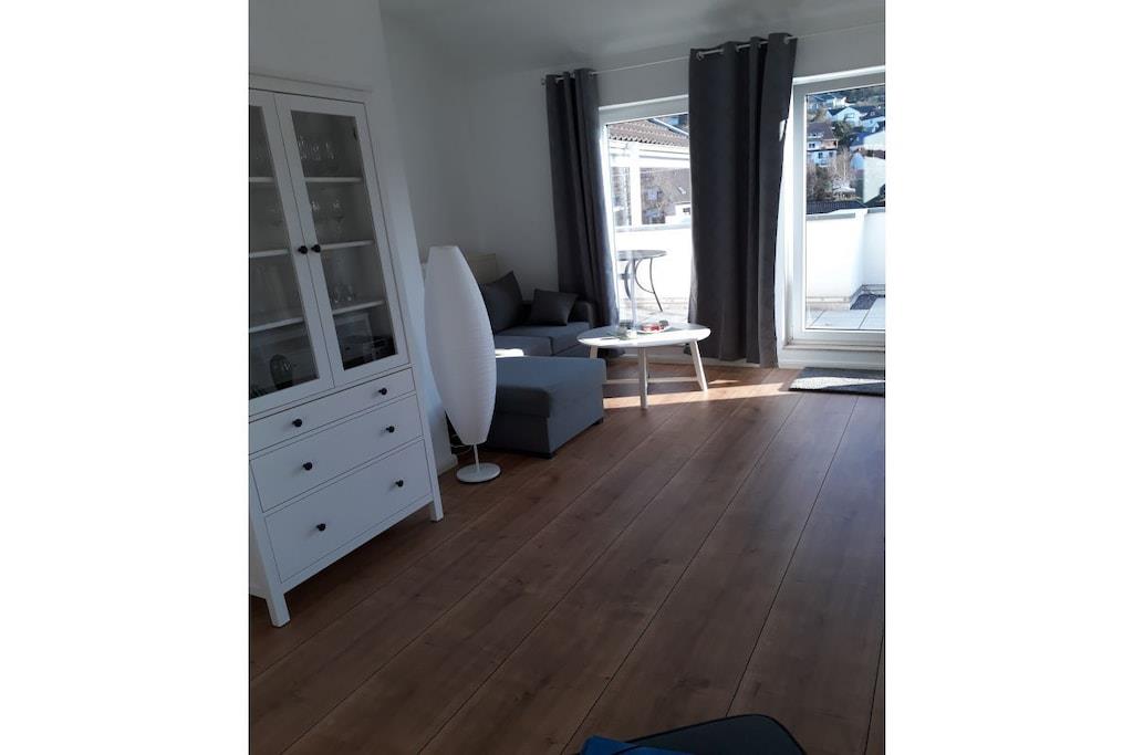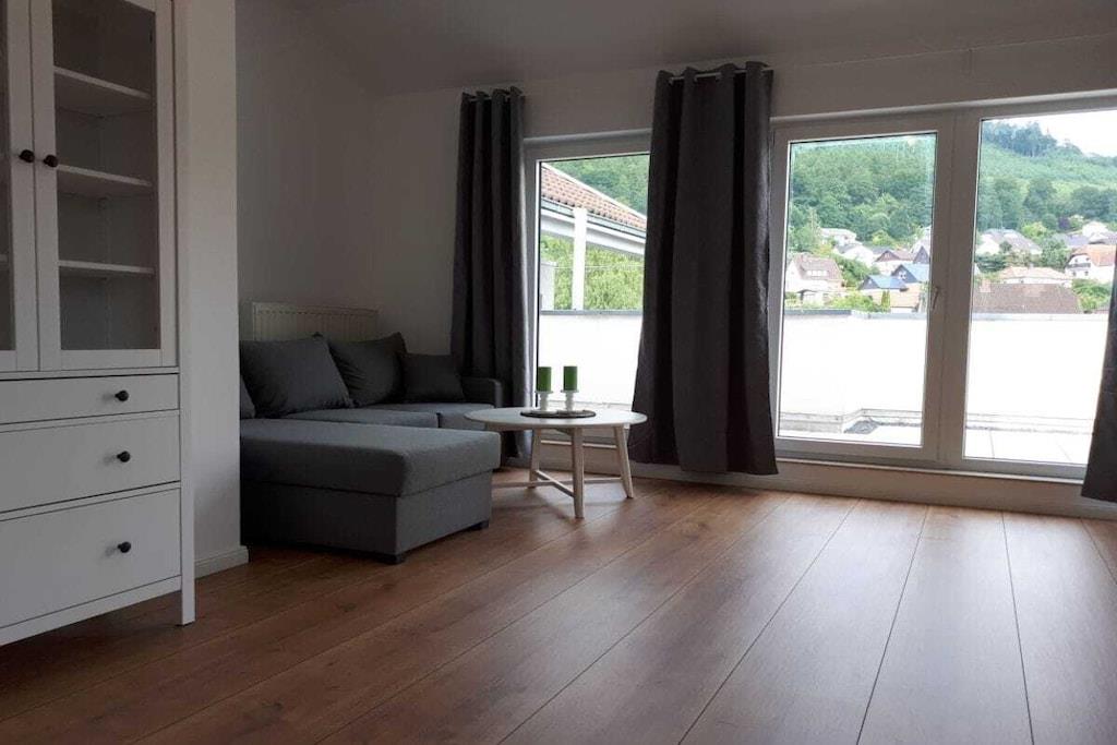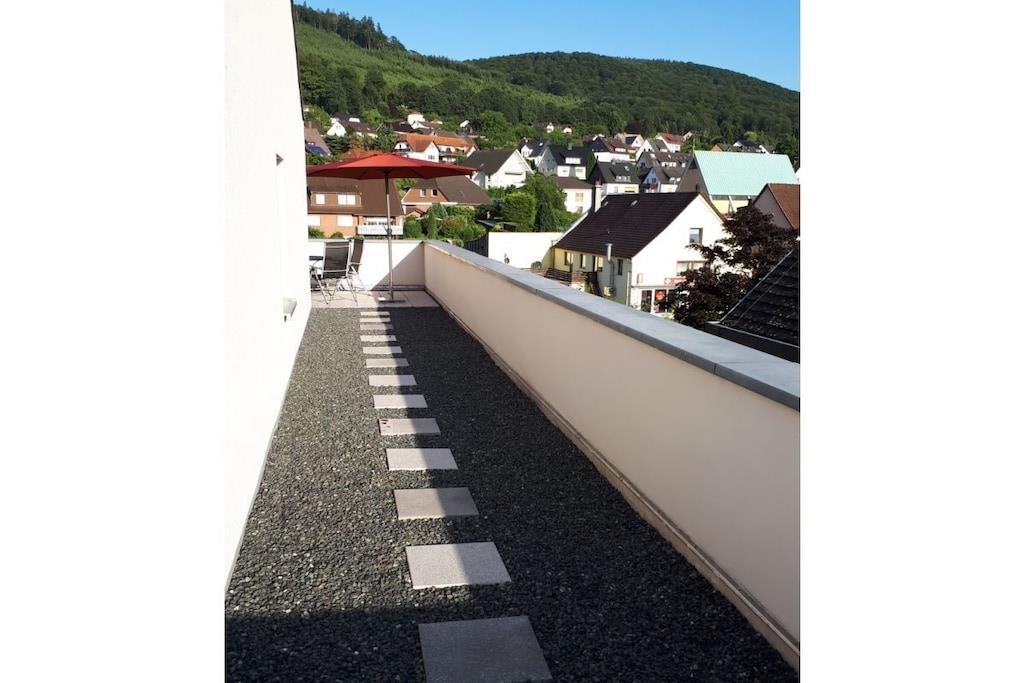 Das Herzstück dieser Wohnung ist die umlaufende Dachterrasse die zum einen den herrlichen Blick auf die Weser und die Altstadt Bodenwerder bietet, und zur anderen Seite der direkte Blick auf die am Hang gelegenen Häuser in Bodenwerder . Die Einrichtung der Wohnung ist modern, aber sehr gemütlich gehalten. Das Schlafzimmer ausgestattet mit einem Doppelbett ( 180cm breit ) und Flachbildfernseher lädt dazu ein den Tag geruhsam zu beginnen. Das Wohnzimmer ist die perfekte Ruheoase mit Flachbildfernsehen gemütlicher Couch und direkter Zugang zur großen Dachterrasse. Die Küche ist komplett ausgestattet mit Ceran-Kochfeld, Backofen, Spülmaschine und Kühlschrank mit Gefrierkombination. Toaster und andere Küchengeräte runden dieses ab. Der perfekte Ort um ihr Urlaubs-Dinner zuzubereiten.