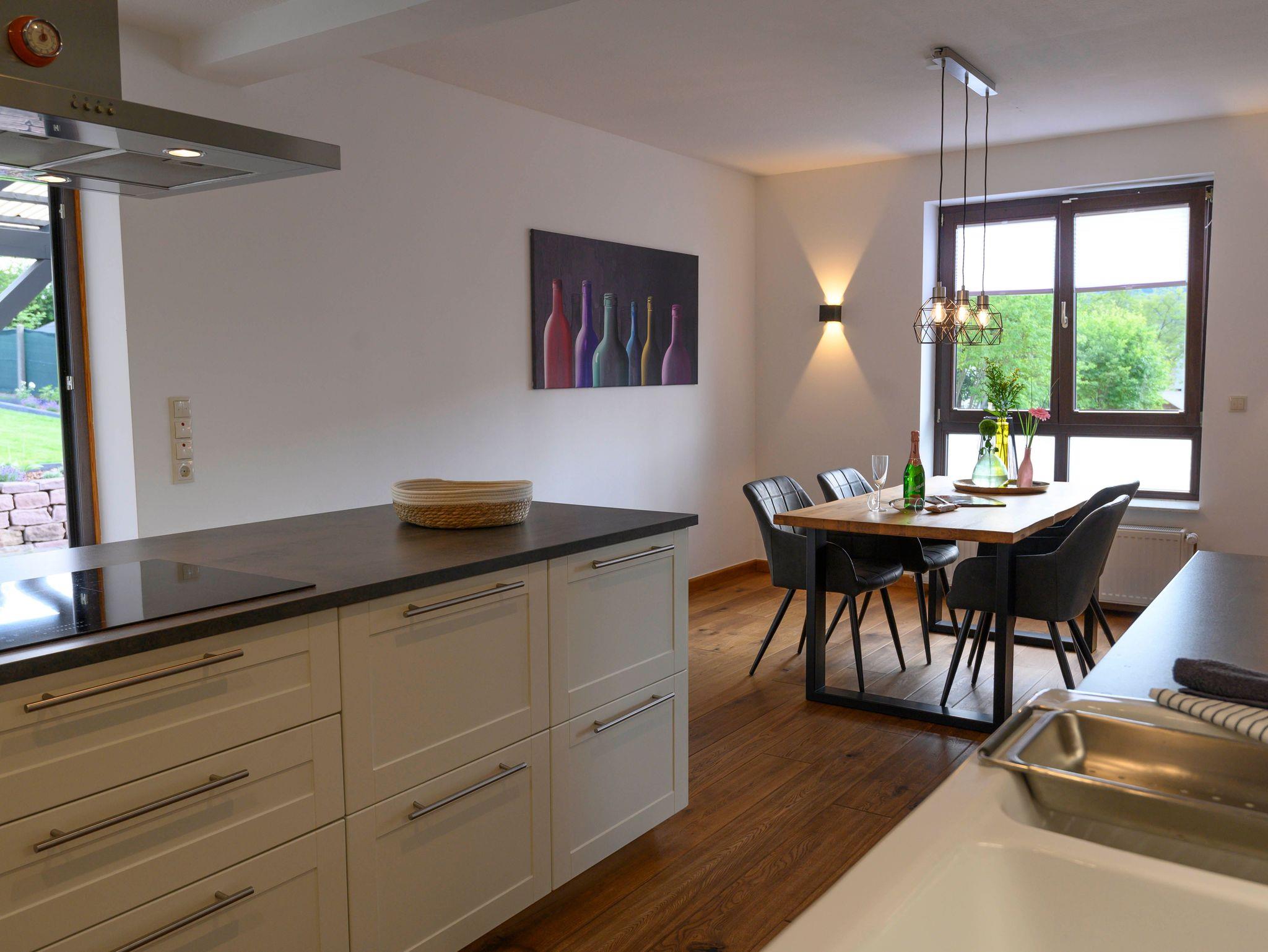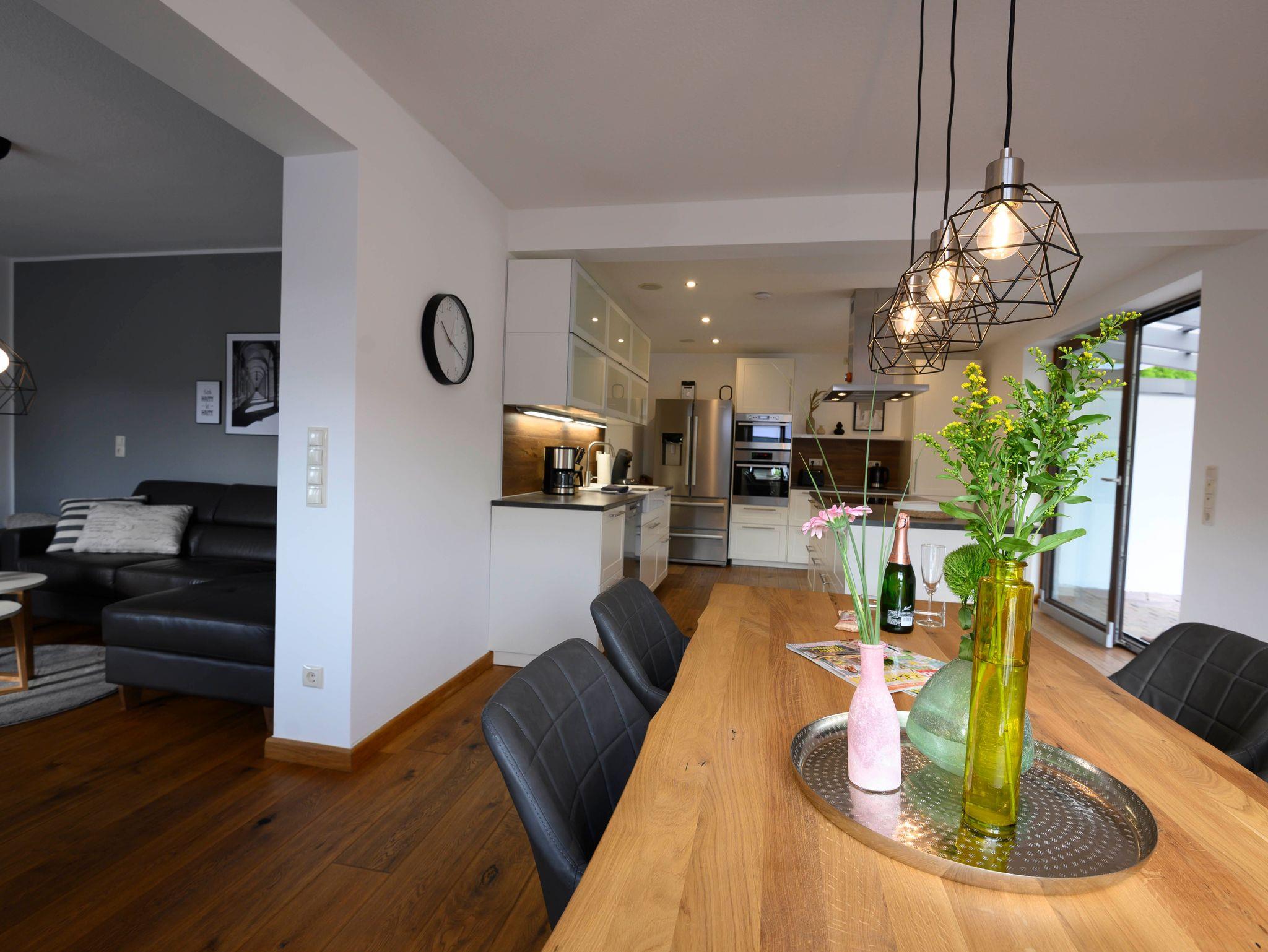 Das Wohn- und Esszimmer ist offen und freundlich gestaltet. Mit dem Pelletofen kommt die richtige Stimmung auf. Auf unserem 50 Zoll großen Fernseher bleibt auch kein Filmabend aus.