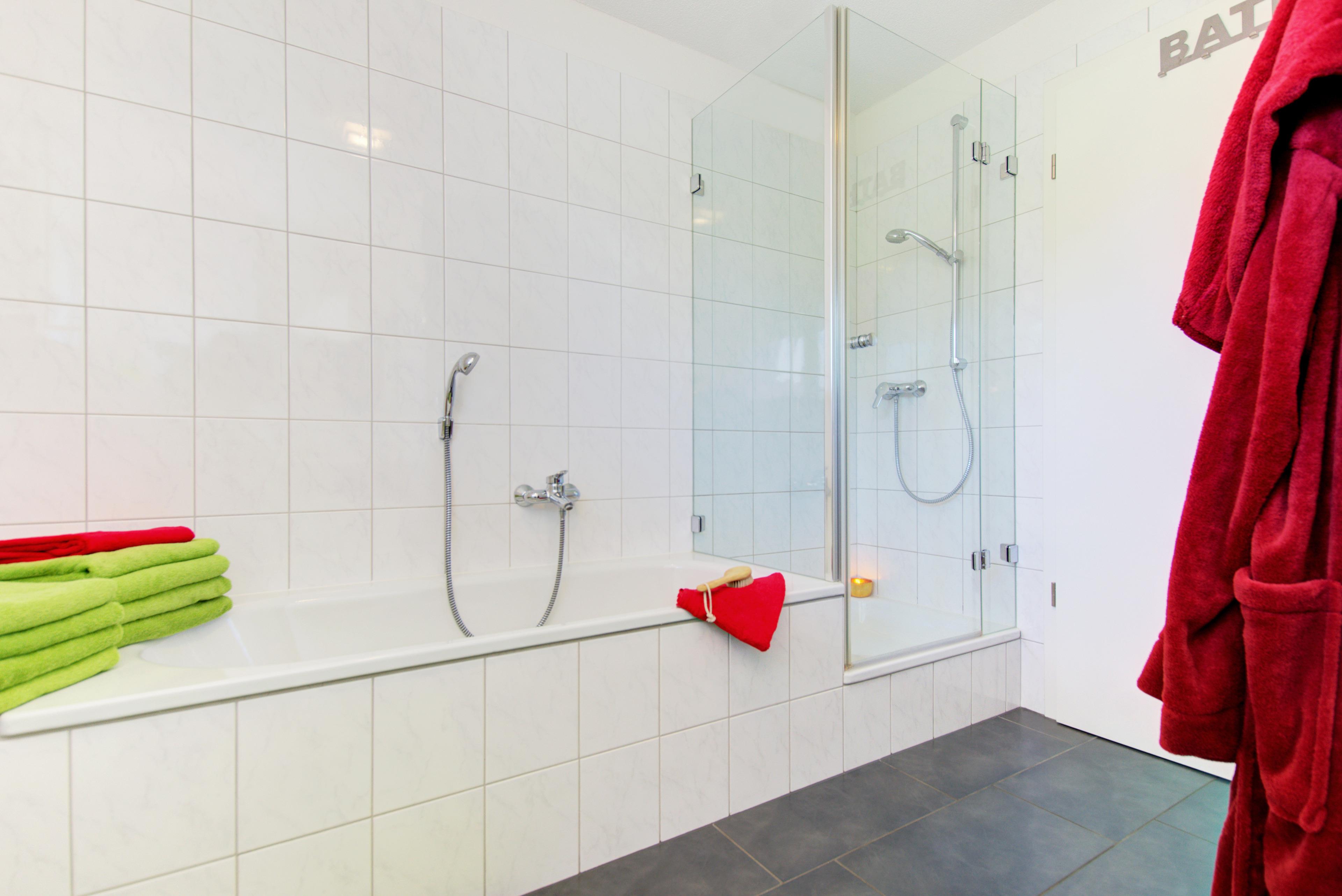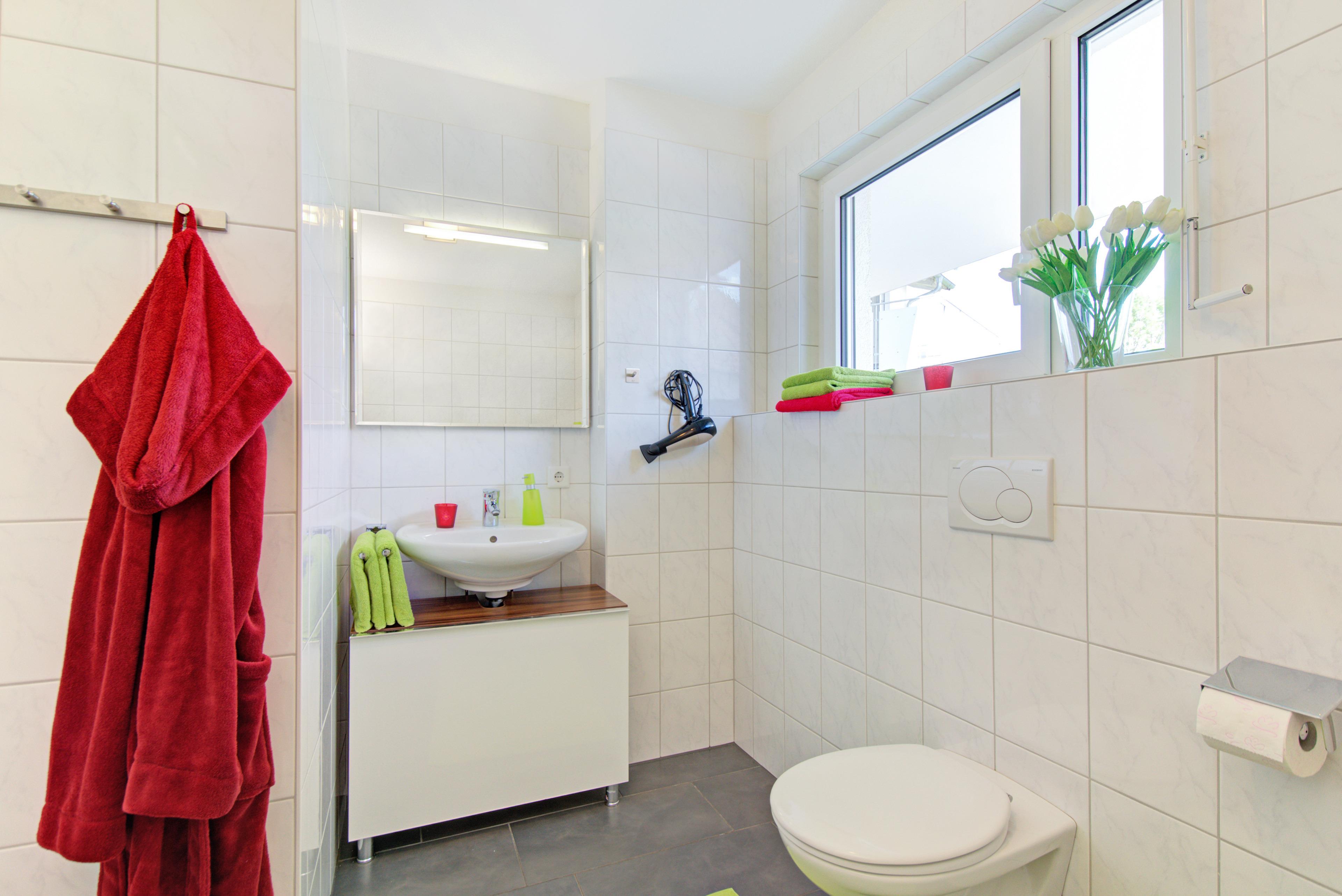Das moderne Tageslichtbad verfügt über eine Badewanne, separate Dusche (90x90) und WC. Es steht Ihnen ein weiteres separates Gäste-WC und Abstellraum mit Hauswirtschaftsutensilien zu Verfügung. Im Keller der Anlage können Sie Ihre Wäsche gegen Gebühr waschen und trocknen.