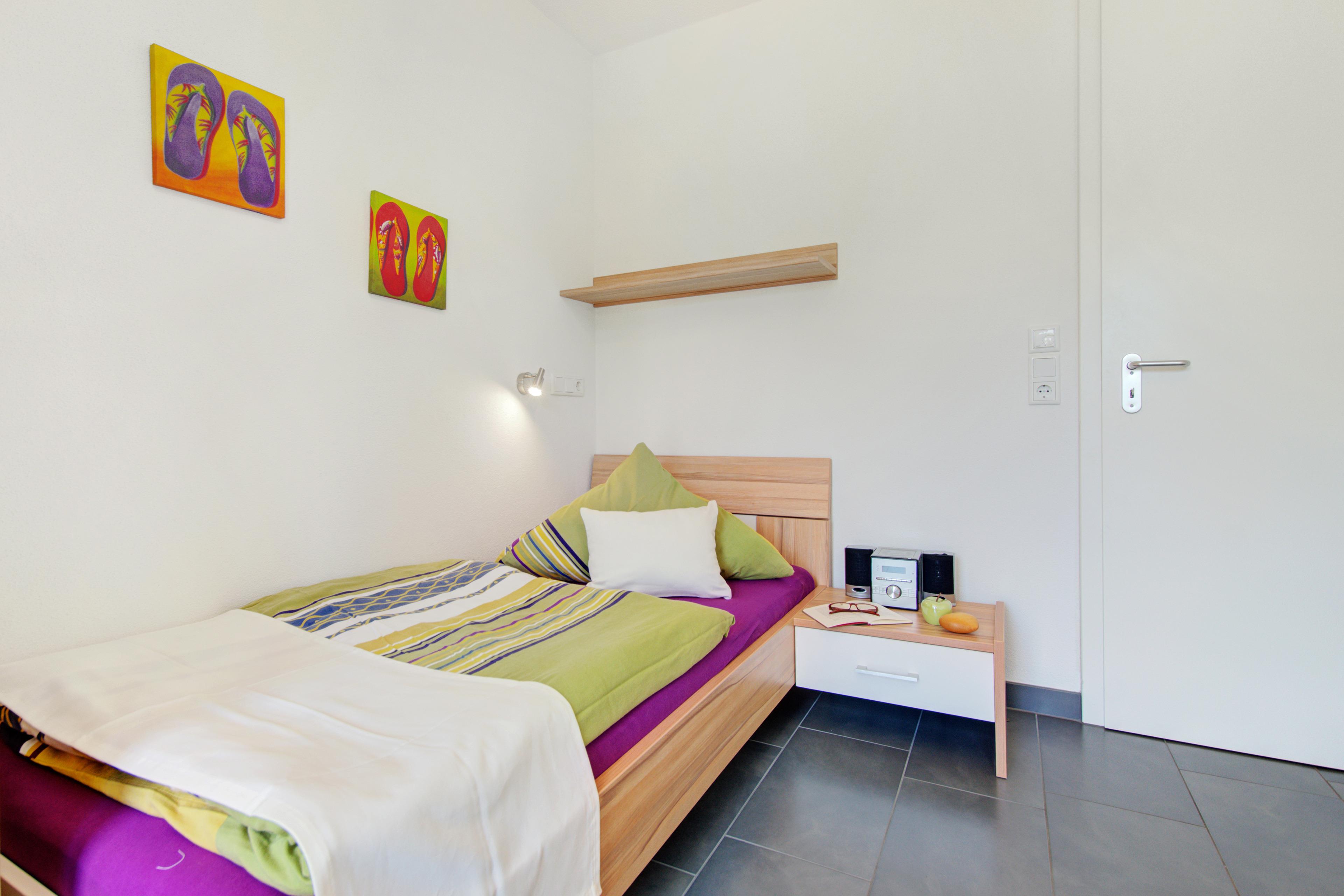 In zwei komfortablen Einzelbetten (90x180) finden Sie hier angenehmen Schlaf. Außerdem: Kleiderschrank, Fenster mit Insektenschutzgitter und Tür zum großen Hochparterre-Balkon, jeweils LED-Leselampe, Kinderbücher und einen CD-Spieler.