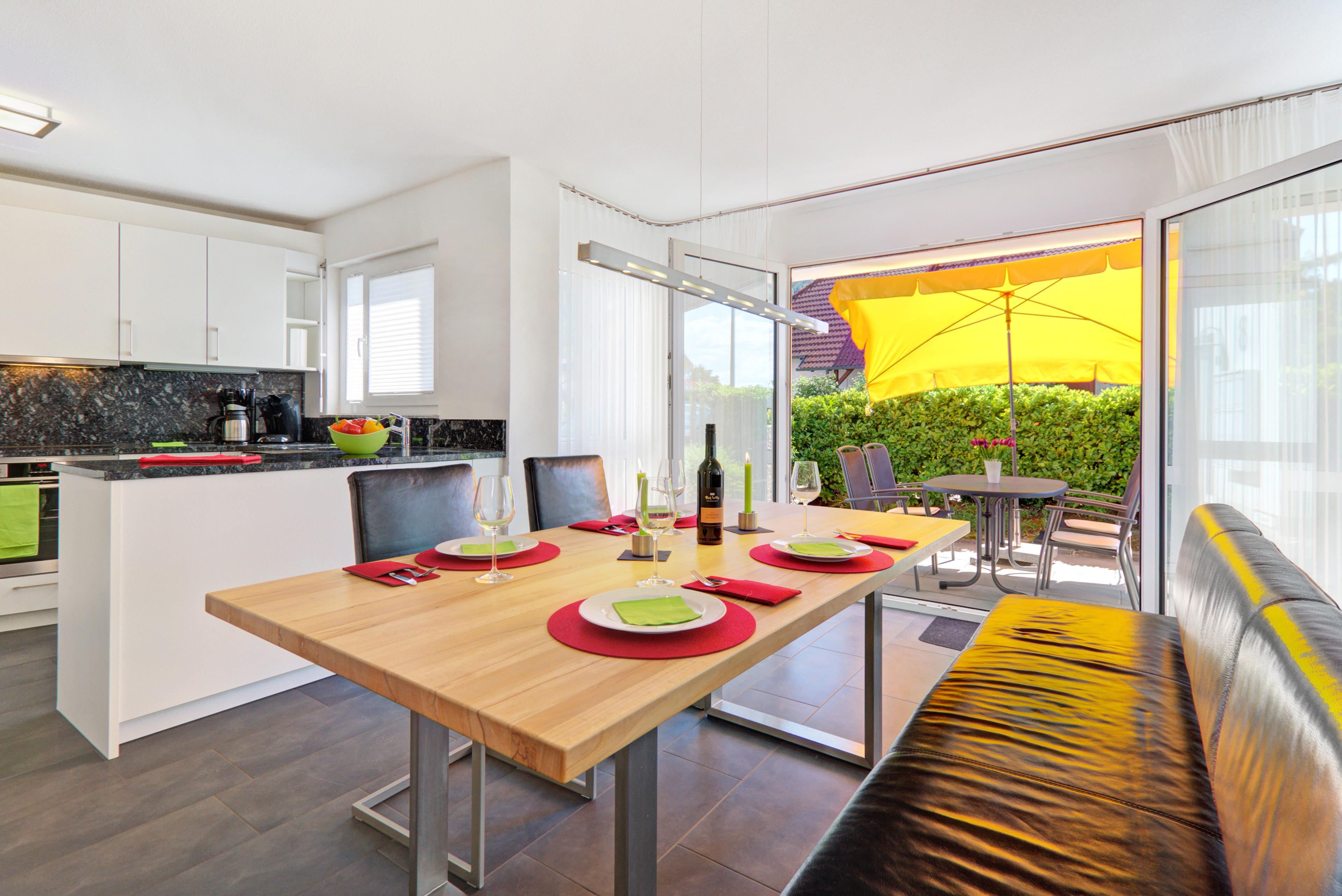 Für Ihre Urlaubsküche finden Sie alles was Sie brauchen: Moderne Einbauküche mit Induktionsherd, superleise Spülmaschine, Backofen, Eierkocher, Kühlgefrierschrank, Edelstahlspüle, Granitarbeitsplatte, Geschirr, Rührgerät, Toaster, Senseo-Kaffeeautomat, Kaffeemaschine (gemahlener Kaffee) ,Wasserkocher u.v.m.