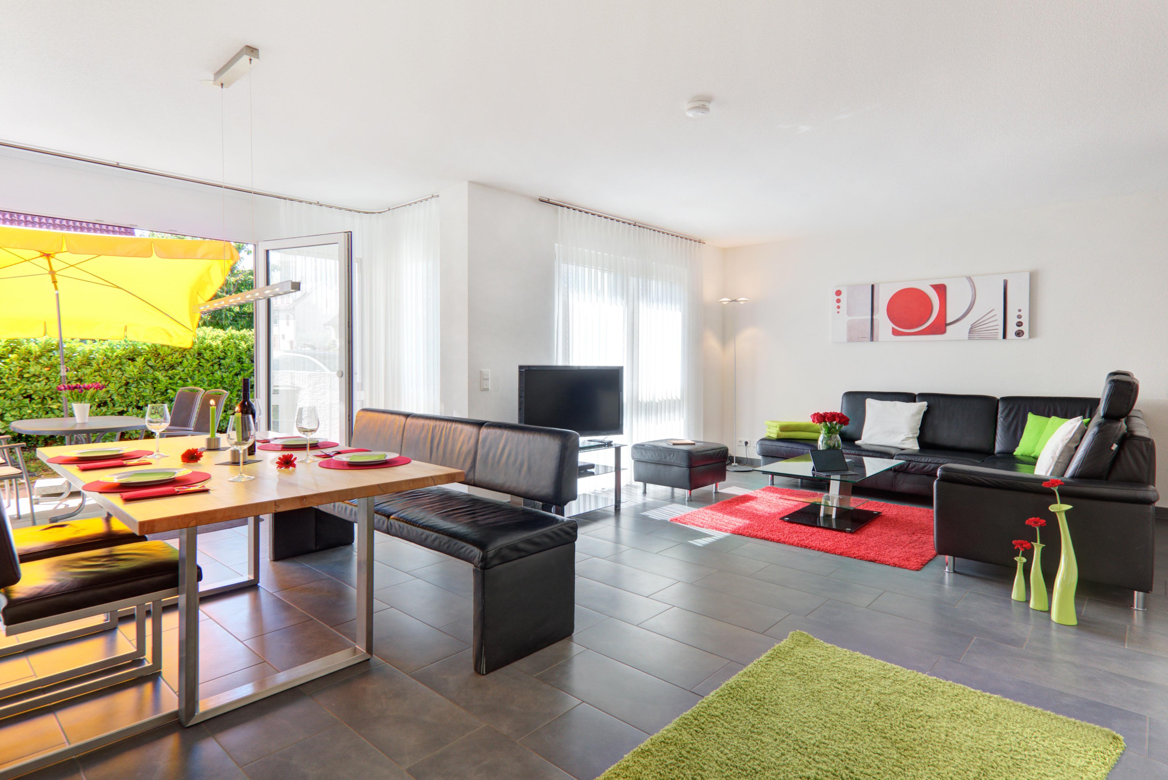Im hellen Wohnzimmer finden Sie eine gemütliche Couchgarnitur, 3 bequeme Freischwinger-Lederstühle und eine Lederbank mit Rückenlehne. und den Medienbereich mit TV, DVD-Player, Hifi-Anlage, Spielesammlung und Bücherauswahl. Im gesamten Feriendomizil beziehen Sie Gratis-WLan. Der offene Essbereich mit Blick auf Terrasse lädt ein für gesellige Stunden.